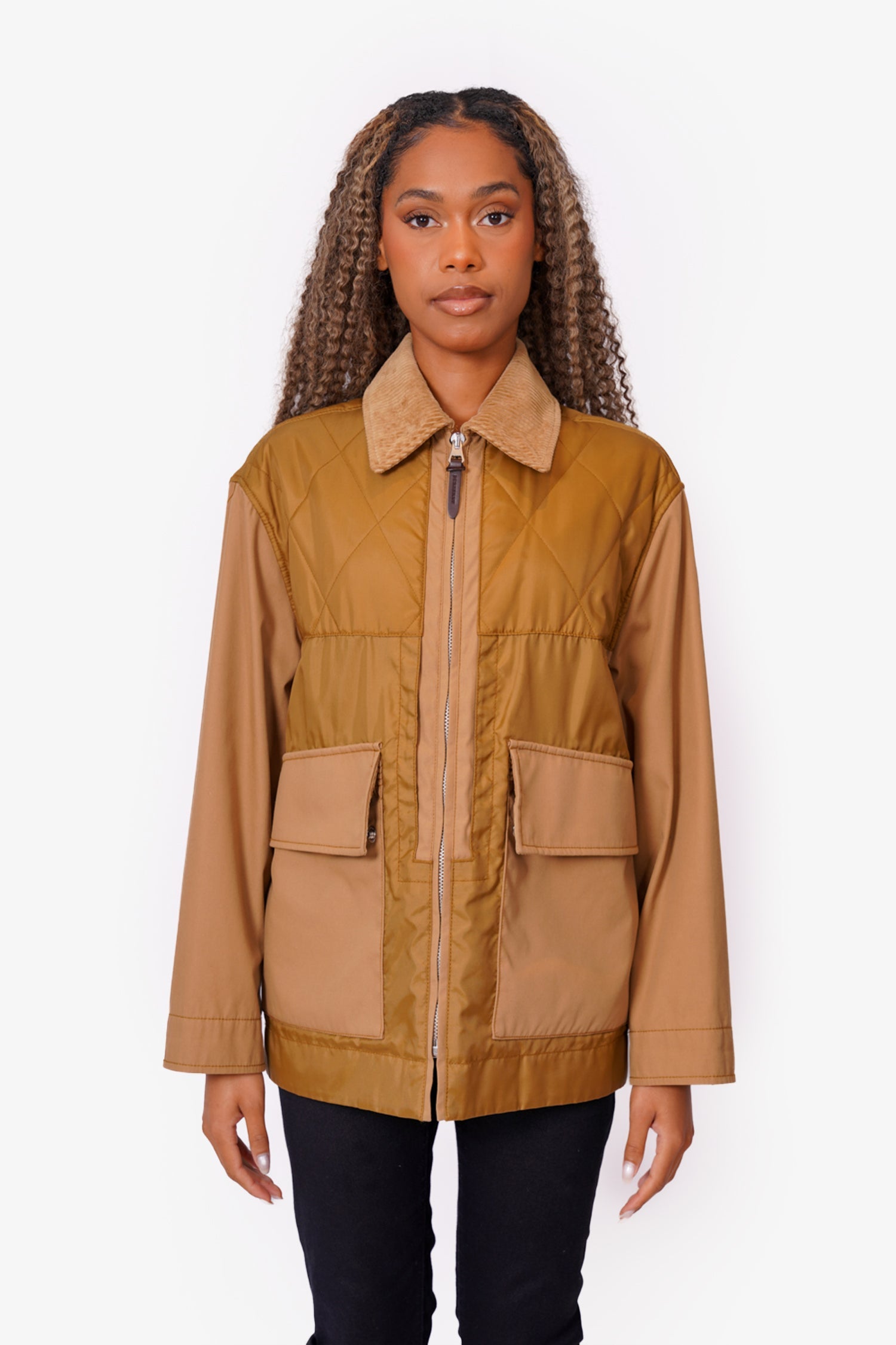 Refresh availabilityBurberry Brown Quilted Nylon Jacket. Collared neckline. Front zip closure. Front pockets with flap and snap closure. Snap detail on cuffs. Lined. Tonal stitching.