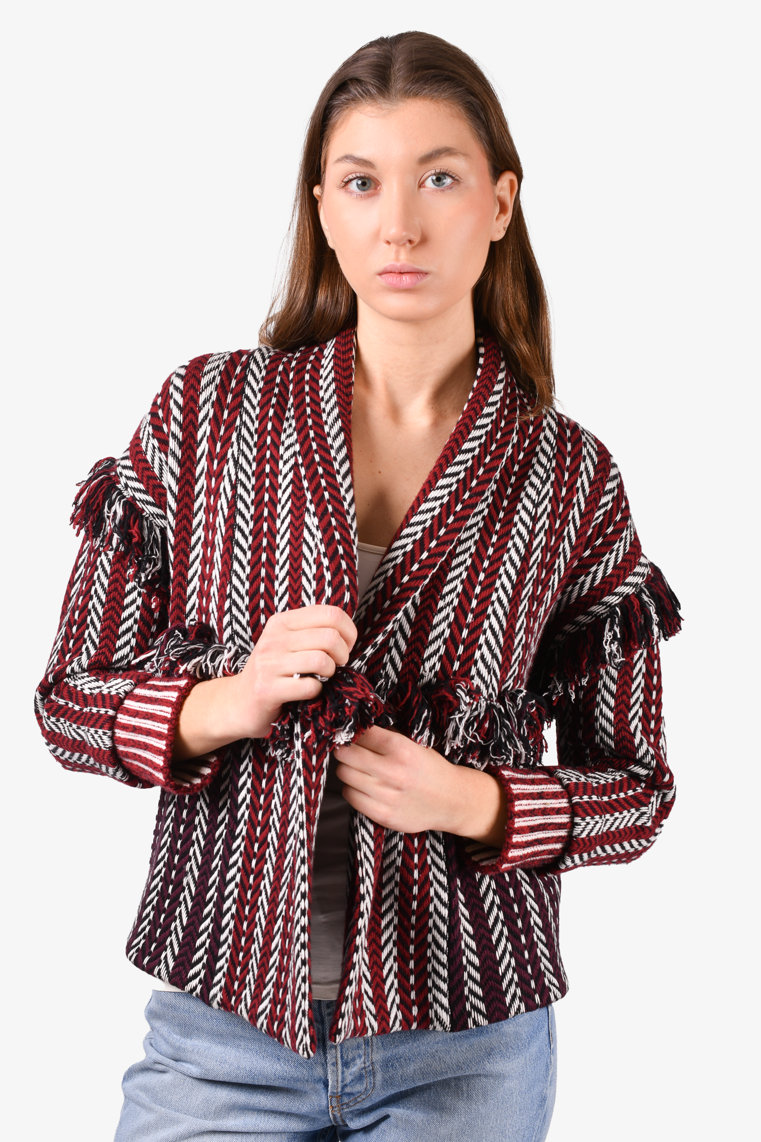 Refresh availabilityBurberry Burgundy/White Printed Fringe-Trimmed Jacket. Open front. Heavyweight. Tonal stitching.