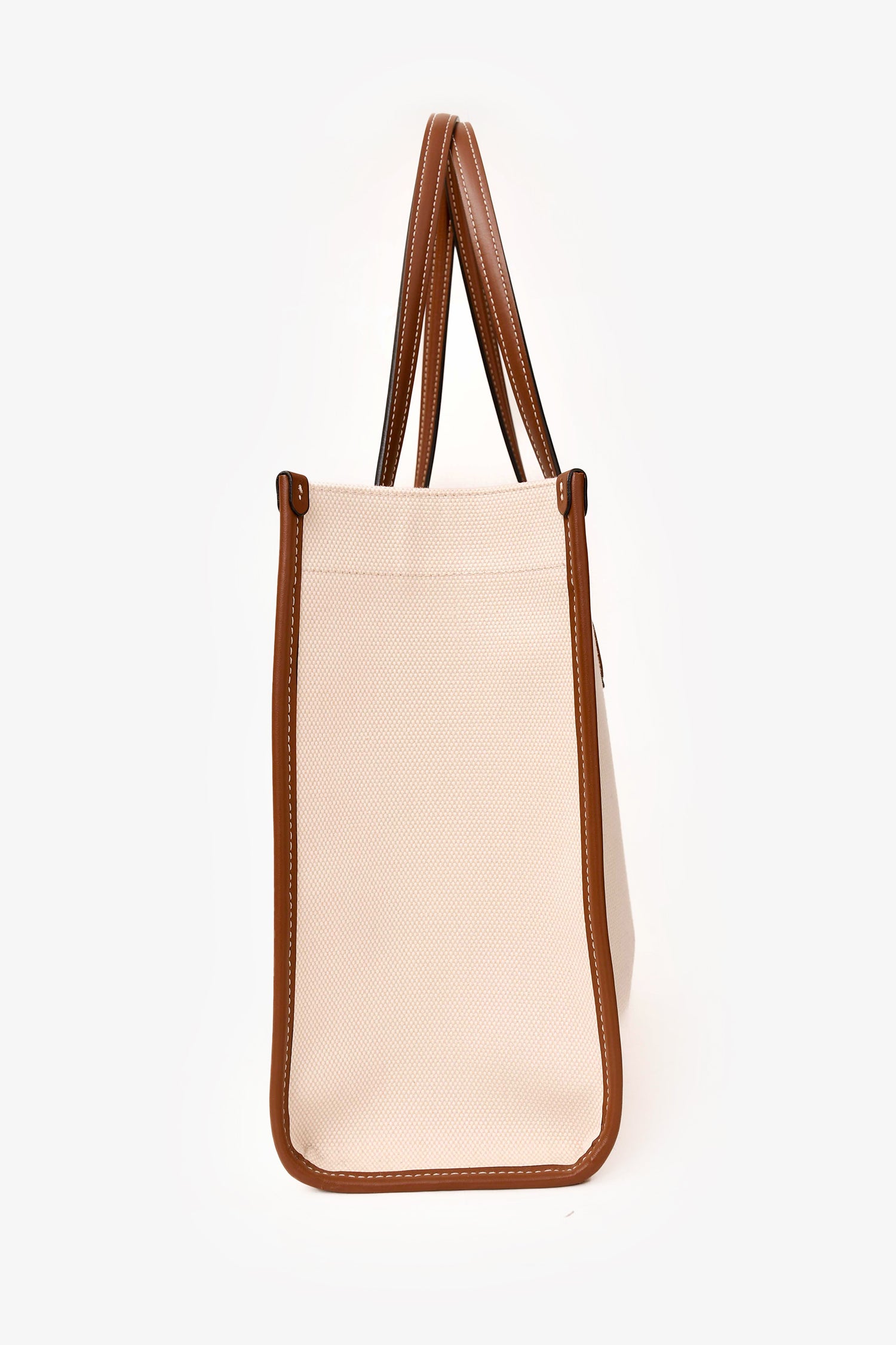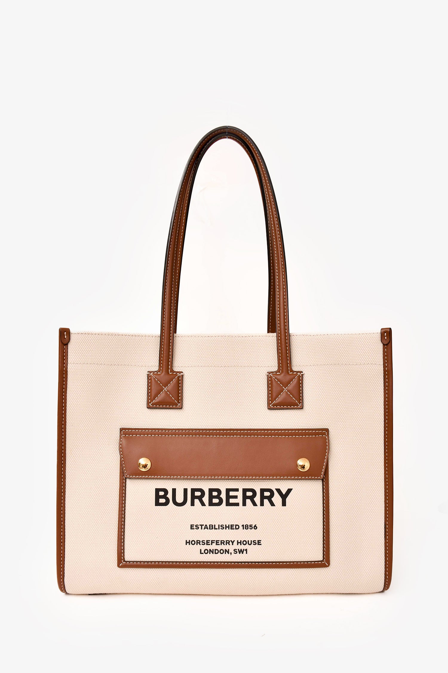 Refresh availabilityBurberry Cream/Brown Canvas/Leather Small Freya Tote Bag. Top strap closure with snap-button. Dual shoulder straps. Single exterior slip pocket with magnetic closure. Single interior zip pocket. Gold-toned hardware. Tonal and contrast stitching.