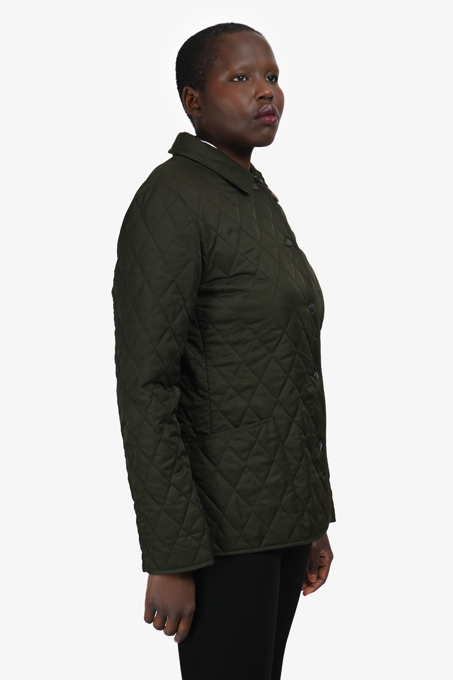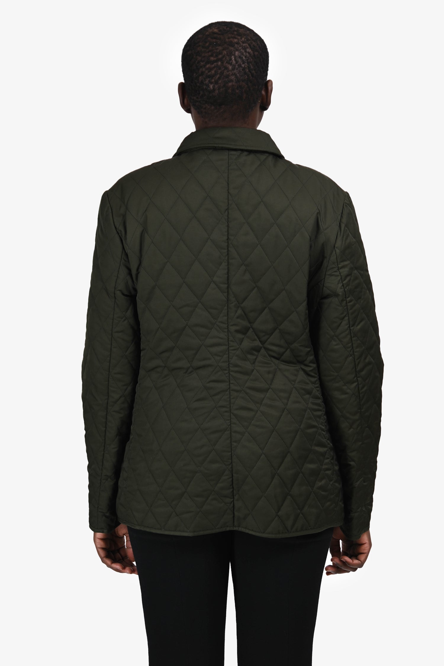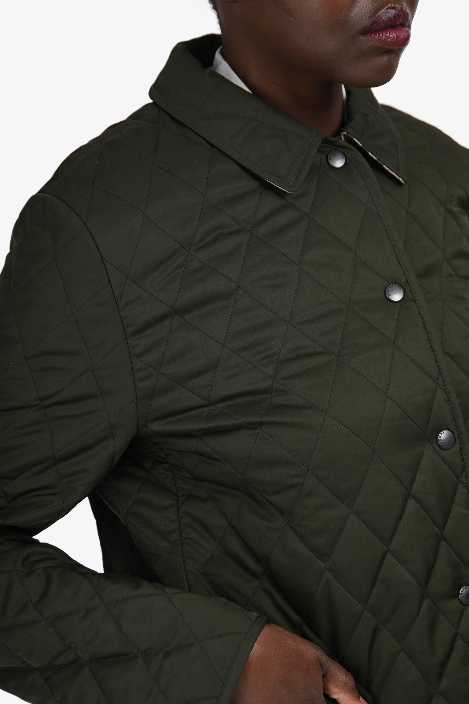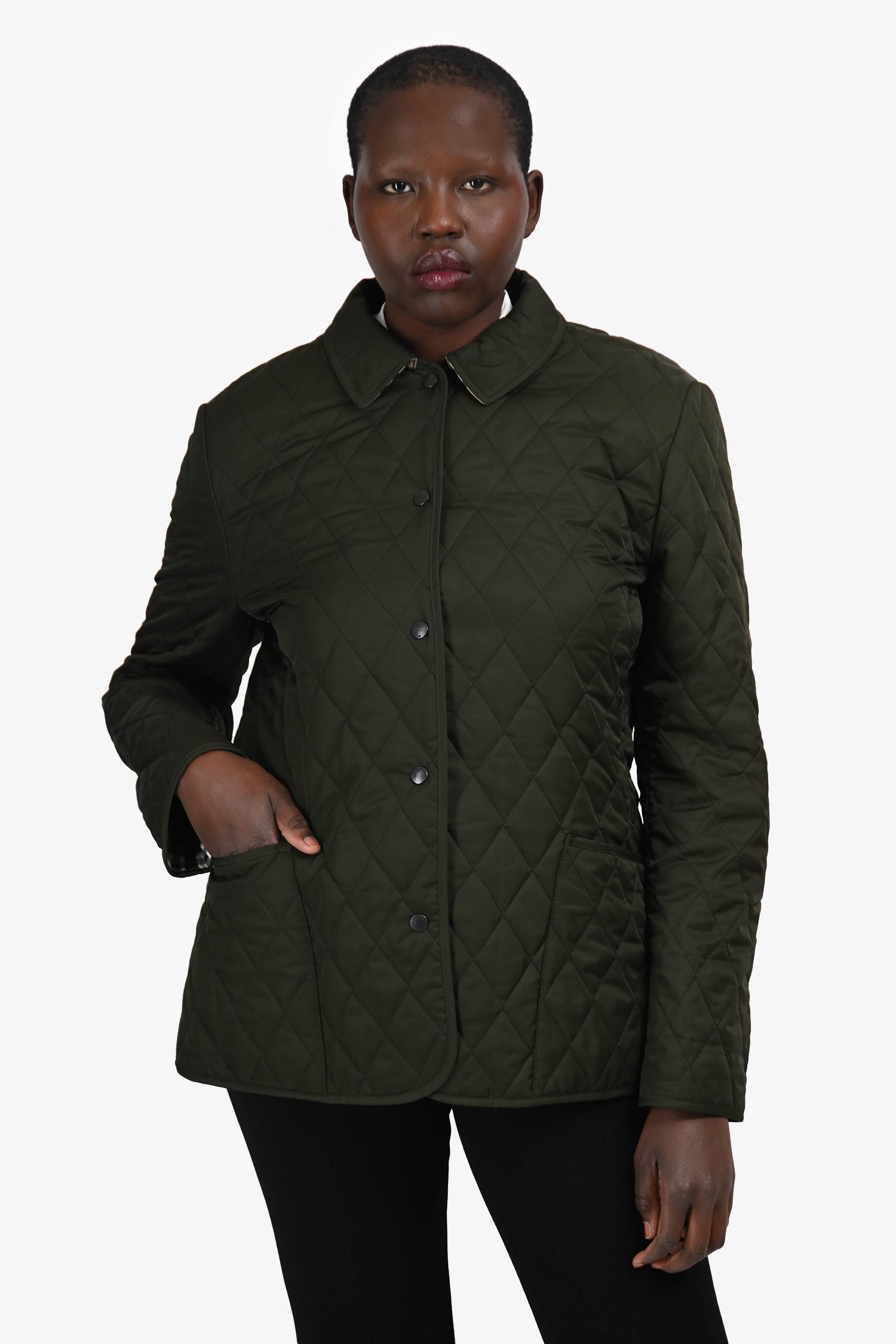 Refresh availabilityBurberry Dark Green Quilted Check Lined Jacket. Slip-on. Front snap closure. Point collar. 2 exterior slip pockets. Silver-tone hardware. Tonal stitching.