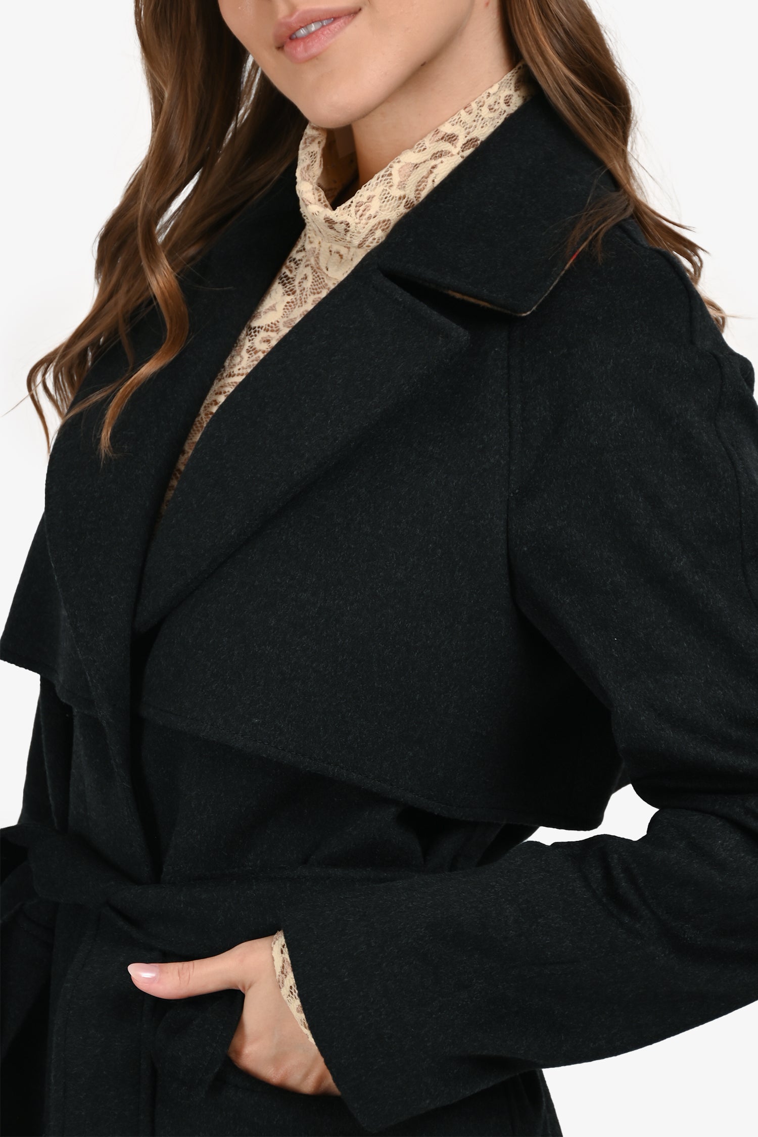 Refresh availabilityBurberry Dark Grey Wool/Cashmere Belted Coat. Slip-on. Front button closure with removable self-tie belt. Notch lapel collar. 2 exterior flap pockets; 1 interior slip pocket. Fully lined. Tonal stitching.