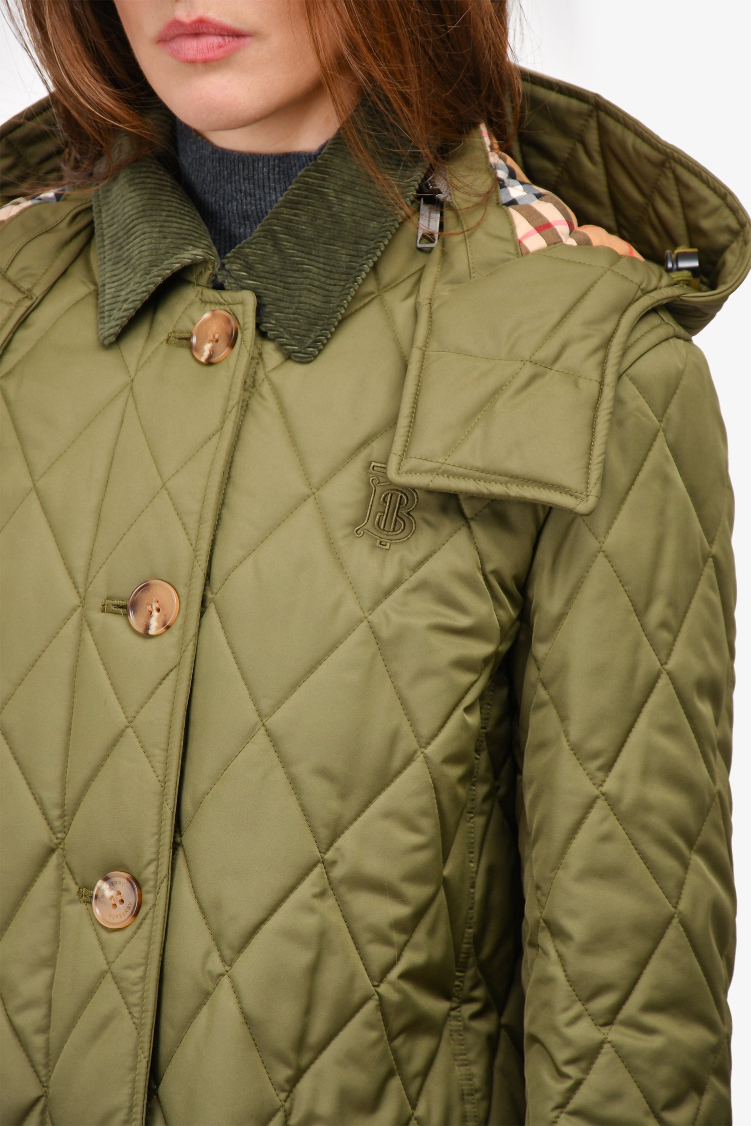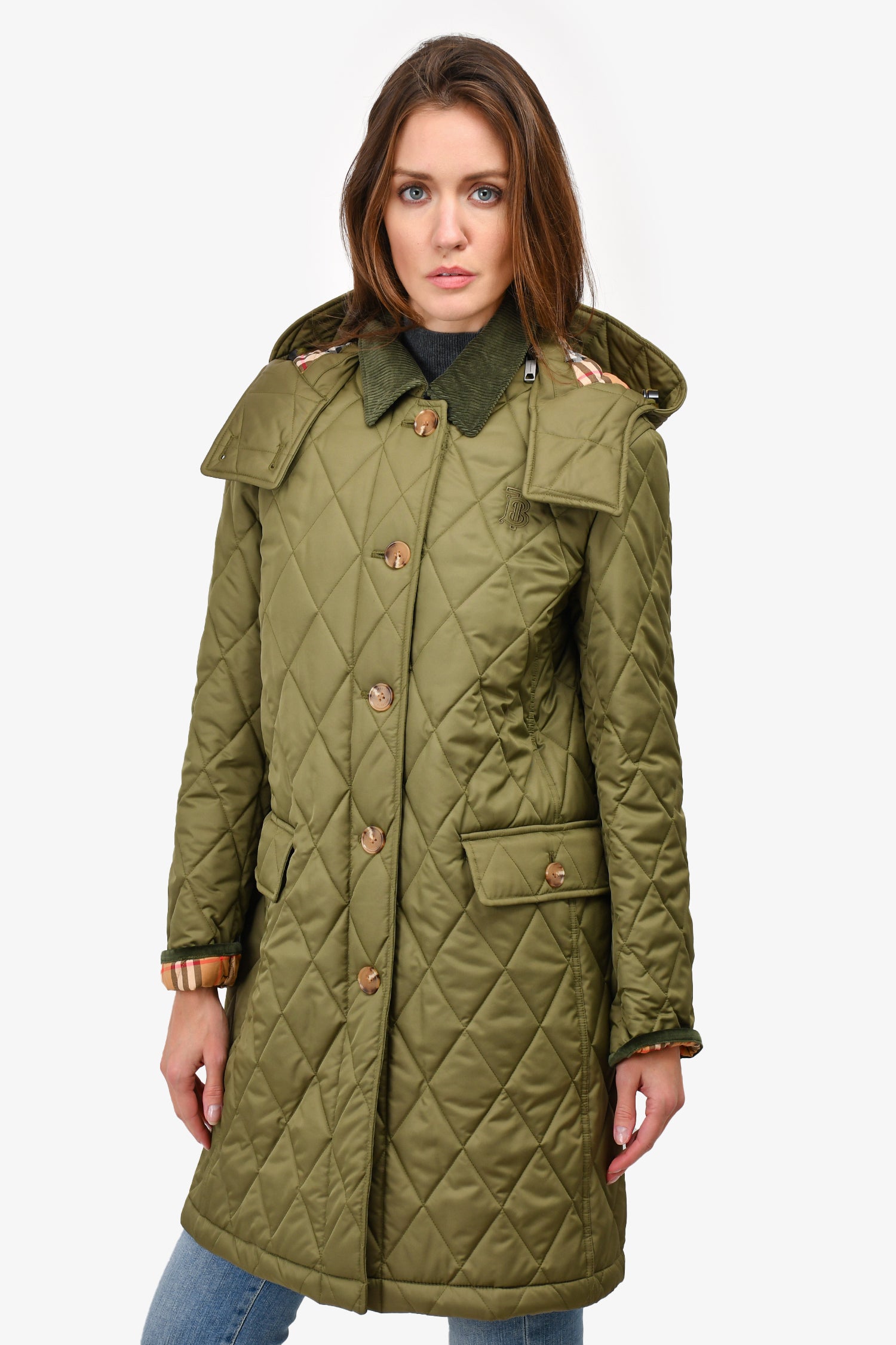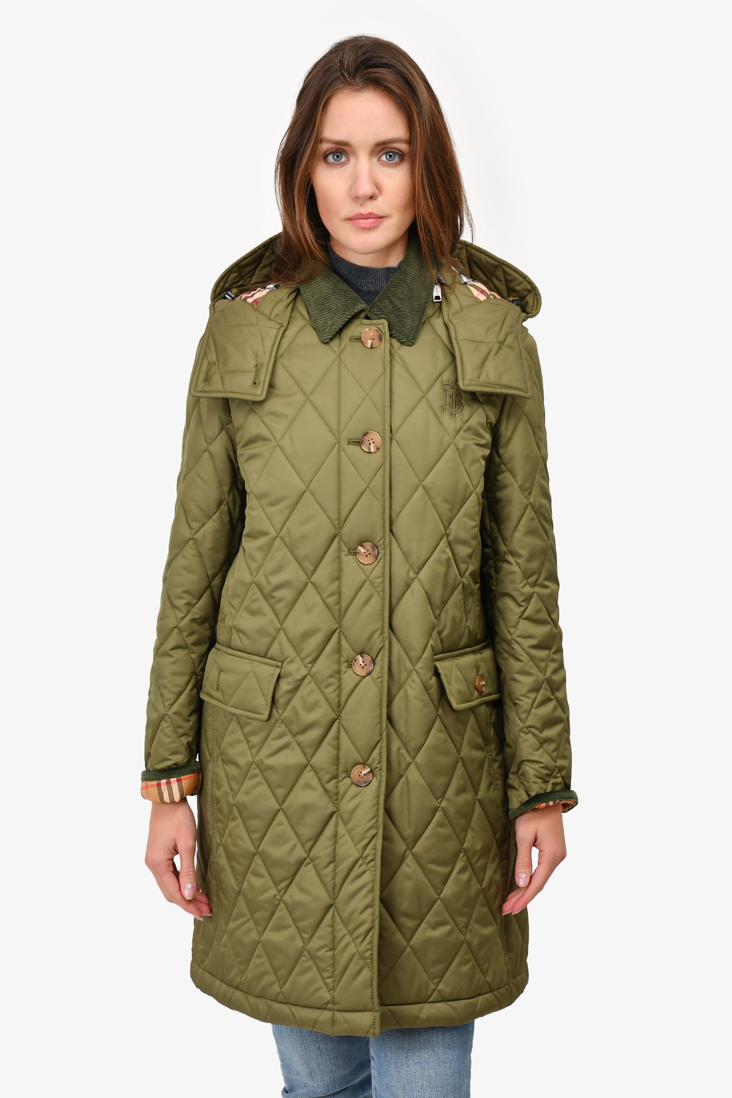 Refresh availabilityBurberry Green Quilted Detachable Hood Button Up Coat. Hood removable zipper. Front button-up closure. Tonal hardware. Two front pockets with button closure. Tonal stitching.