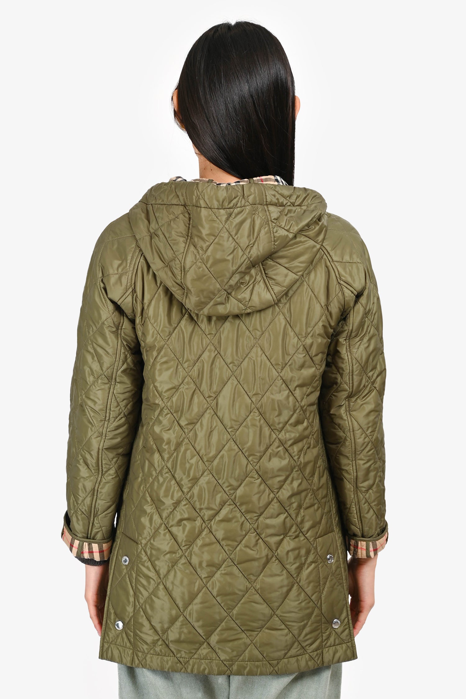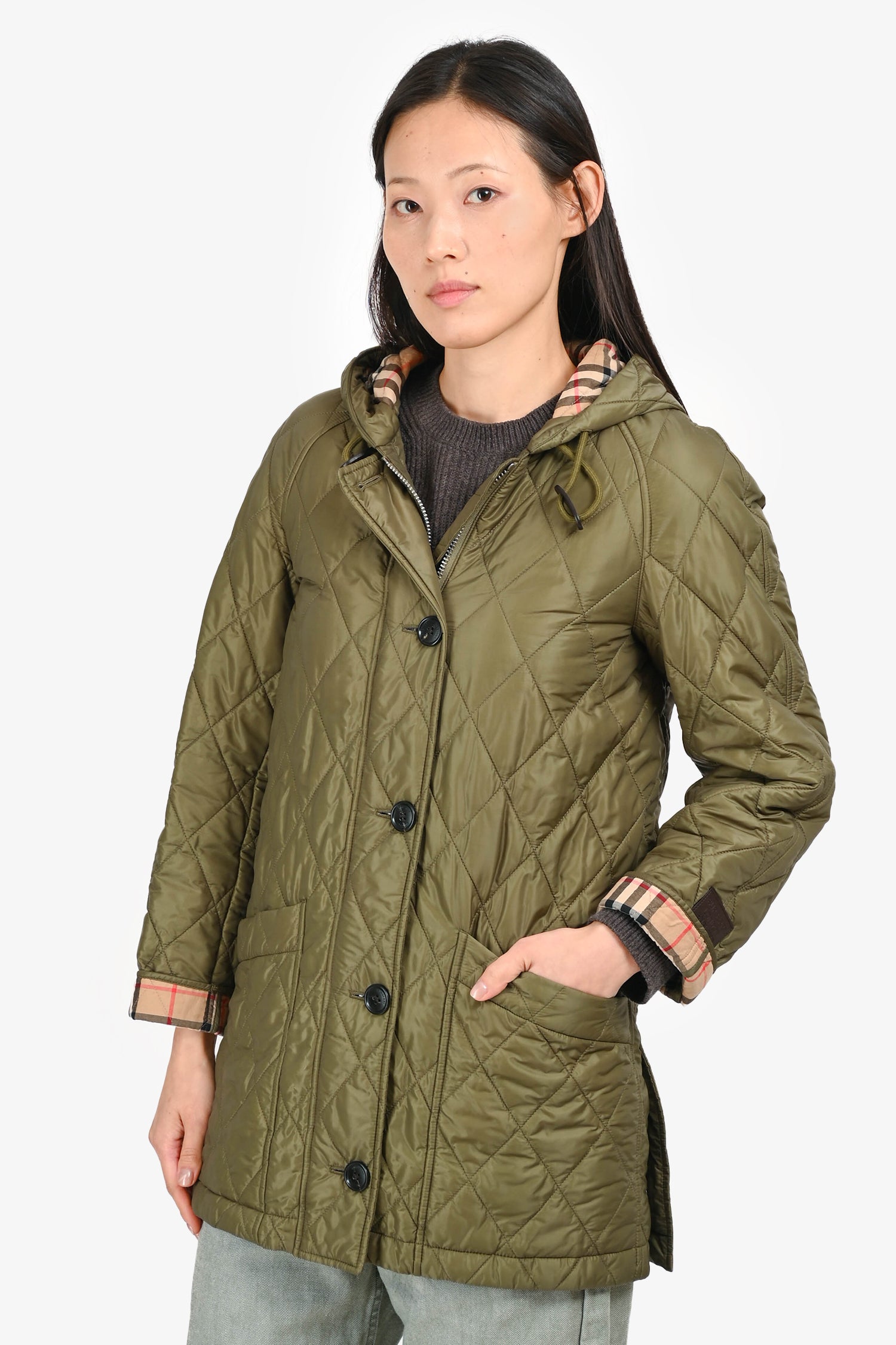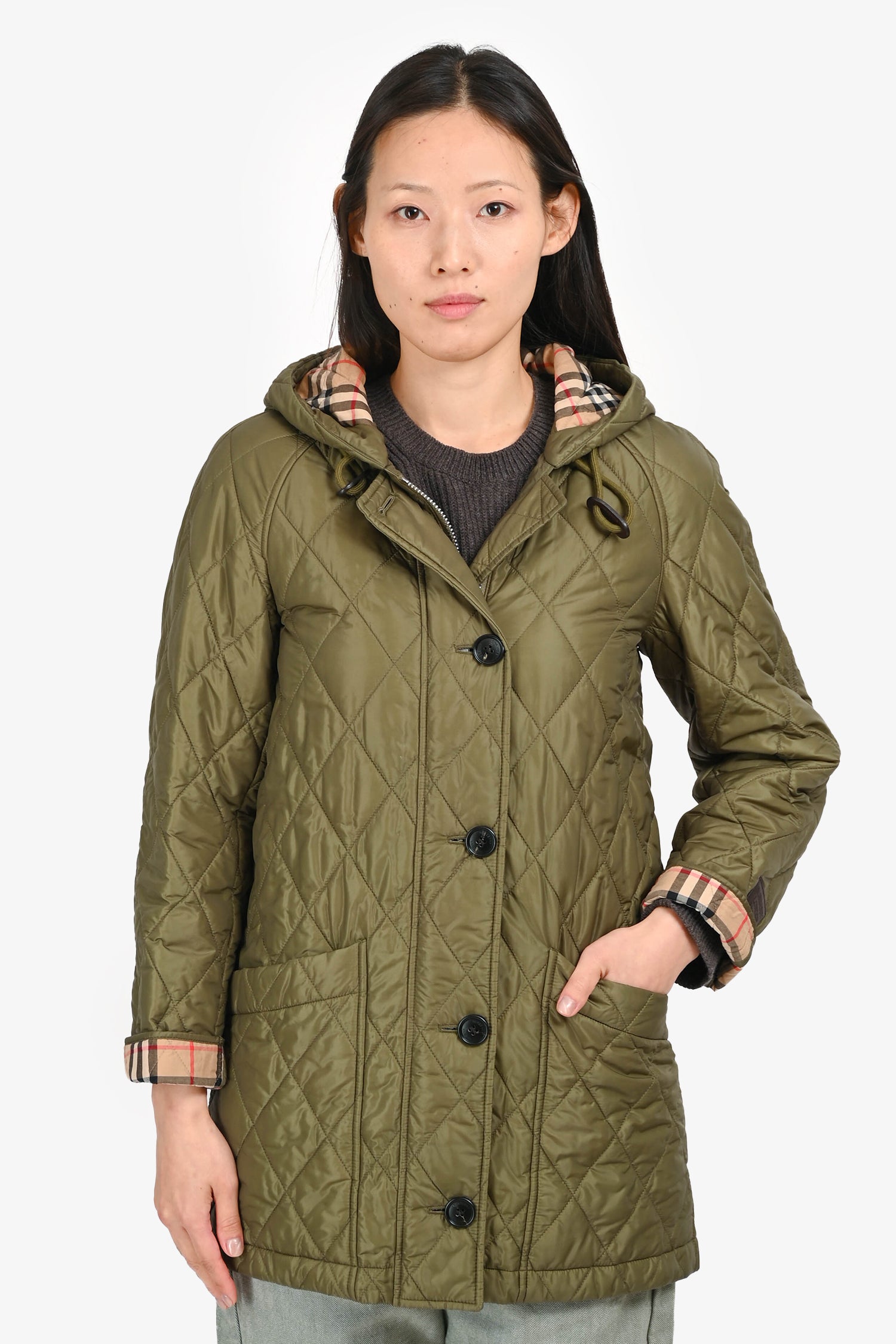 Refresh availabilityBurberry Green Quilted Hooded Coat. Front 2-way zipper and button closure. Adjustable drawstring hood. 2 front slip pockets. Snap button detail in the rear. Leather logo detail on left cuff. Silver-tone hardware. Tonal stitching.