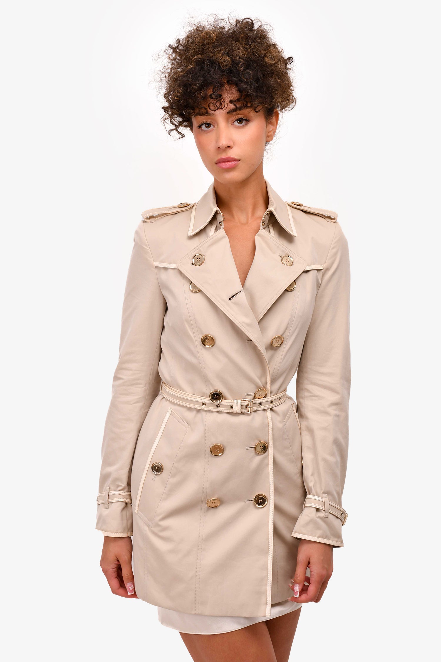 Burberry Greige Leather Trimmed Short Belted Trench Coat Size 2