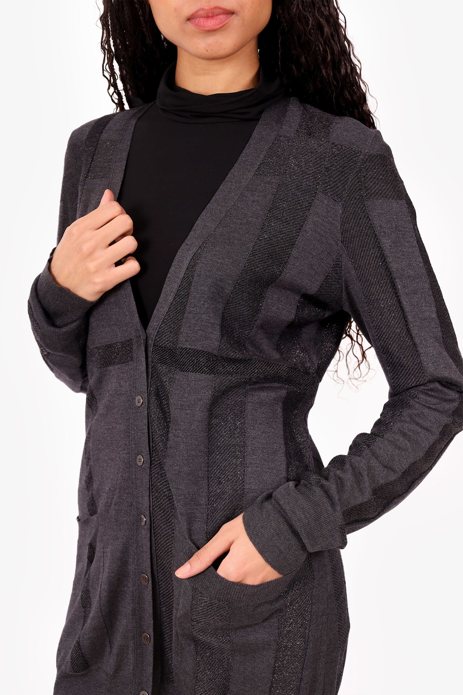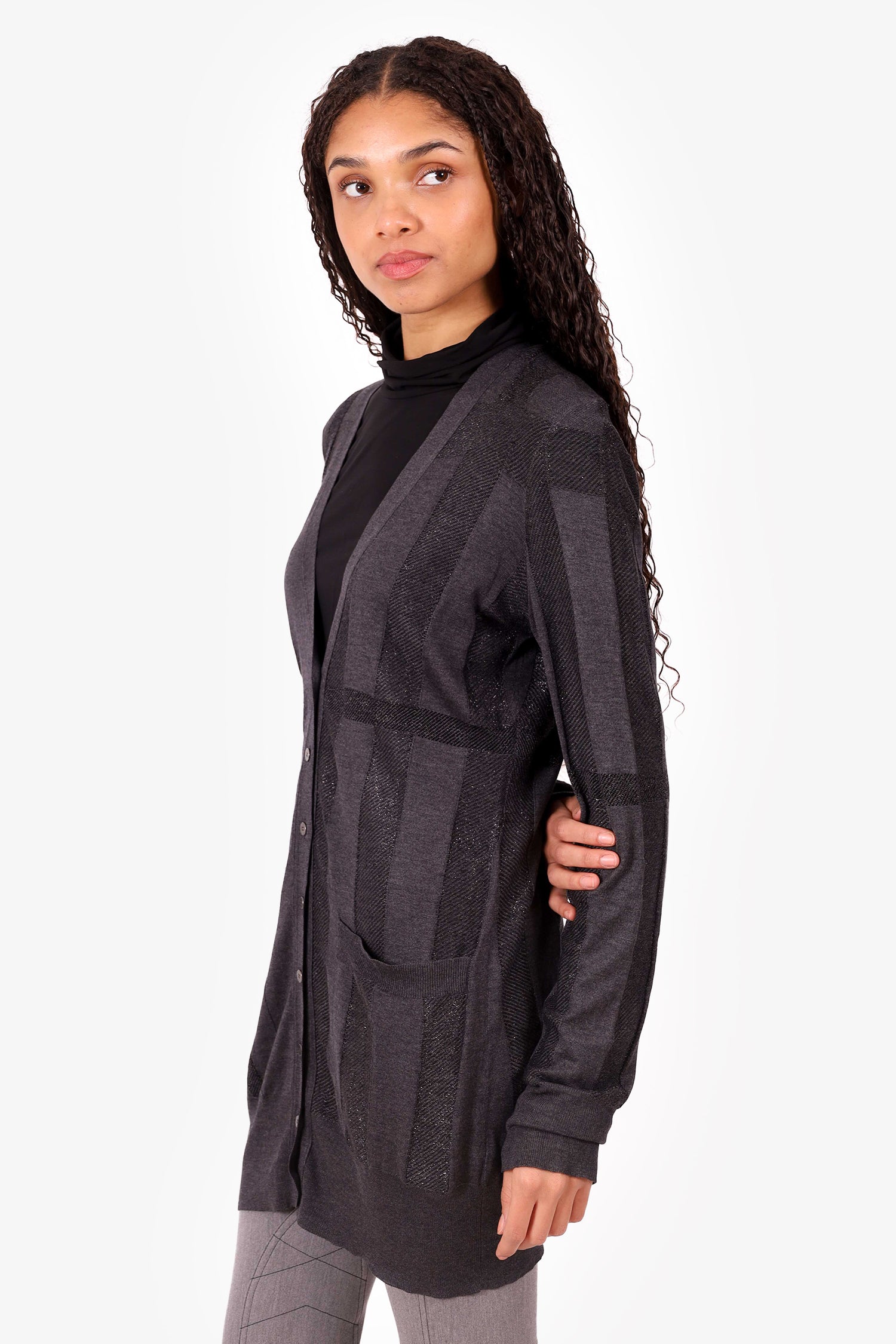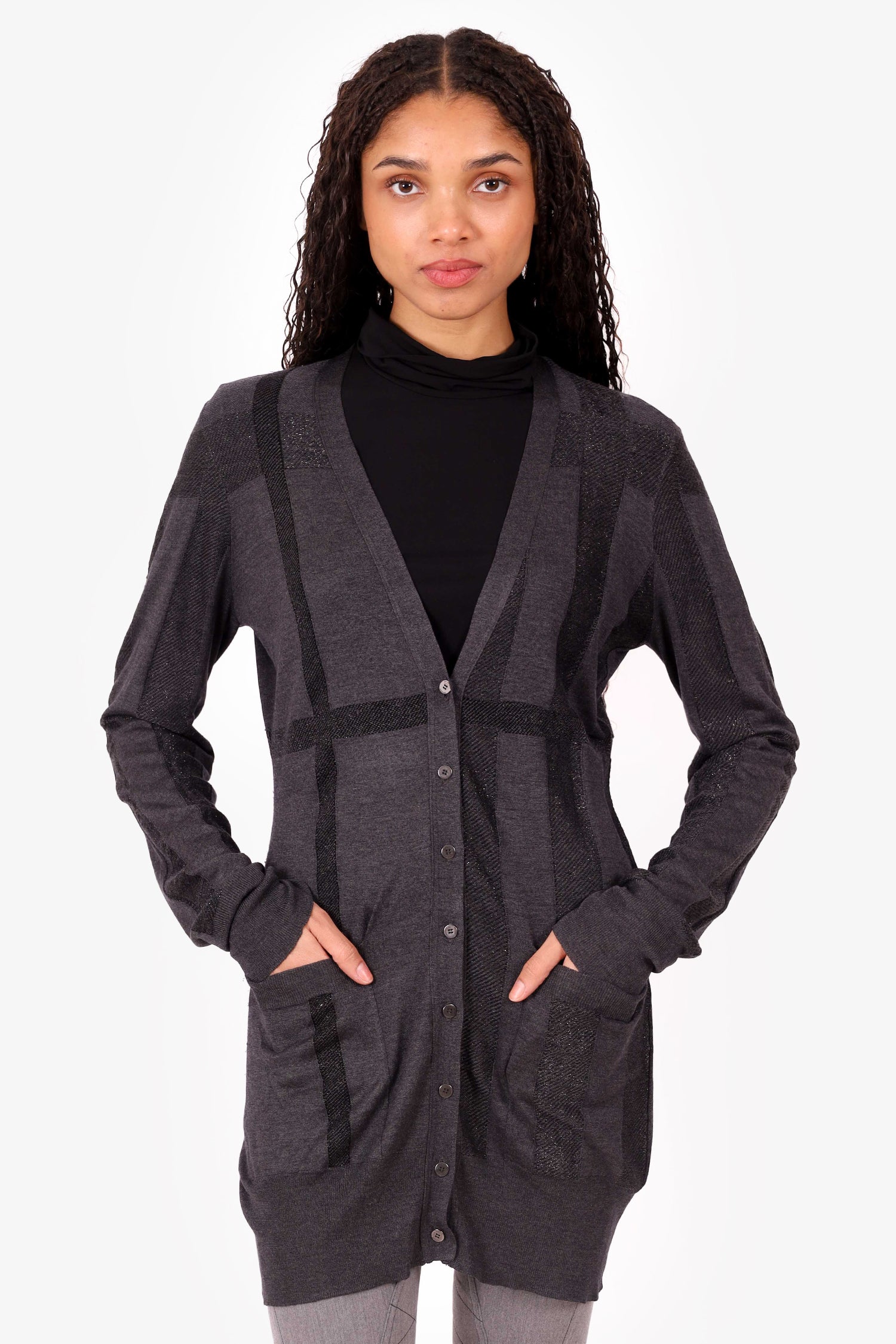 Refresh availabilityBurberry Grey Metallic Silk Knit Long Cardigan. Pull-on. V-neckline. Front button-up closure. 2 exterior front slip pockets. Tonal stitching.