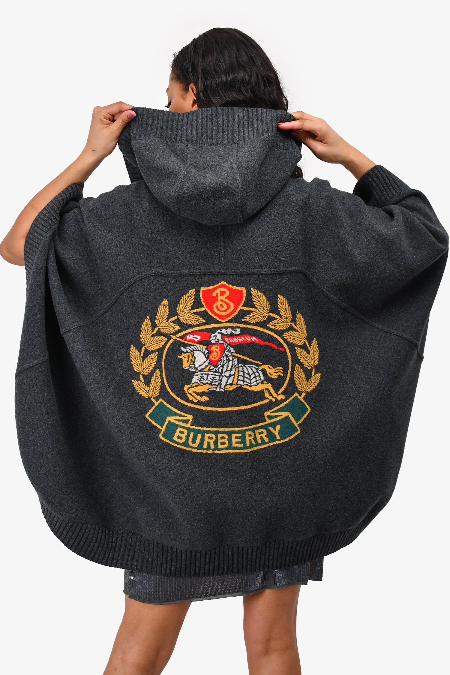 Refresh availabilityBurberry Grey Wool Logo Cape. Open front. Front pockets. Ribbed trims throughout.