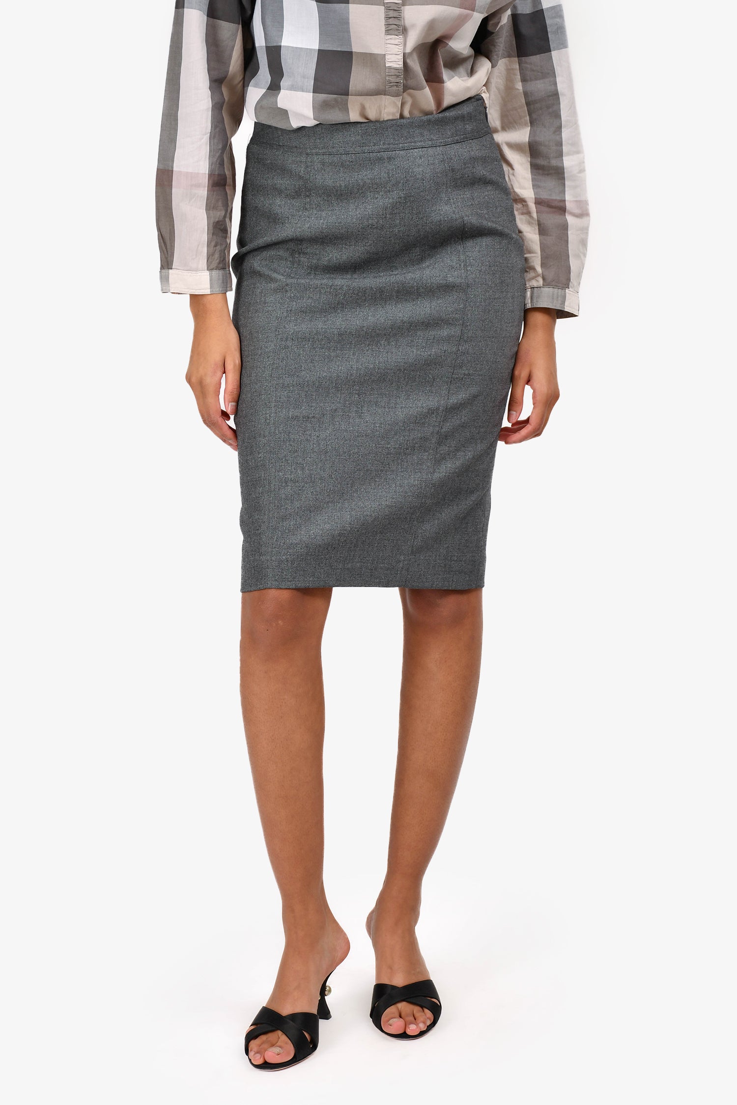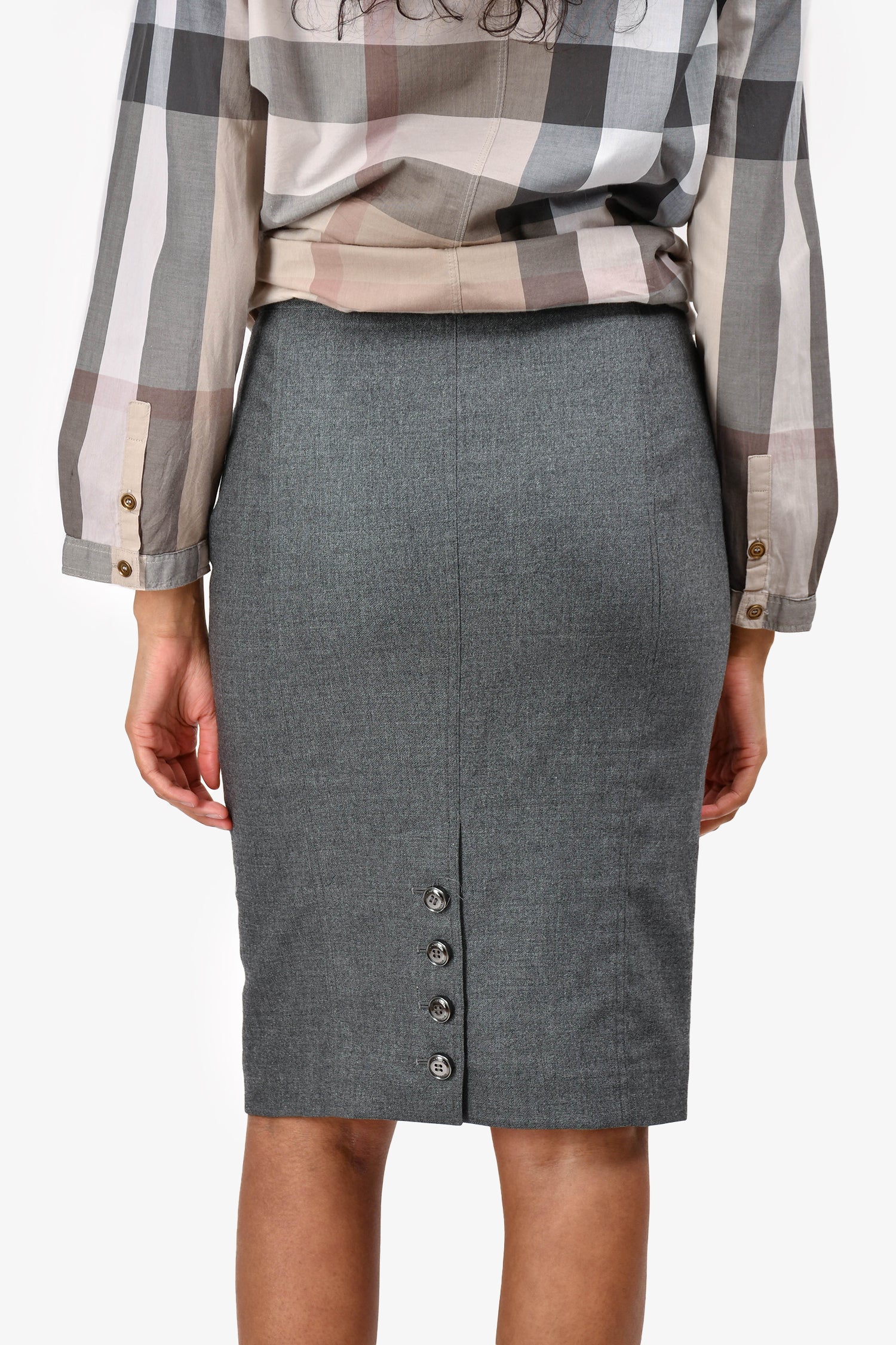 Refresh availabilityBurberry Grey Wool Pencil Skirt. Back bottom button detailing. Side tonal zip-up closure. Fully lined. Tonal stitching.
