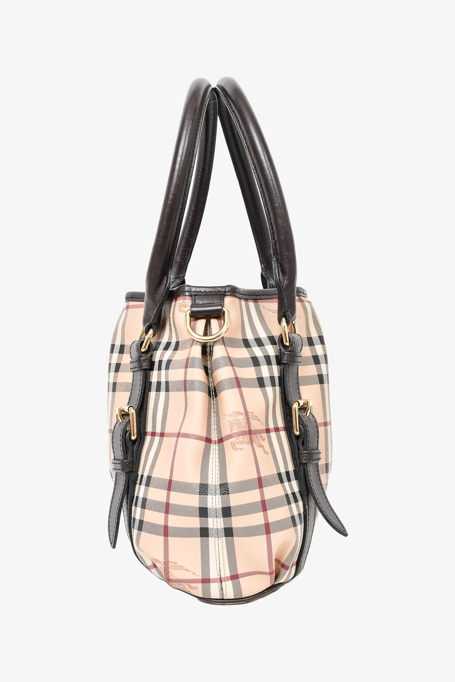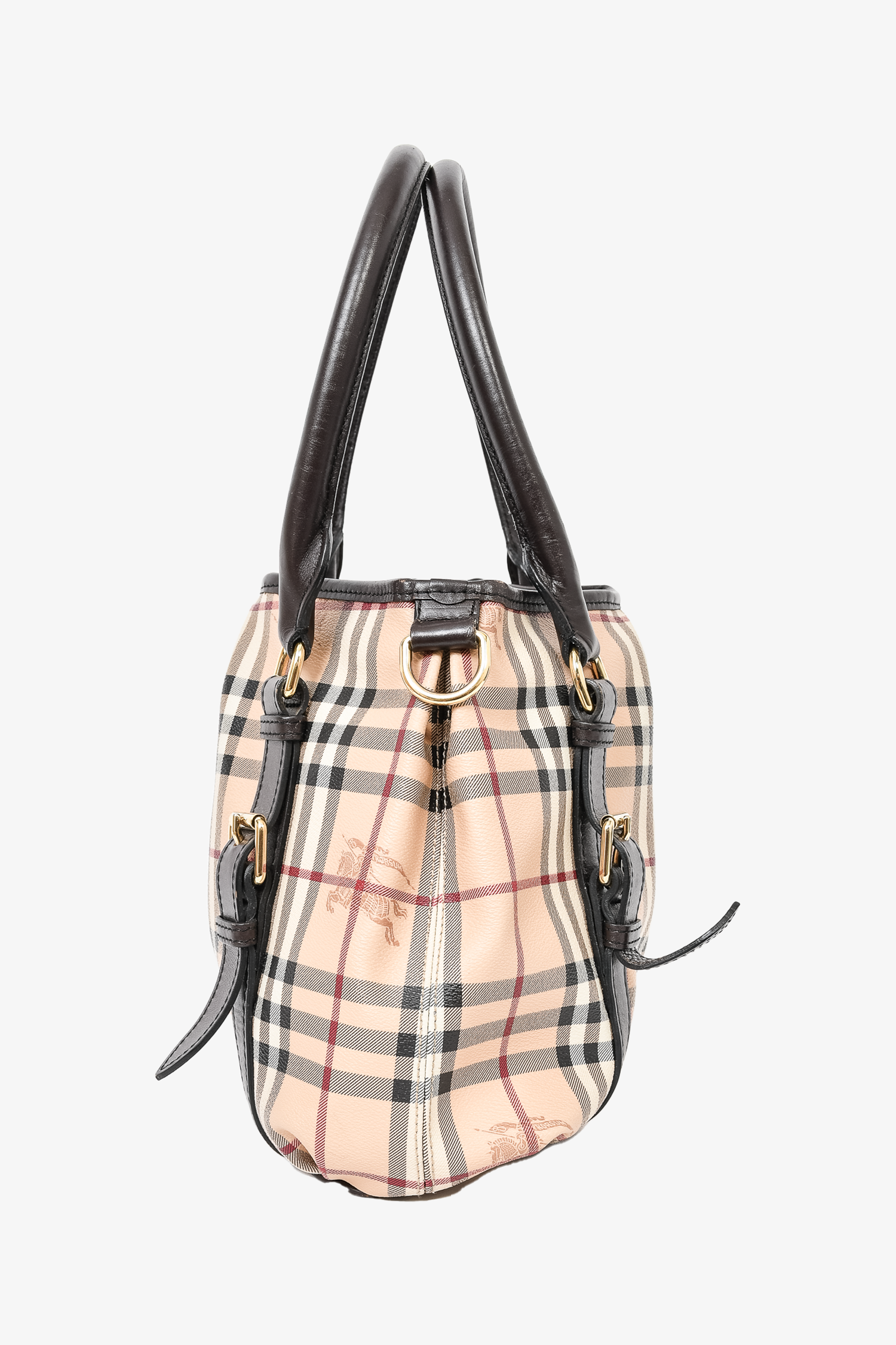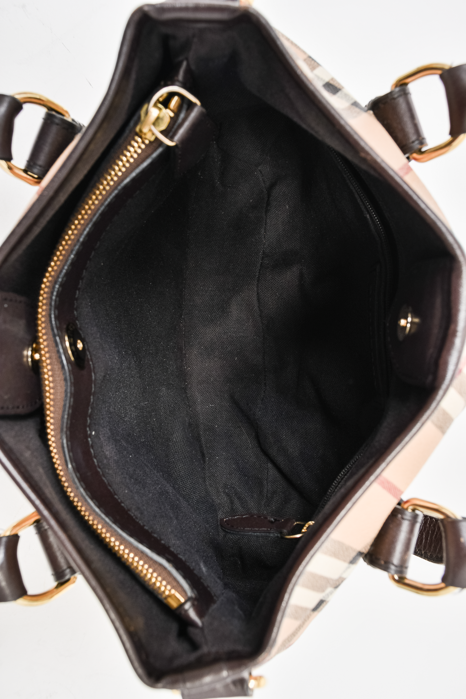 Refresh availabilityBurberry Haymarket Check Northfield Tote with Strap. Dark brown textile interior lining. 3 interior compartments; 2 with magnetic button closure and 1 with zip closure. 3 interior pockets; 2 slip and 1 with zip closure. Removable and adjustable strap. Gold-tone hardware. Tonal stitching.