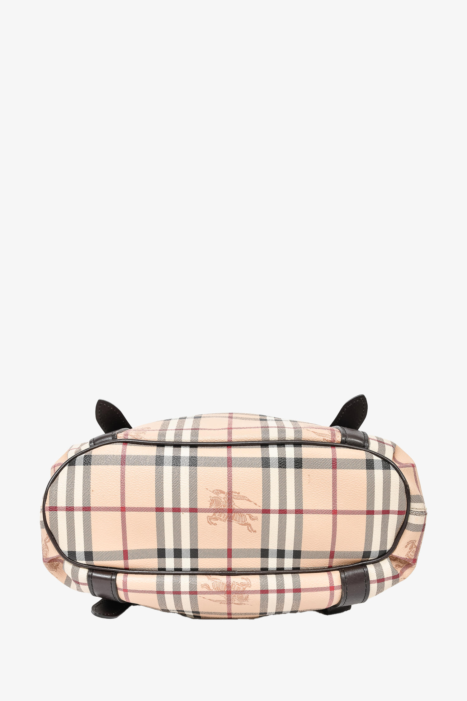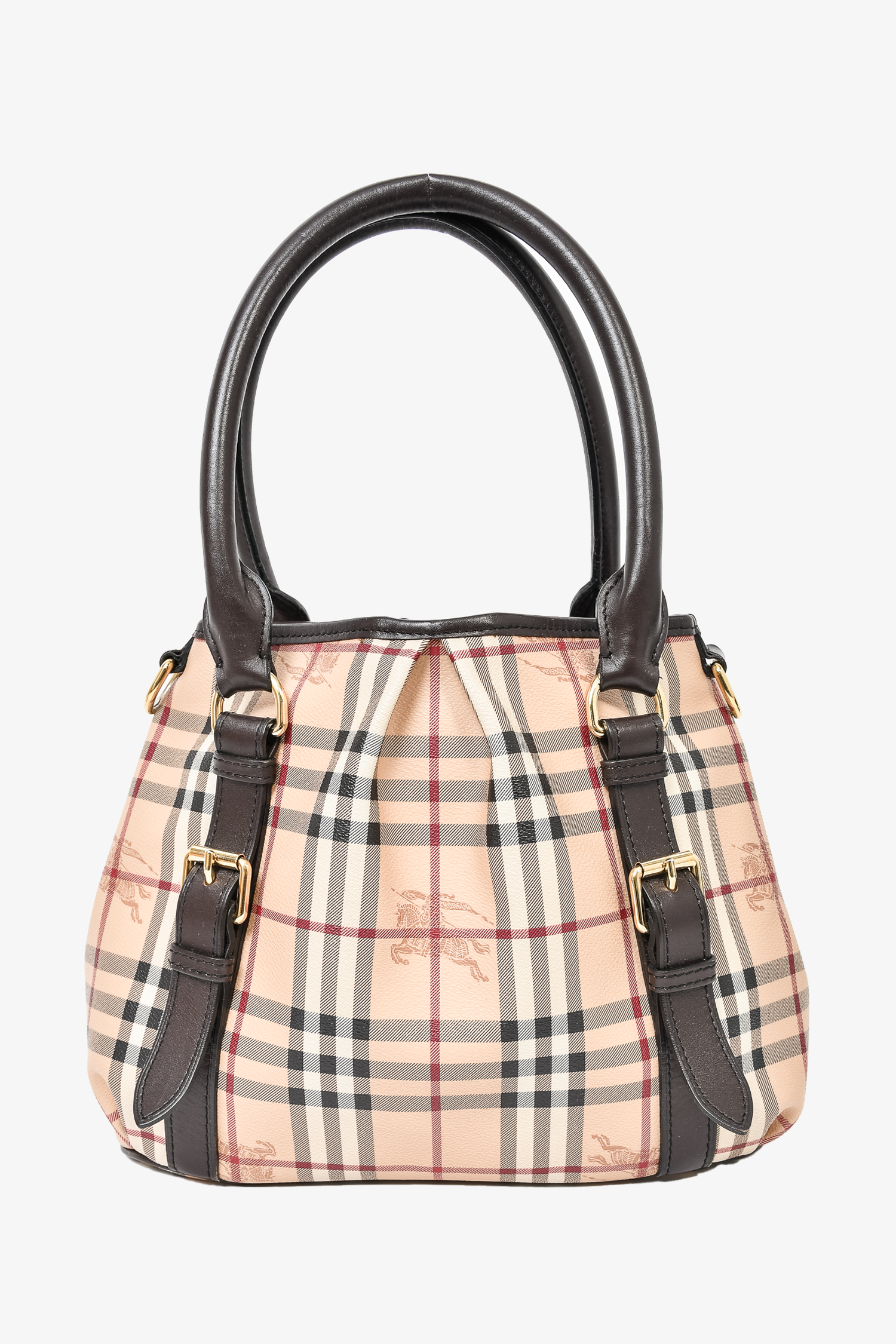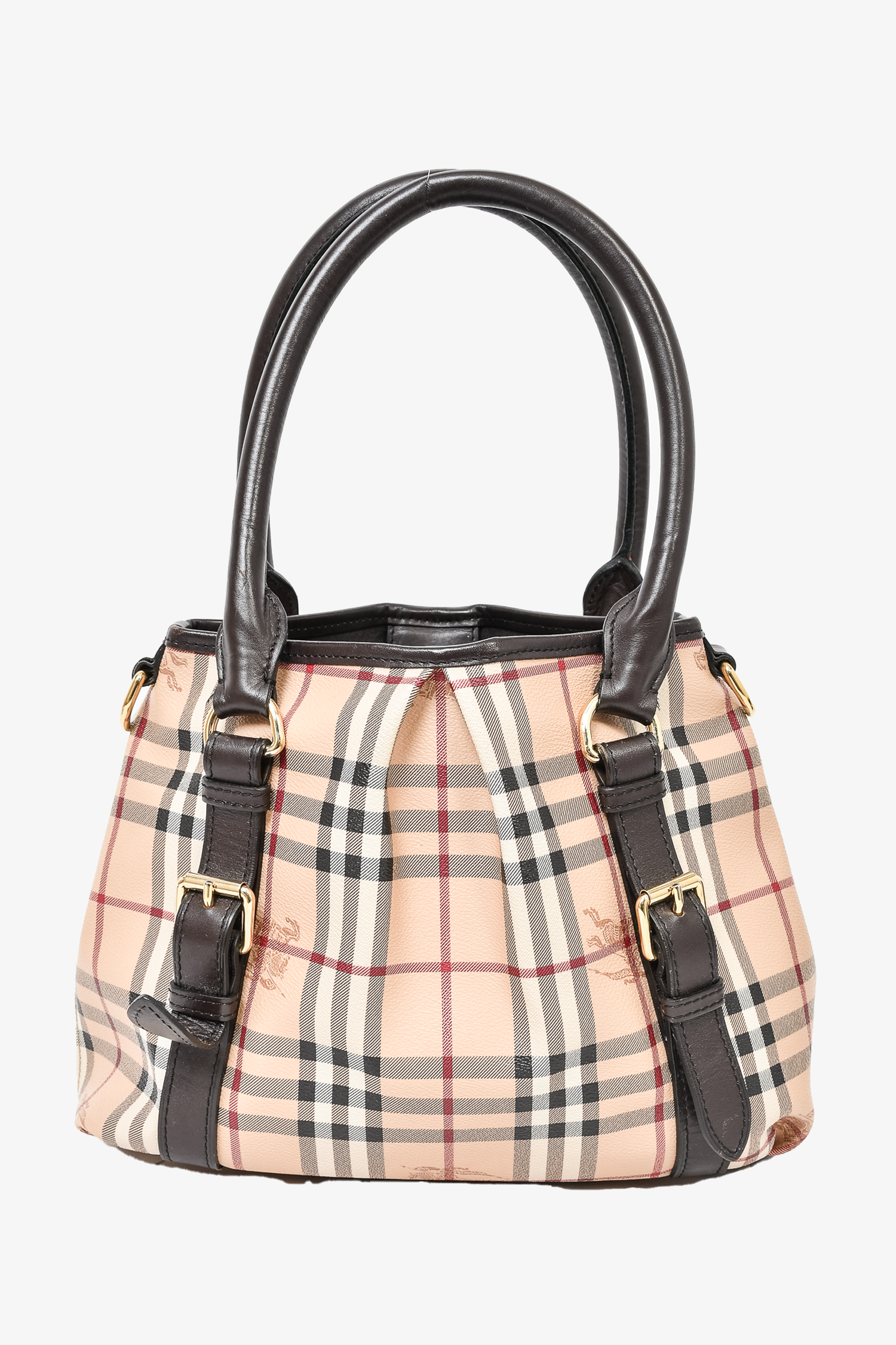 Refresh availabilityBurberry Haymarket Check Northfield Tote with Strap. Dark brown textile interior lining. 3 interior compartments; 2 with magnetic button closure and 1 with zip closure. 3 interior pockets; 2 slip and 1 with zip closure. Removable and adjustable strap. Gold-tone hardware. Tonal stitching.