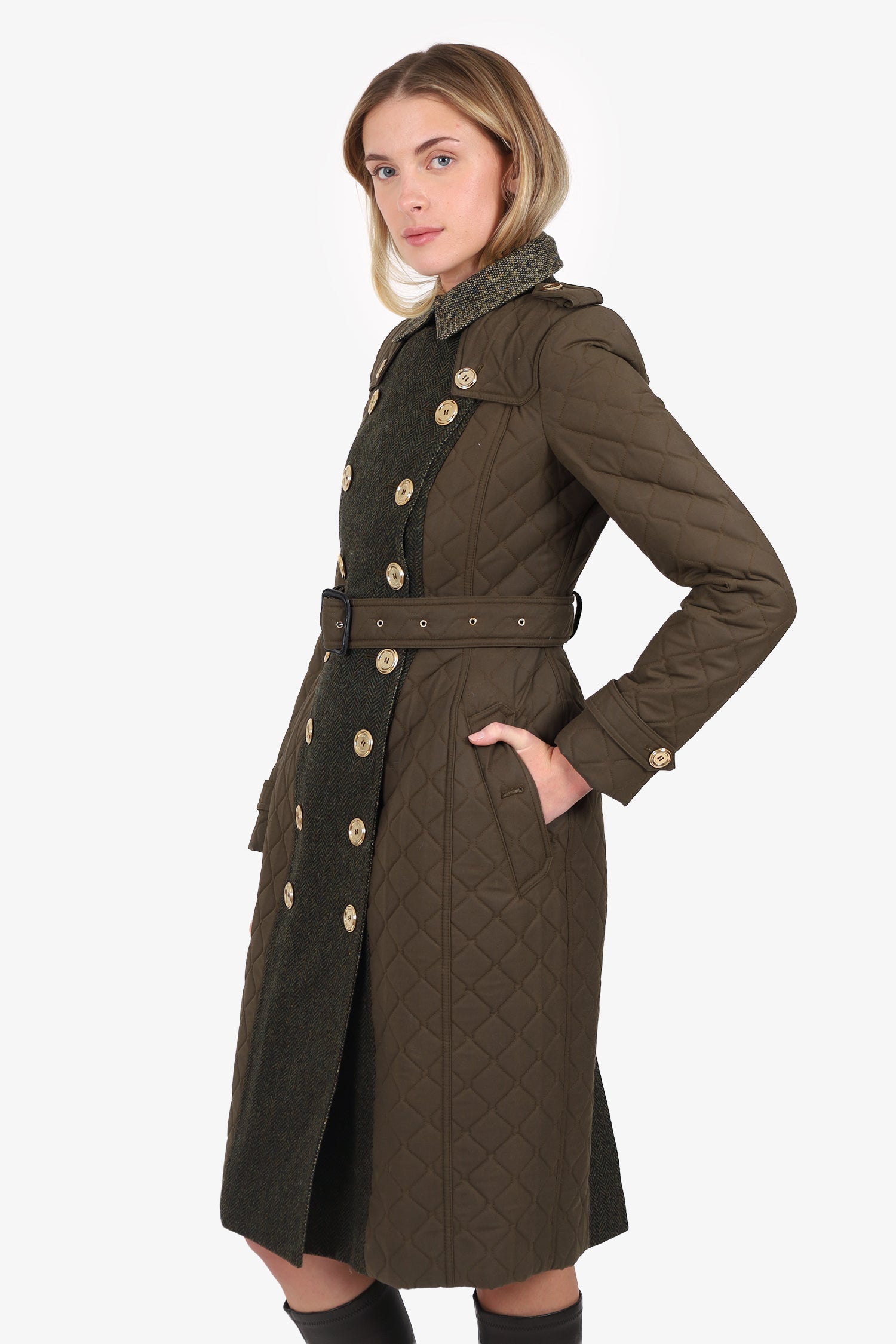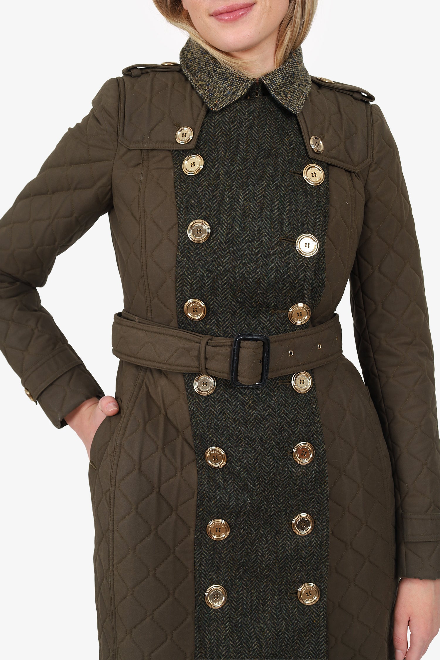 Refresh availabilityBurberry Khaki Green Tweed/Quilted Hourglass Coat. Pull-on. Collared neckline. Front button-up with hook closure. Removable belt with adjustable pull-through buckle closure. Button-up closure to shoulders and sleeve cuffs. 2 exterior side button-up pockets. Single rear slit. Gold-tone hardware. Tonal stitching.