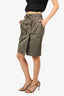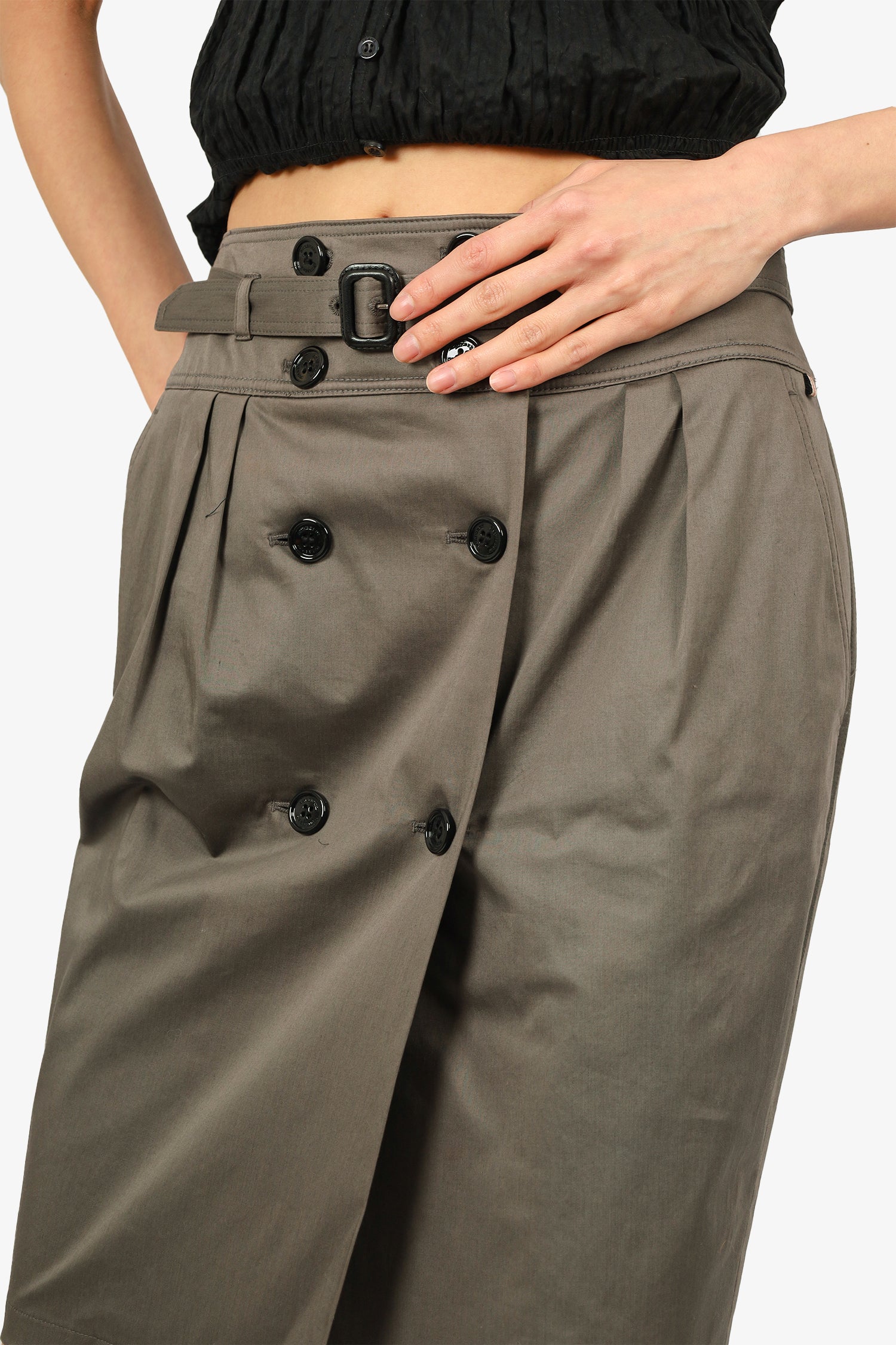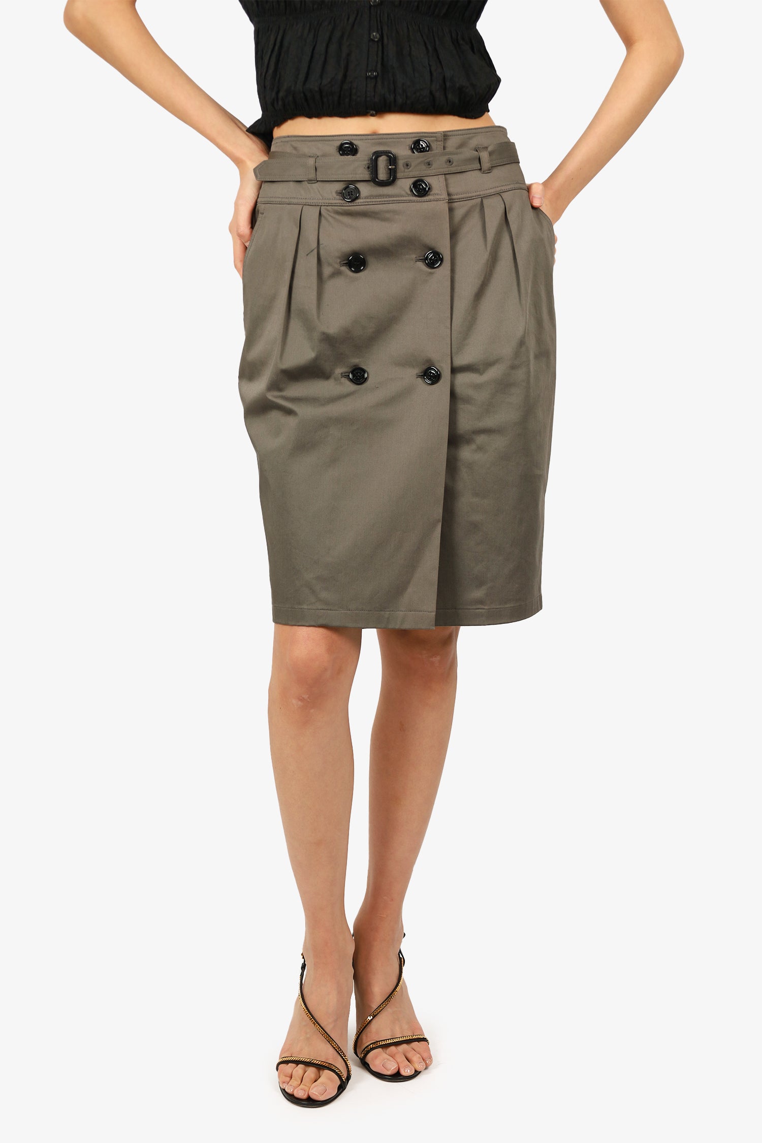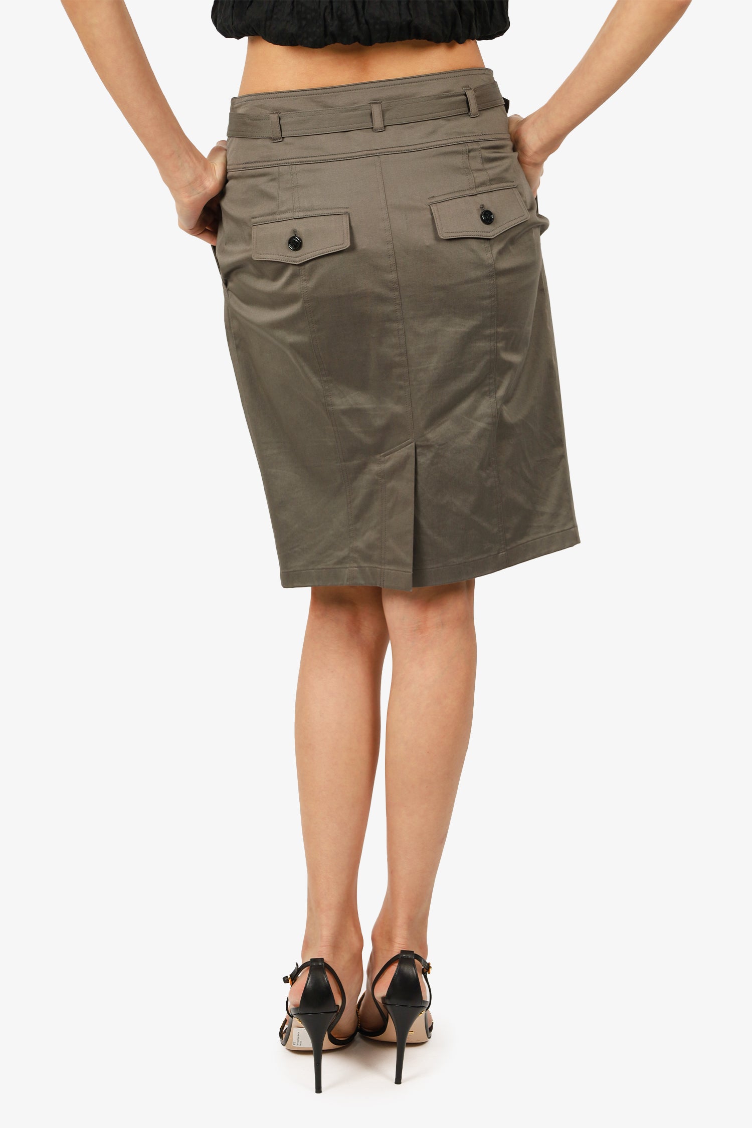Refresh availabilityBurberry Khaki Twill Belted Skirt. Slip-on. Front double-set button-up closure. Waistband belt loops. Removable and adjustable belt with leather buckle closure. 4 exterior pockets; 2 front side slip, 2 rear with button-up closure. Single rear vent. Tonal stitching.