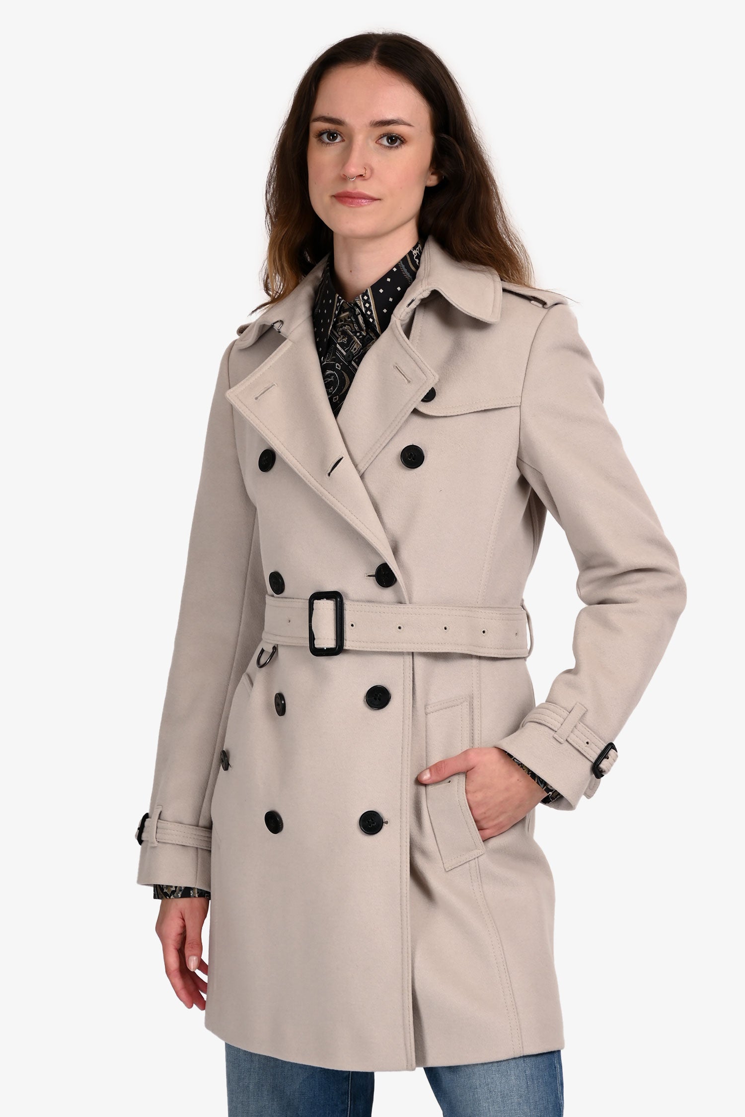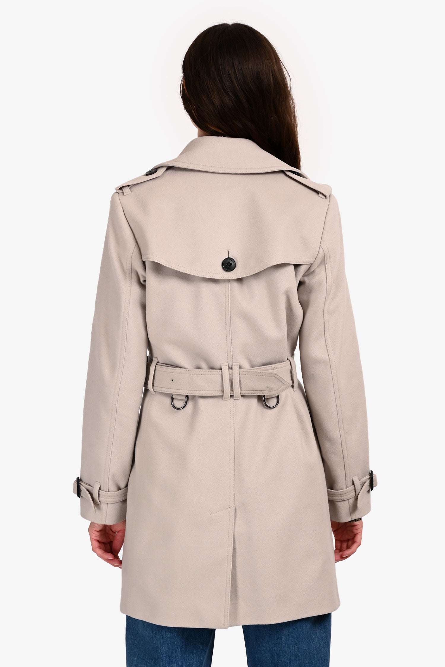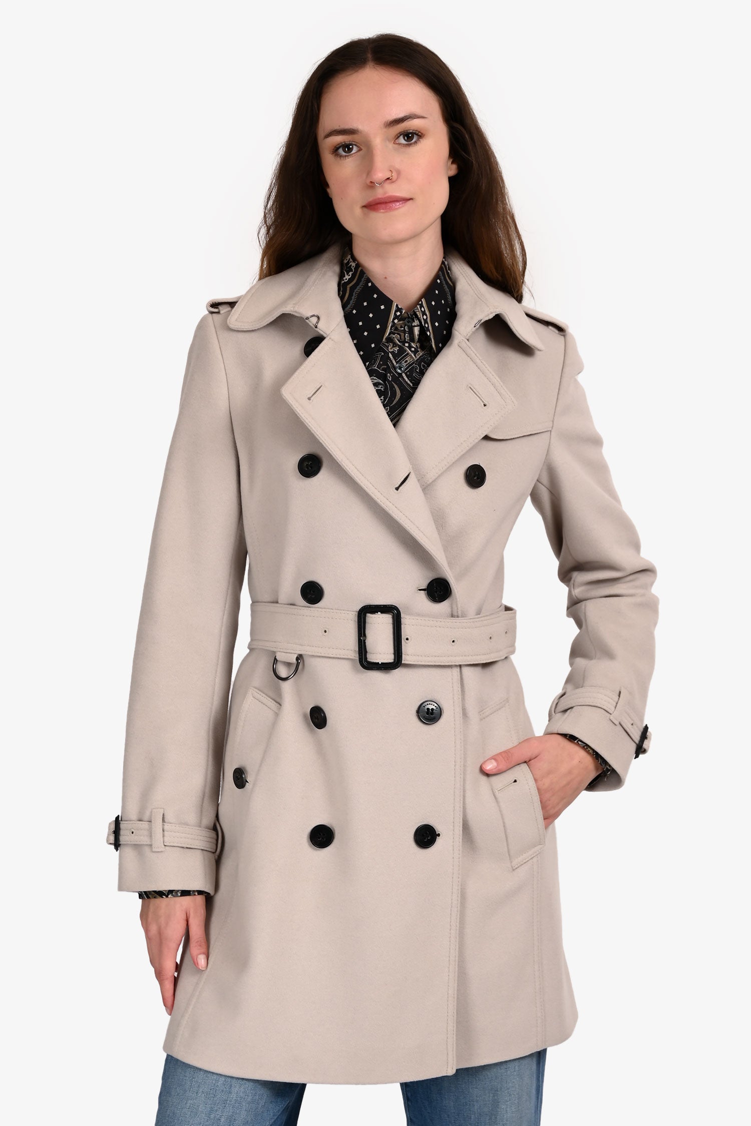 Refresh availabilityBurberry Light Taupe Wool/Cashmere Double-Breasted Coat. Pull-on. Double-breasted front button closure. Hook-and-eye neck clasp closure. Sleeve cuffs with button-up strap detail. 2 exterior pockets with button closure. Adjustable and removable belt. Lined interior. Silver-tone hardware. Tonal stitching.