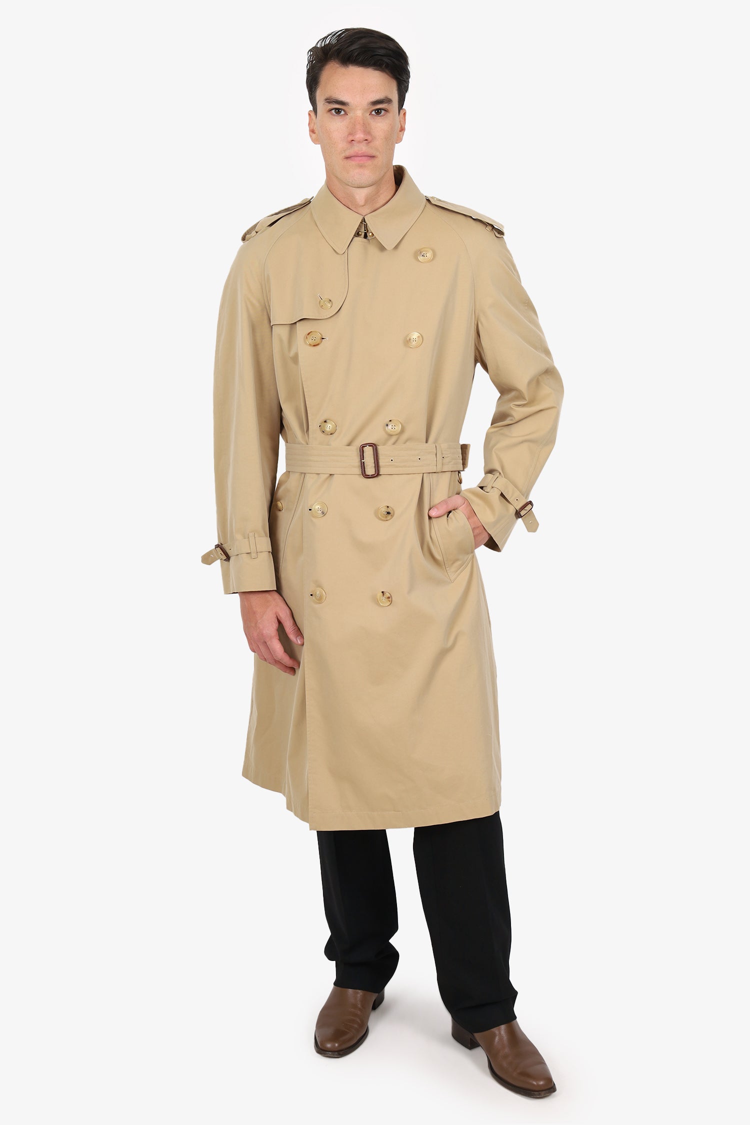 Refresh availabilityBurberry London Beige Trench Coat. Collared-neckline. Front button-up with hook closure. 2 additional button closures under front flap. Front small overlaying flap below neckline with single button closure. Button closure detail on shoulders. Attached sleeve-cuff straps with adjustable buckle closure. Removable adjustable belt at waistband with leather buckle closure. 2 front exterior pockets with button-up closure. 2 interior pockets with button closure. Lined interior. Tonal stitching.