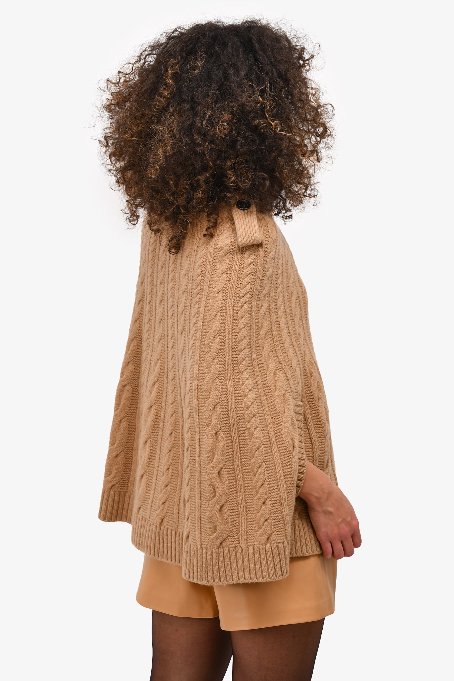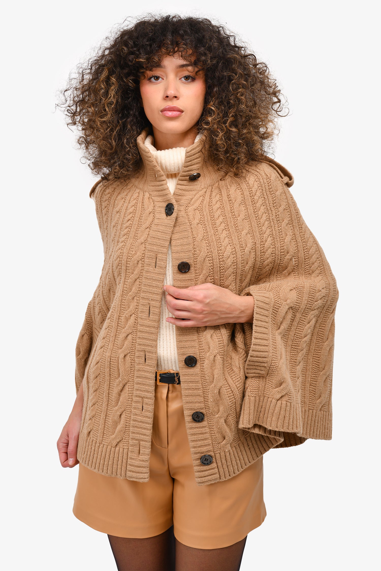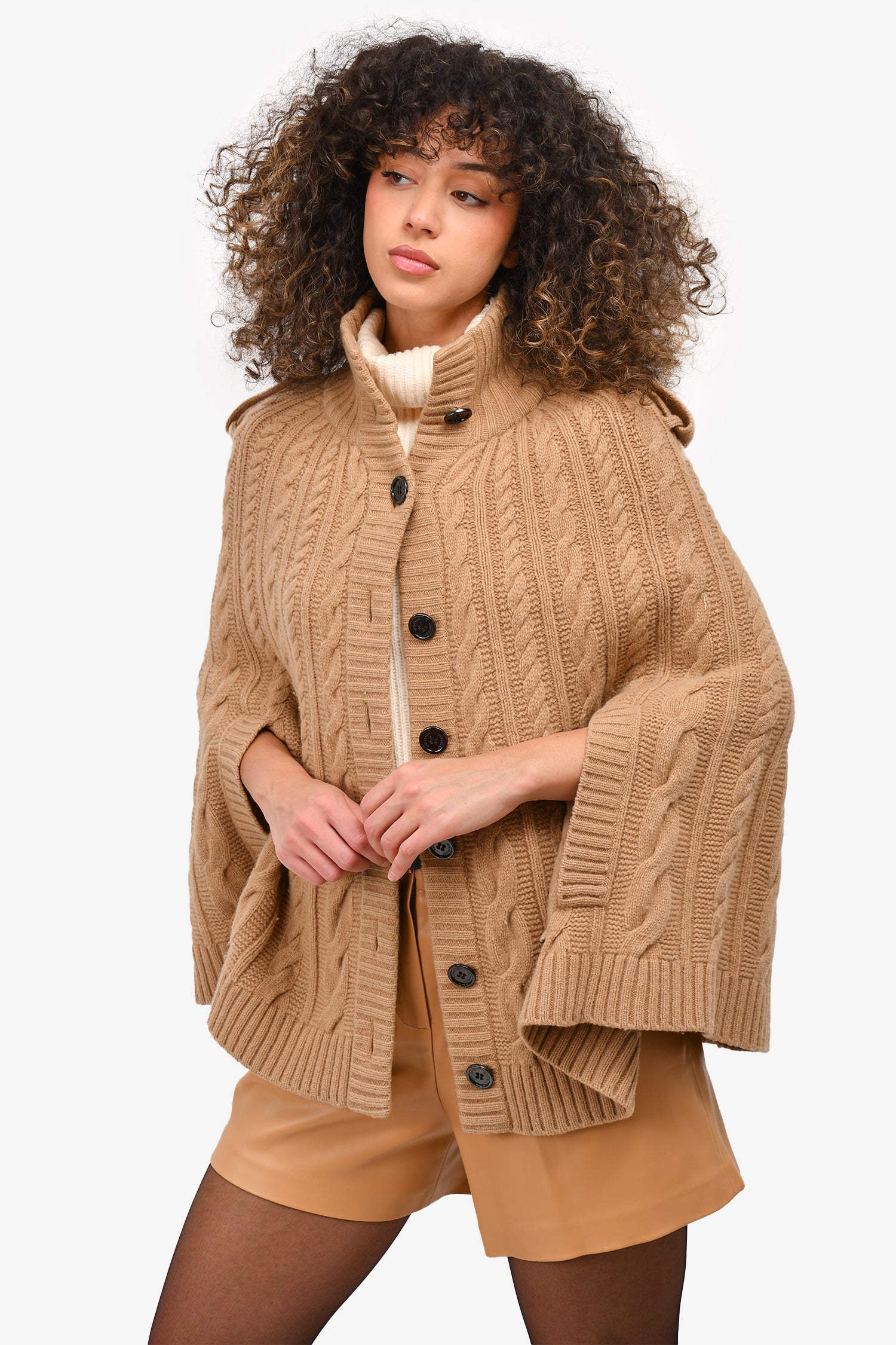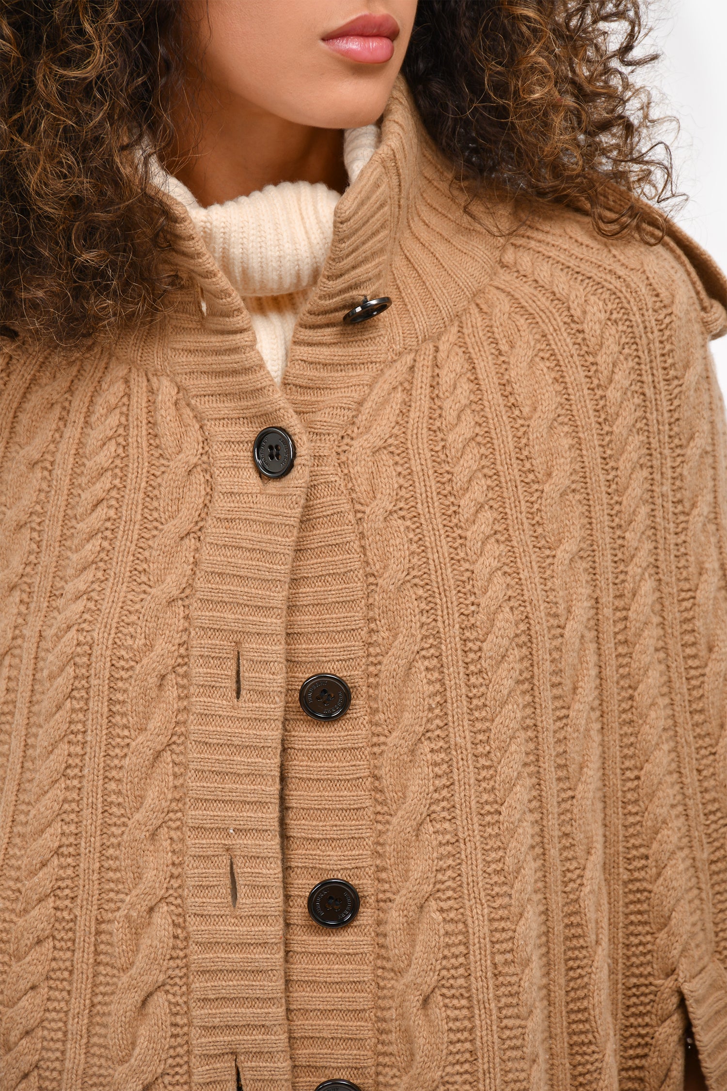 Refresh availabilityBurberry London Beige Wool Cable Knit Poncho. Front button up closure. Decorative side pockets. Open sleeves. Ribbed collar and hem. Unlined. Tonal stitching.