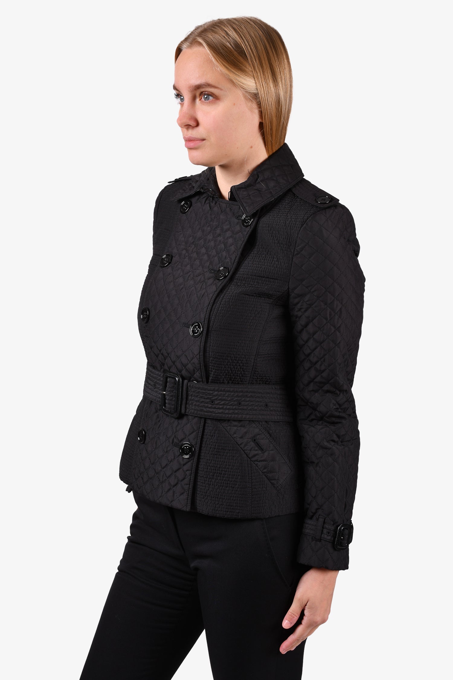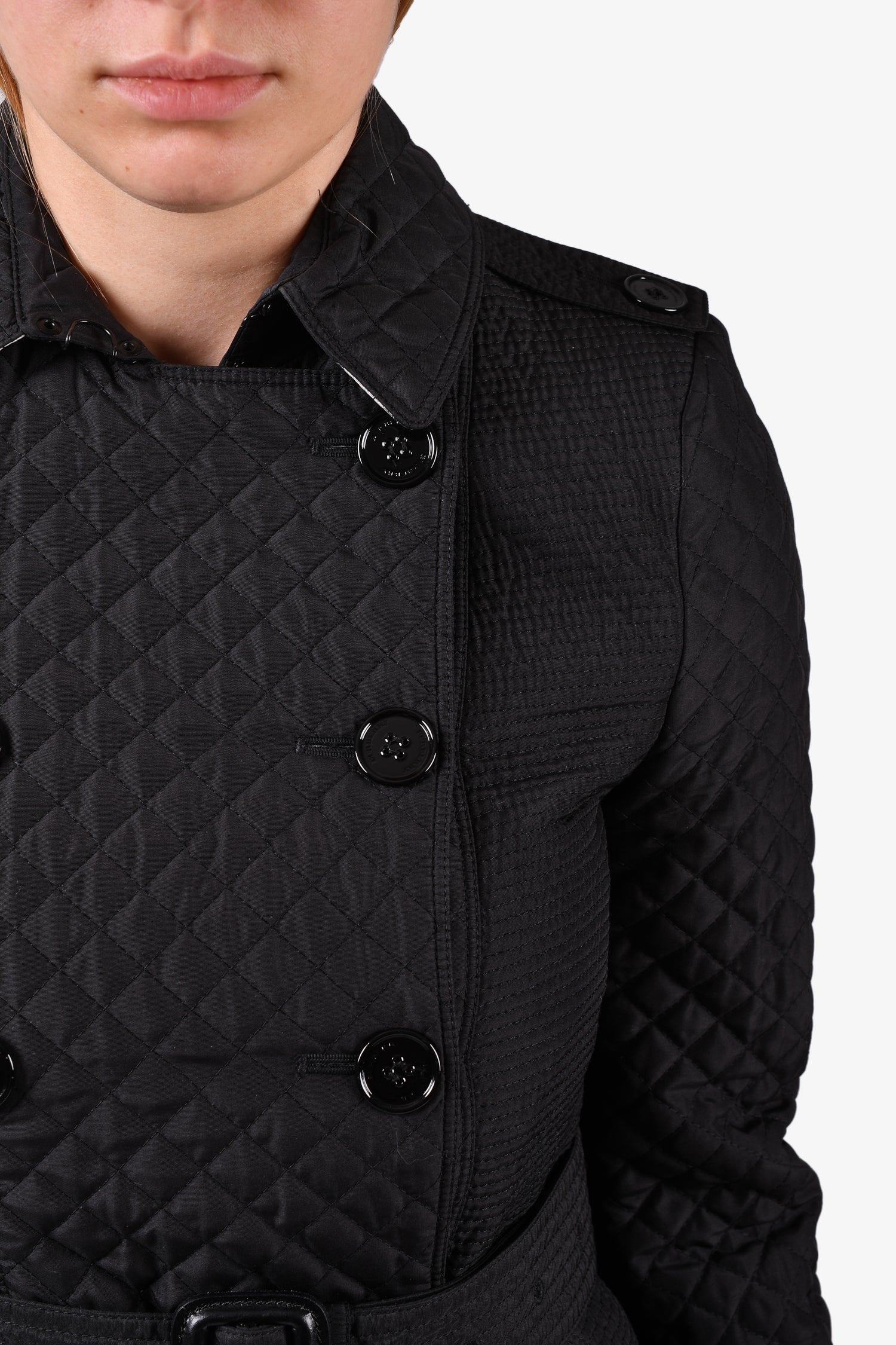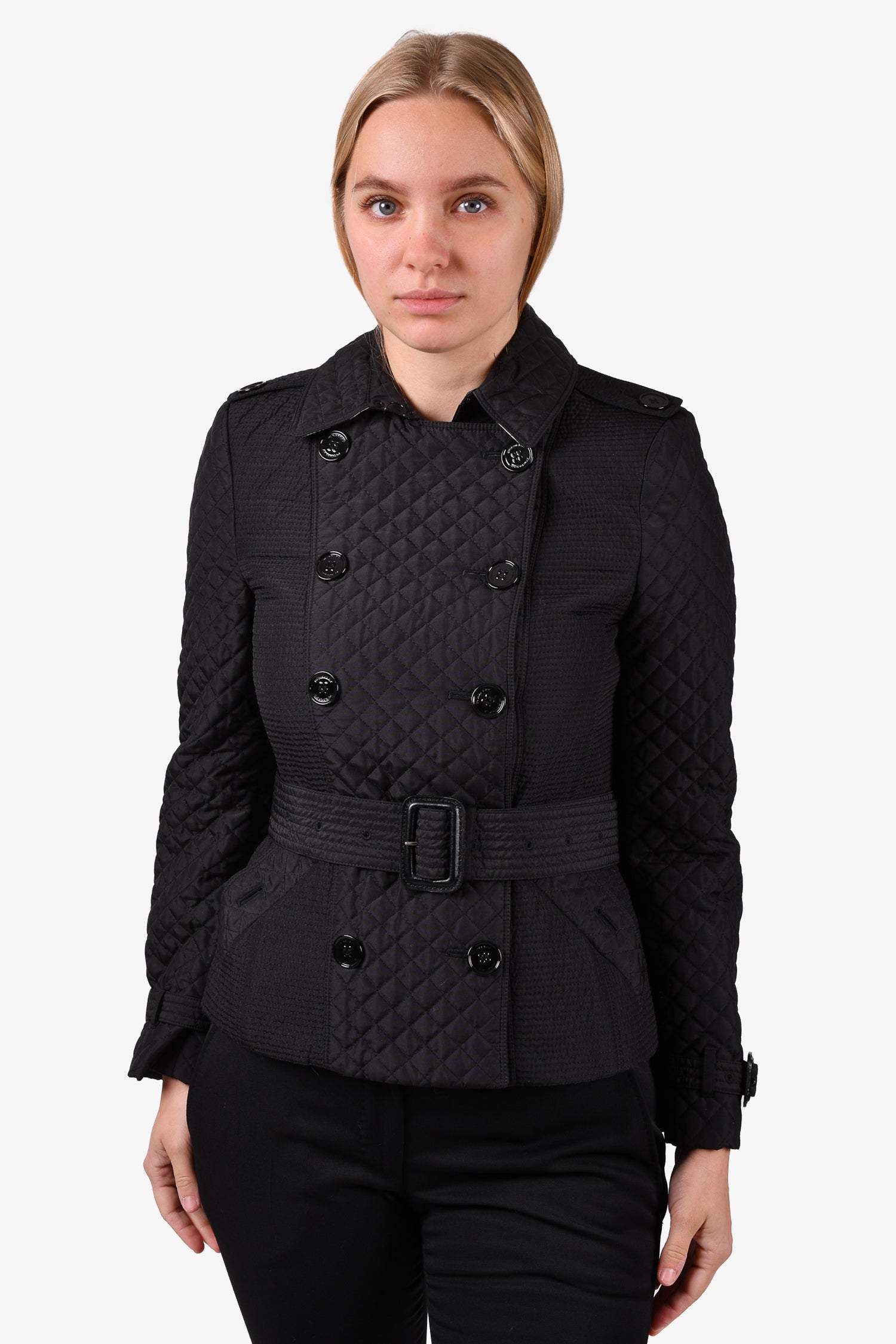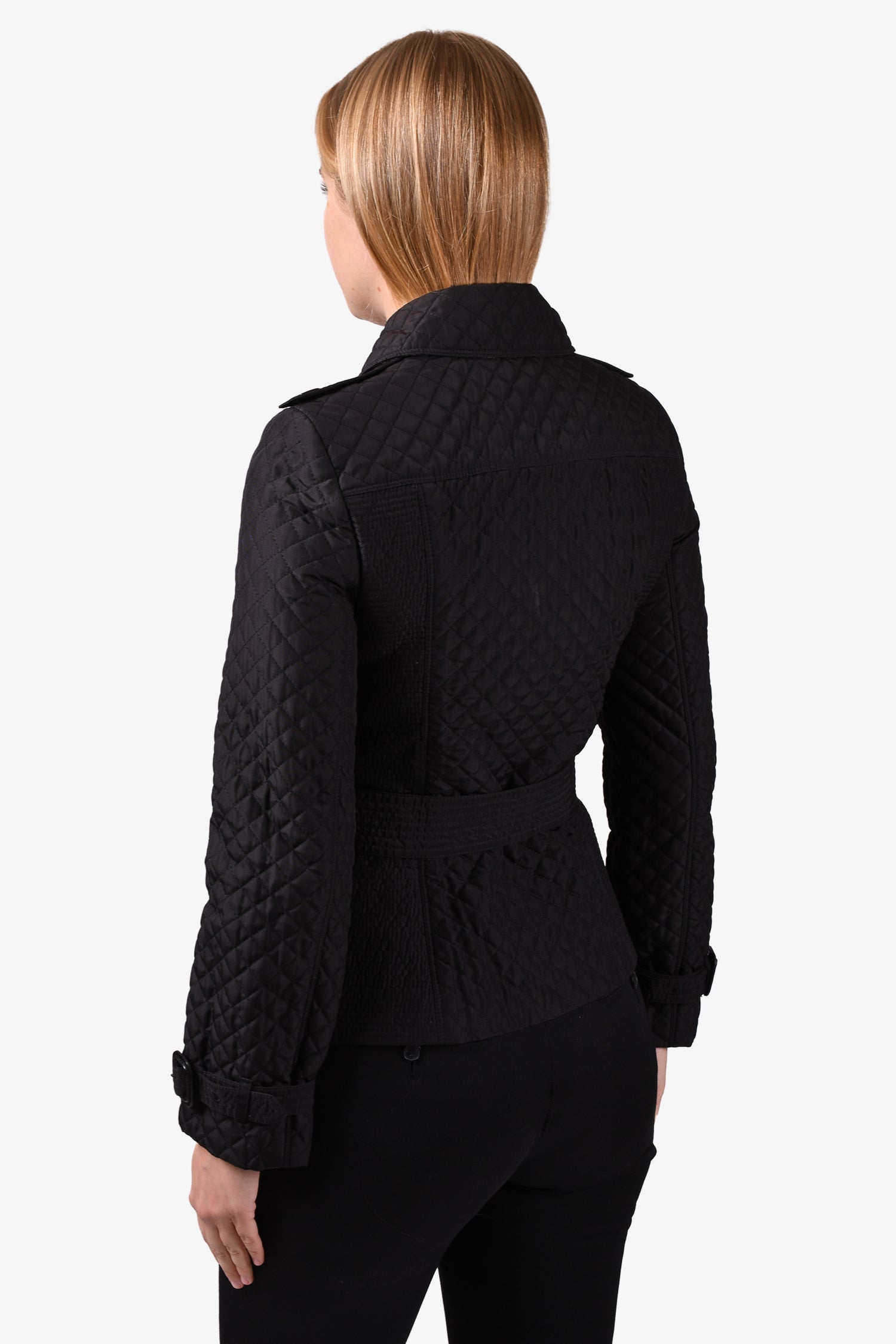 Burberry London Black Quilted Jacket. Front button-up closure. Front pockets. Signature nova check interior lining. Strap with buckle detail on the cuffs. Tonal stitching.