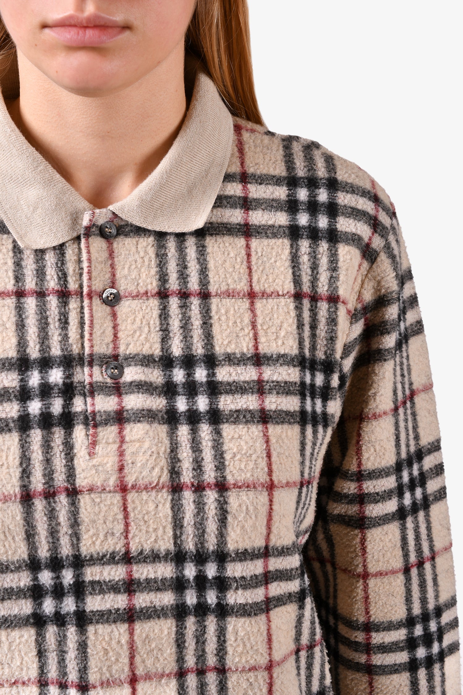 Refresh availabilityBurberry London Fleece Collared Nova Check Sweater. Pull-on. Button-up closure on the neckline. Ribbed neck, cuffs and hem. Tonal stitching.