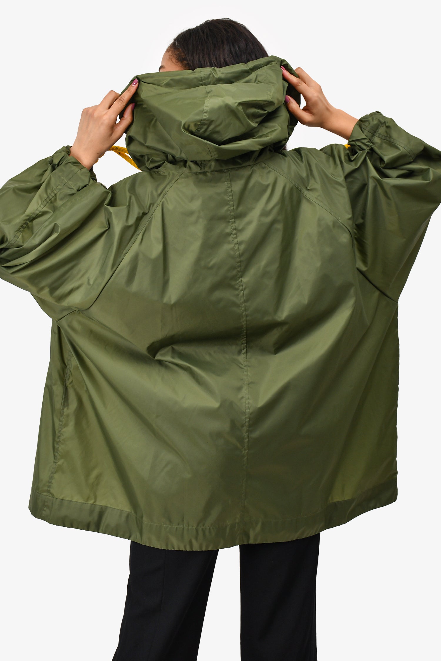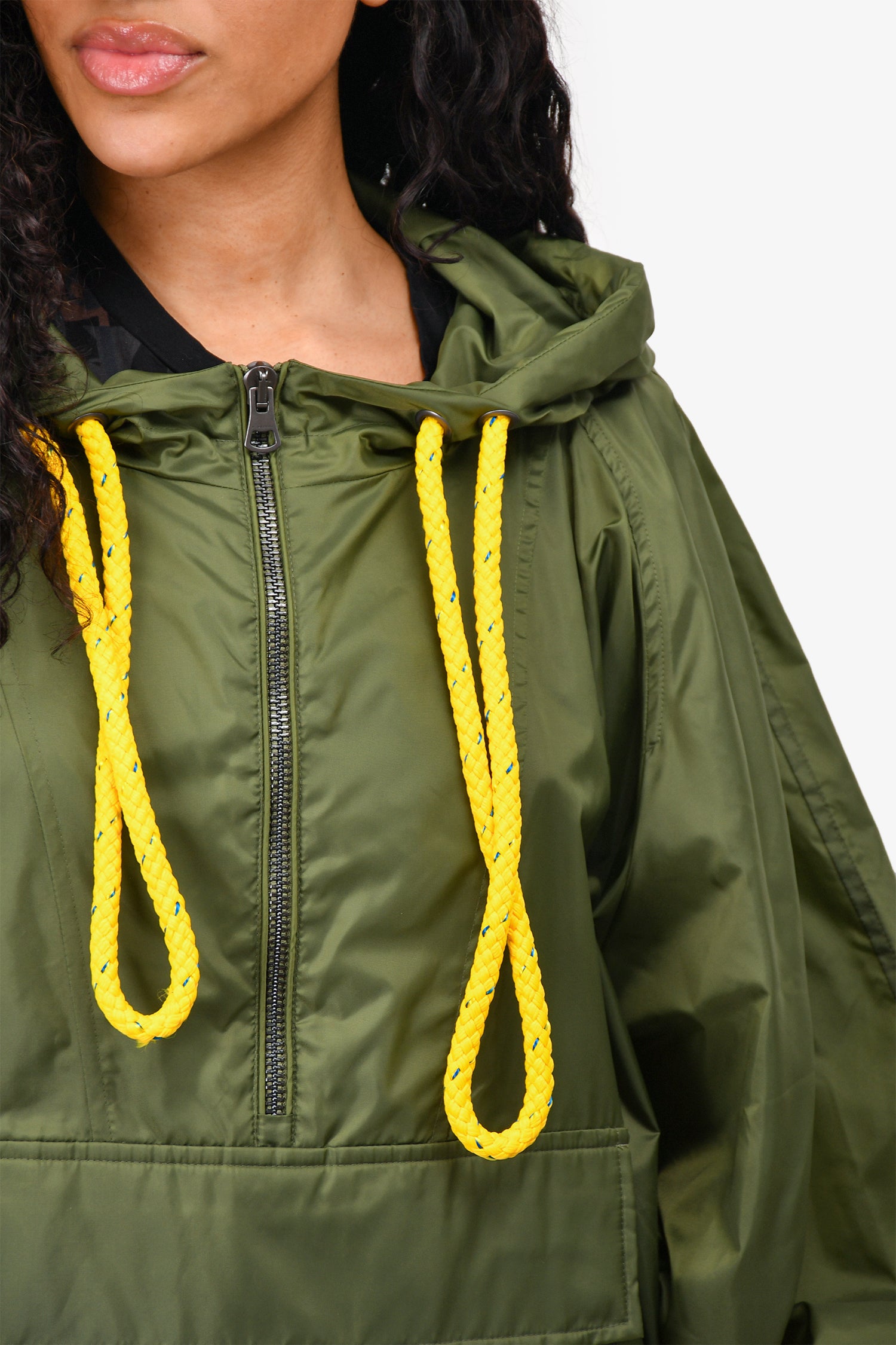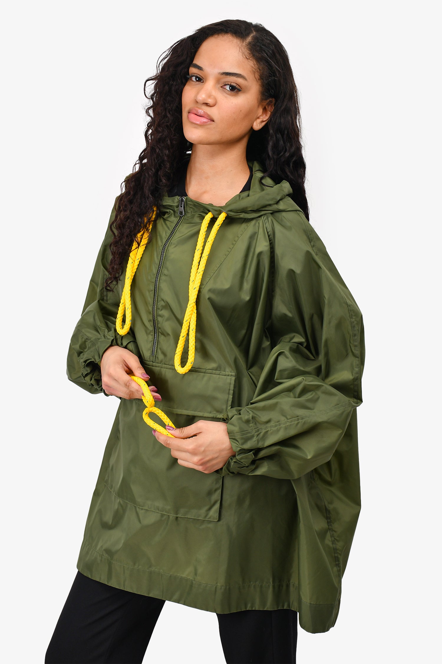 Refresh availabilityBurberry London Green/Yellow Nylon/Rope Poncho. Front zip closure. Single front pouch pocket. Elasticized cuffs with contrasting yellow rope closure.