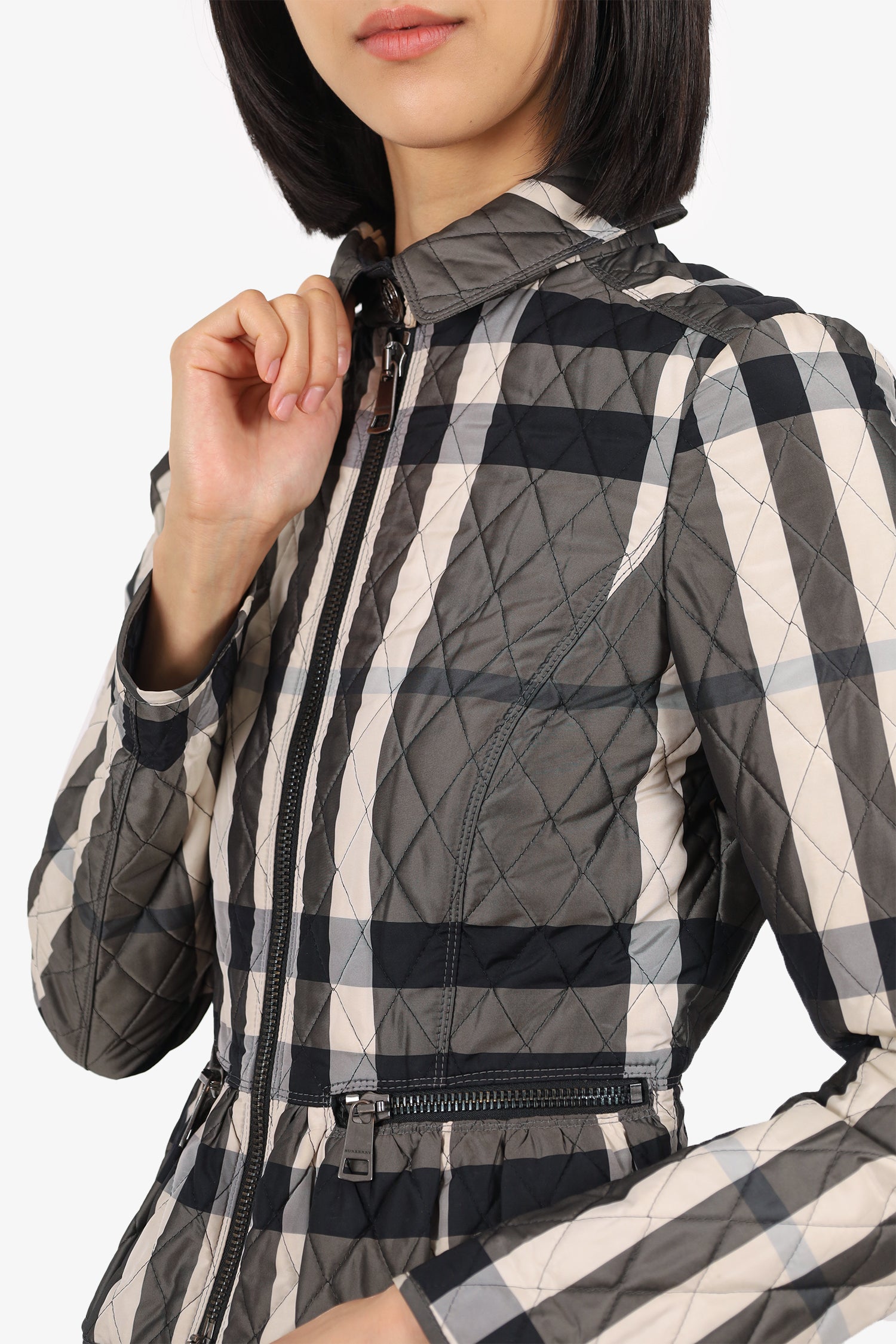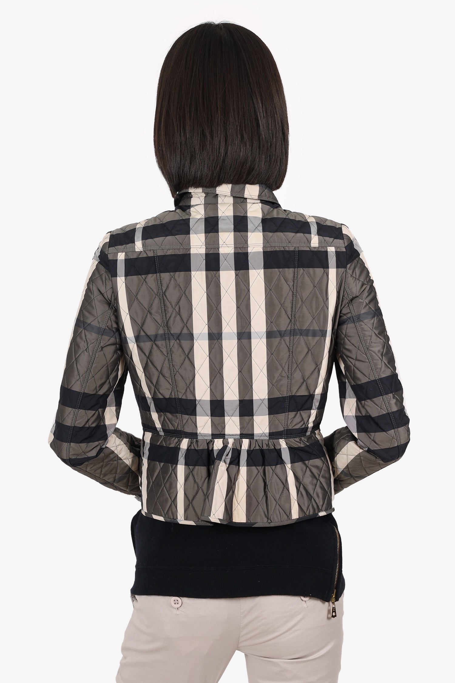 Refresh availabilityBurberry London Grey/Cream Quilted Nova Print Peplum Jacket. Pull-on. Collared-neckline. Front two-way zip and button-up closure. 2 front zip pockets. Lined interior. Palladium-tone hardware. Tonal stitching.