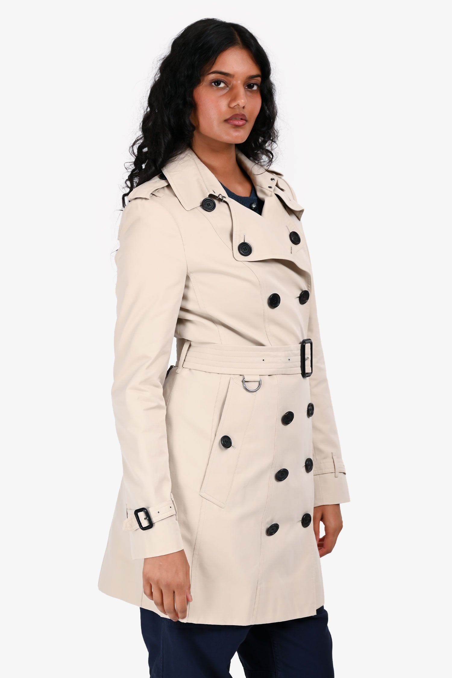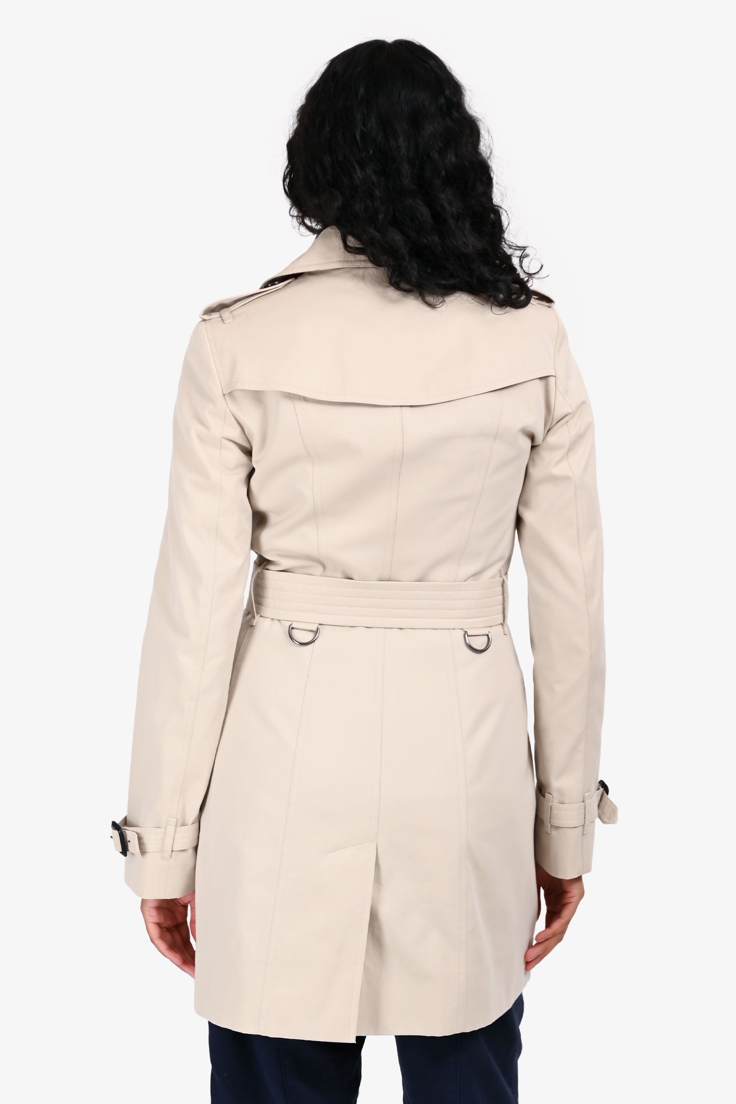 Refresh availabilityBurberry London Light Beige Midi Belted Trench Coat. Front button-up closure. 2 front slip pockets with button closure. Strap with buckle closure at sleeve cuffs. Removable belt at waistline with buckle closure. Signature nova check interior lining. Tonal hardware. Tonal stitching.