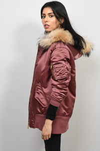 Refresh availabilityBurberry London Muted Red Satin Longline Bomber Jacket with Fur Trim Hood. Tonal top stitching. Front flap pcokets. Front zip closure. Ribbed hemline. Sleeve pocket detail. Lined. Ribbed cuffs