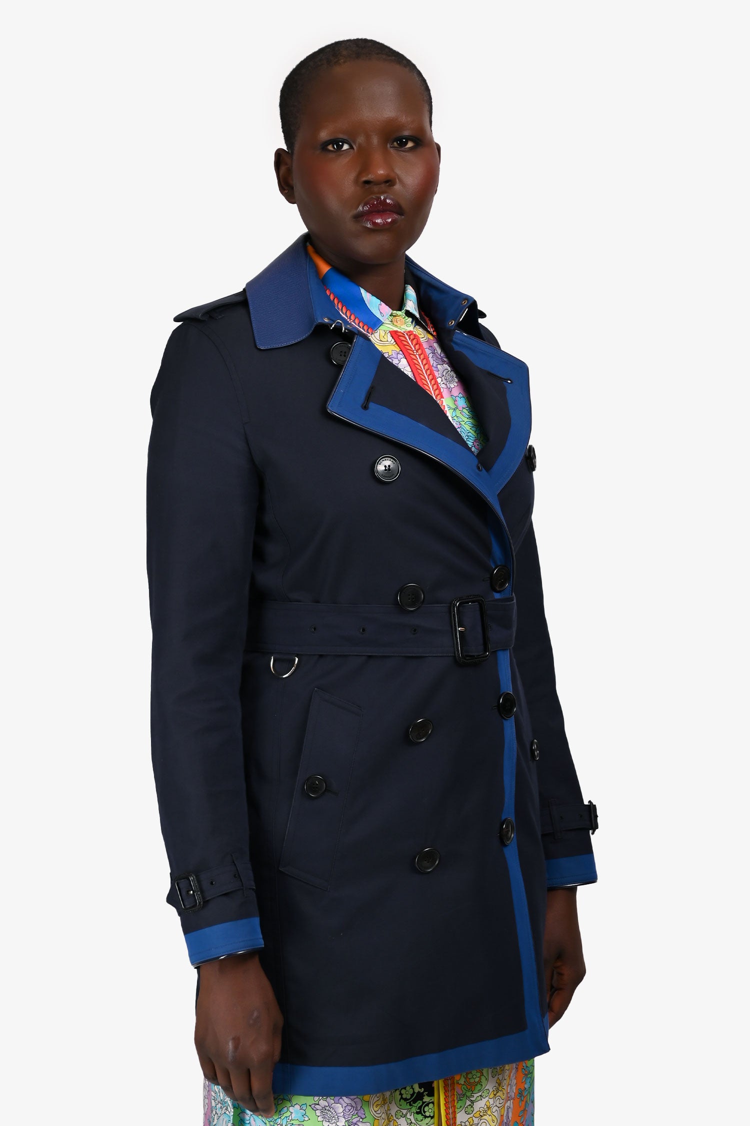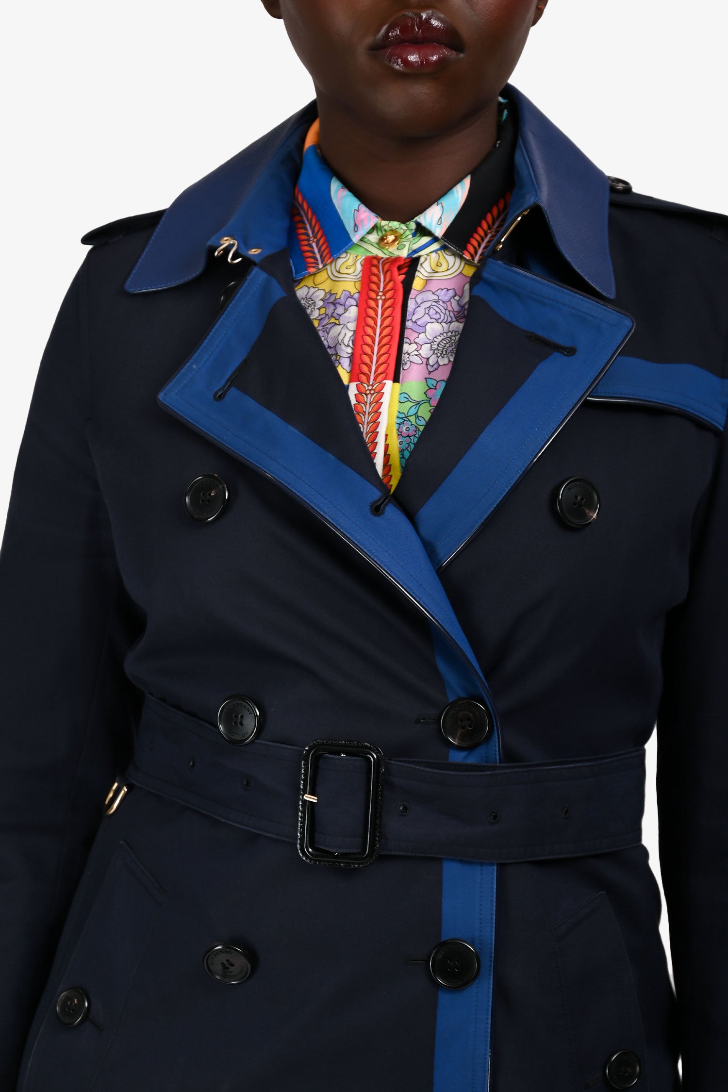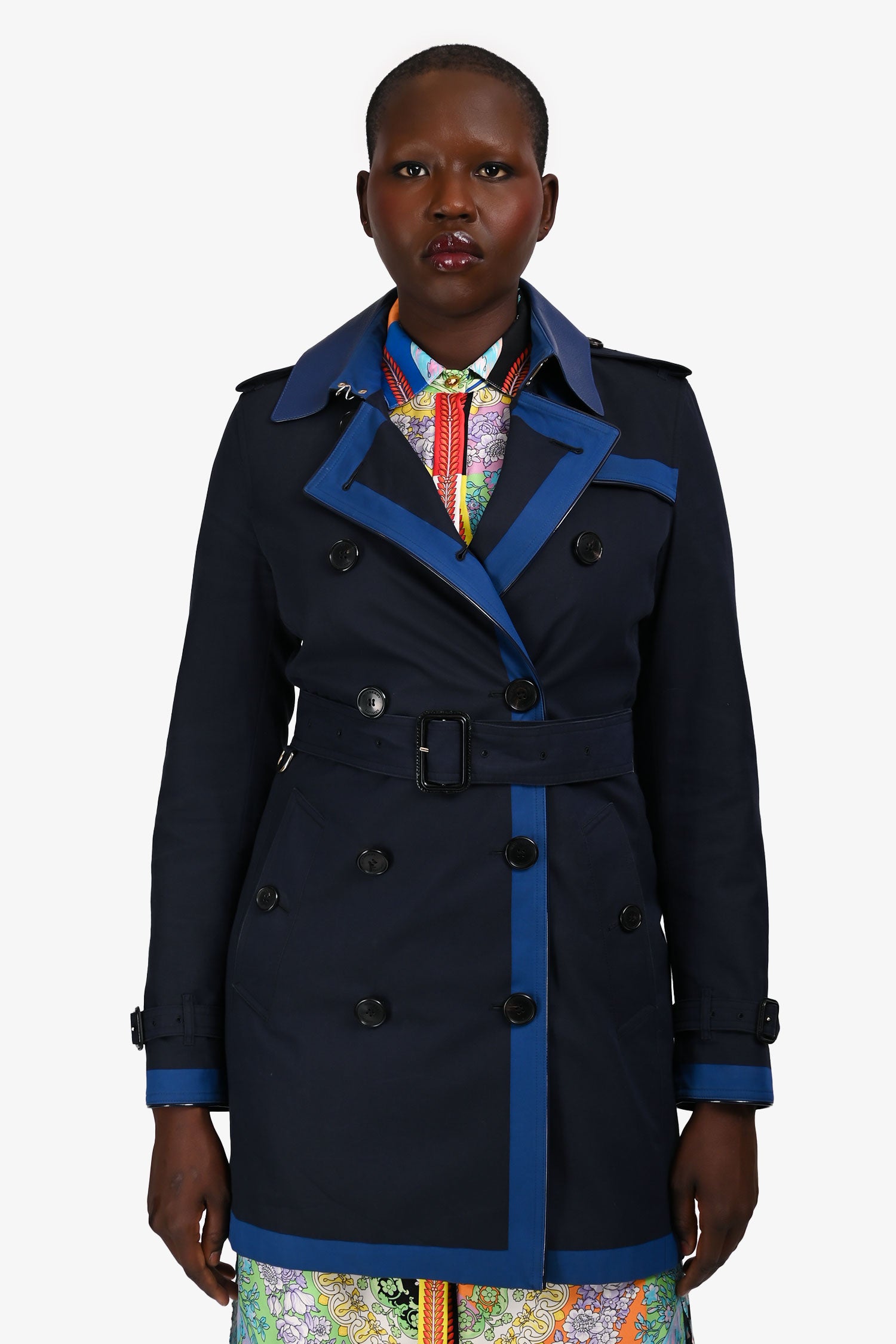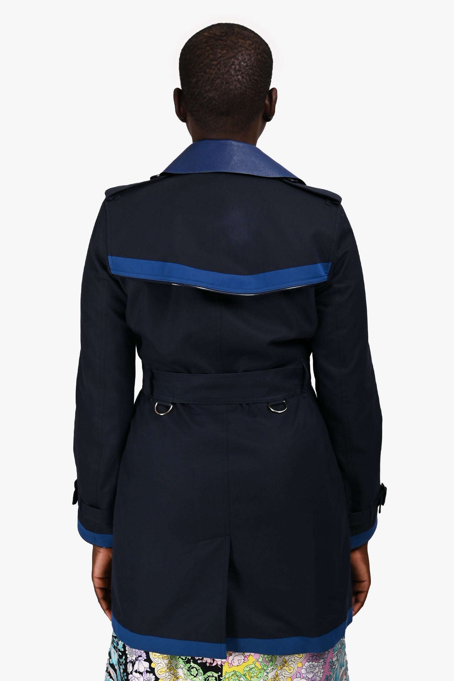 Refresh availabilityBurberry London Navy/Blue Leather Collared Short Trench Coat. Slip-on. Point collar with contrast leather trim. Front button-up closure. Shoulder straps with button-up closure. Cuffs with an adjustable buckle closure. Removable and adjustable waist belt. Belted waist. Two exterior slip pockets with button closures. Rear vent. Lined interior. Gold-tone hardware. Tonal stitching.