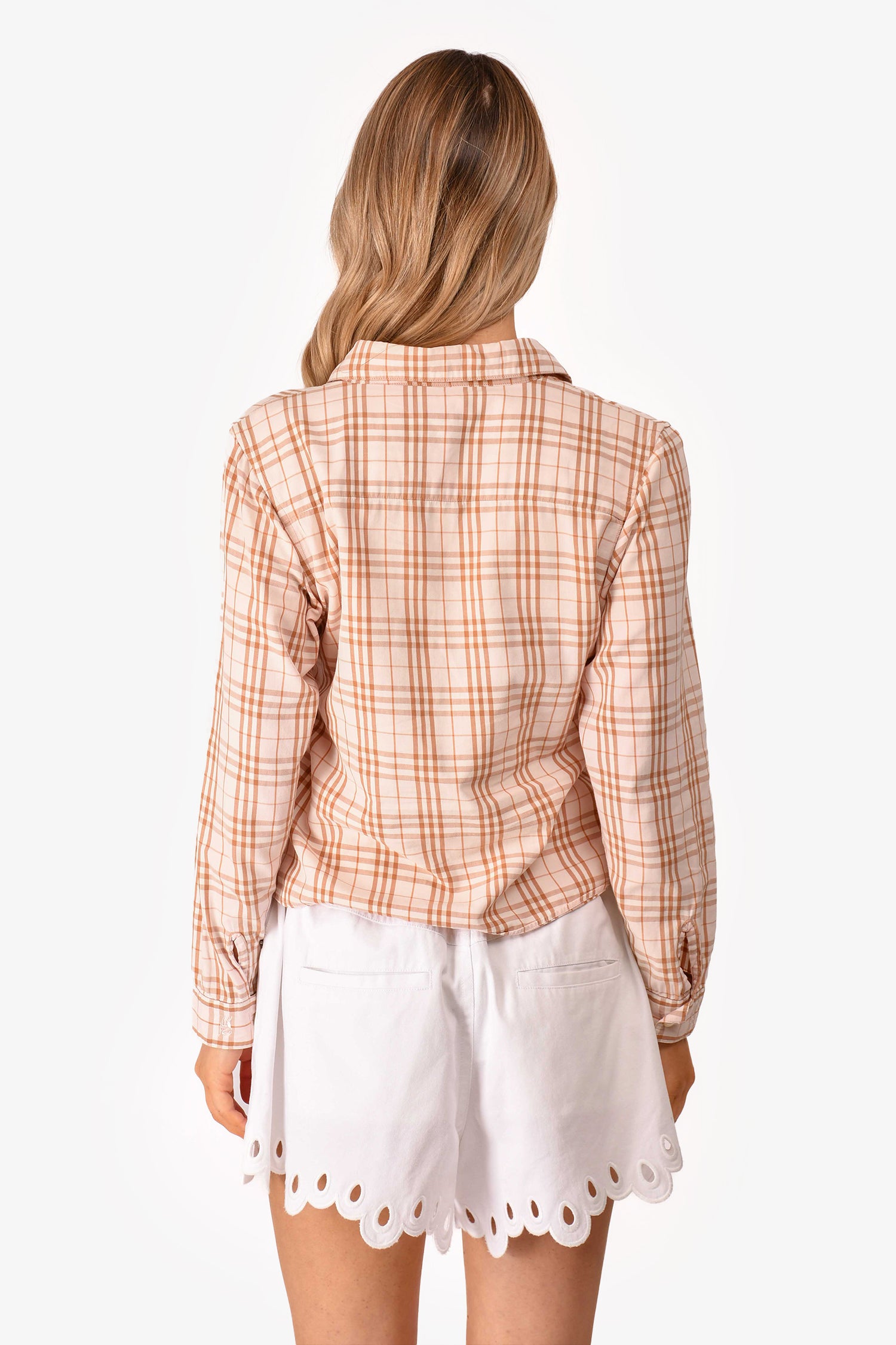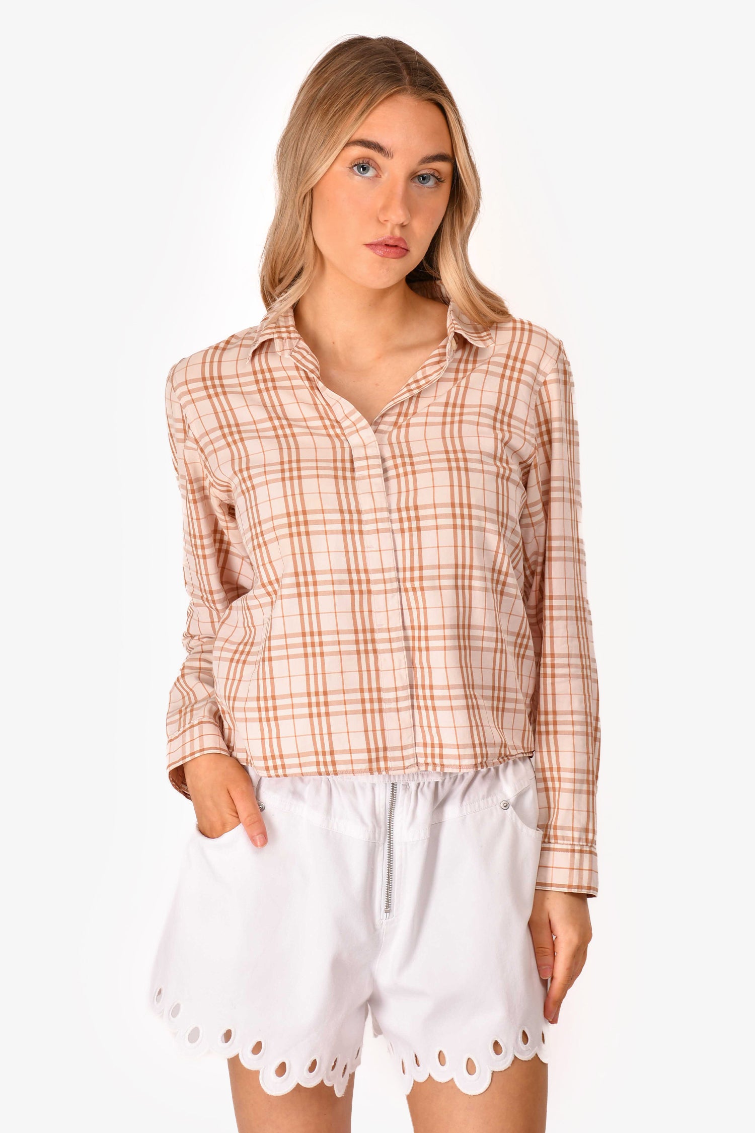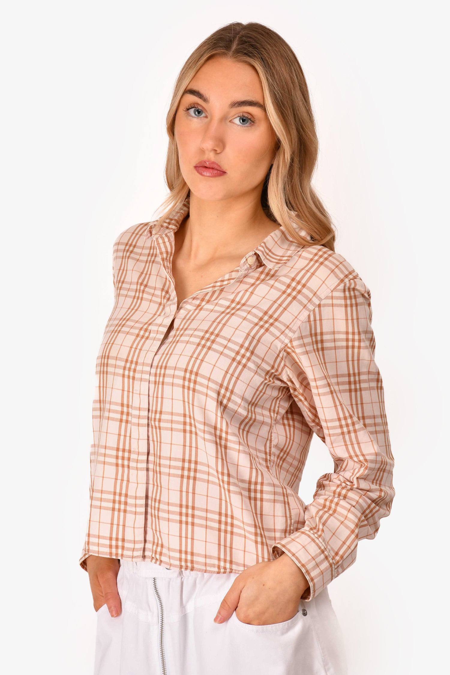 Refresh availabilityBurberry London Pink Check Cropped Button Down Shirt. Front-button up closure. Buttoned cuffs. Tonal stitching.