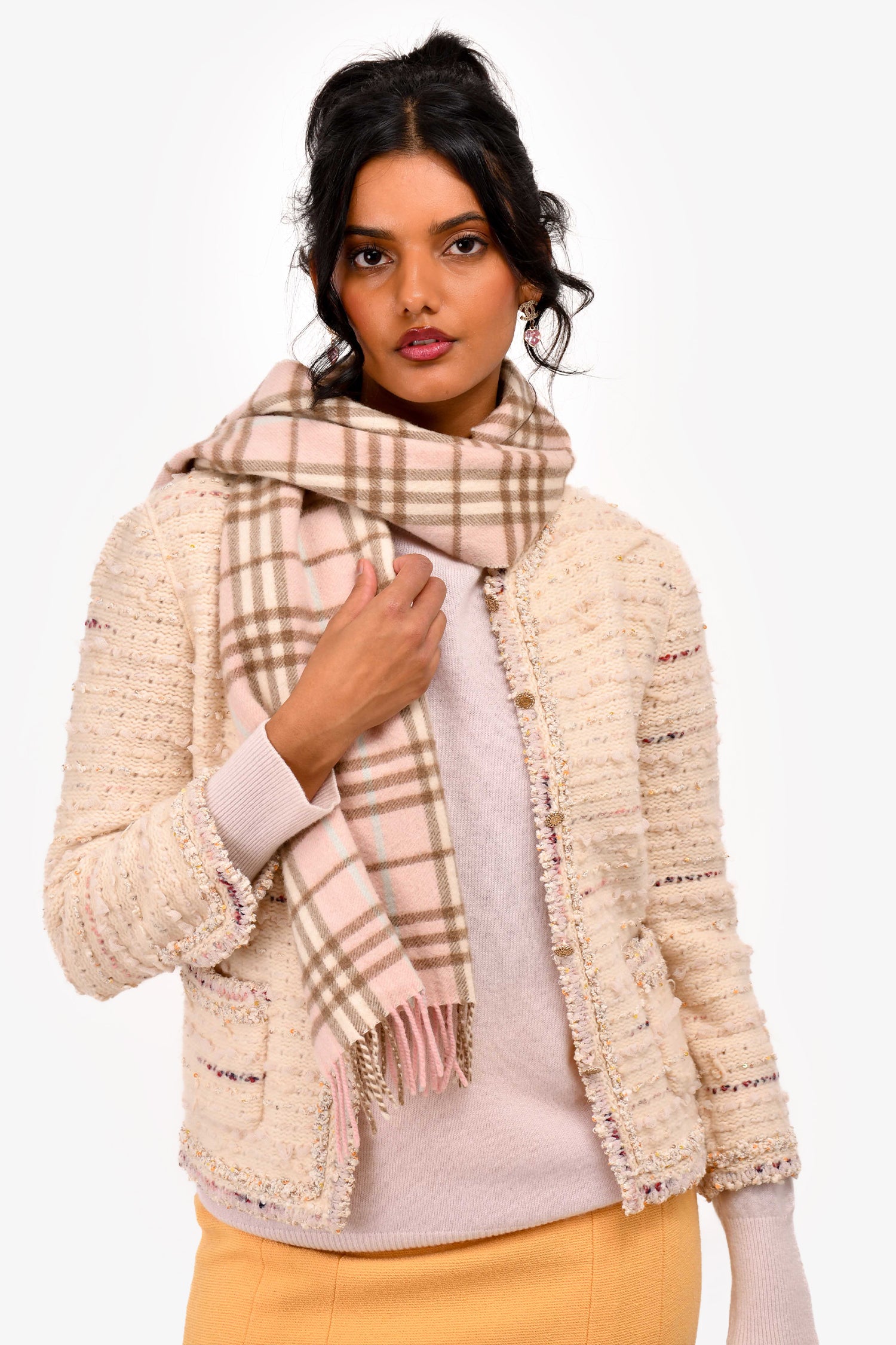 Refresh availabilityBurberry London Pink/Tan Check Cashmere Thin Fringed Scarf.
