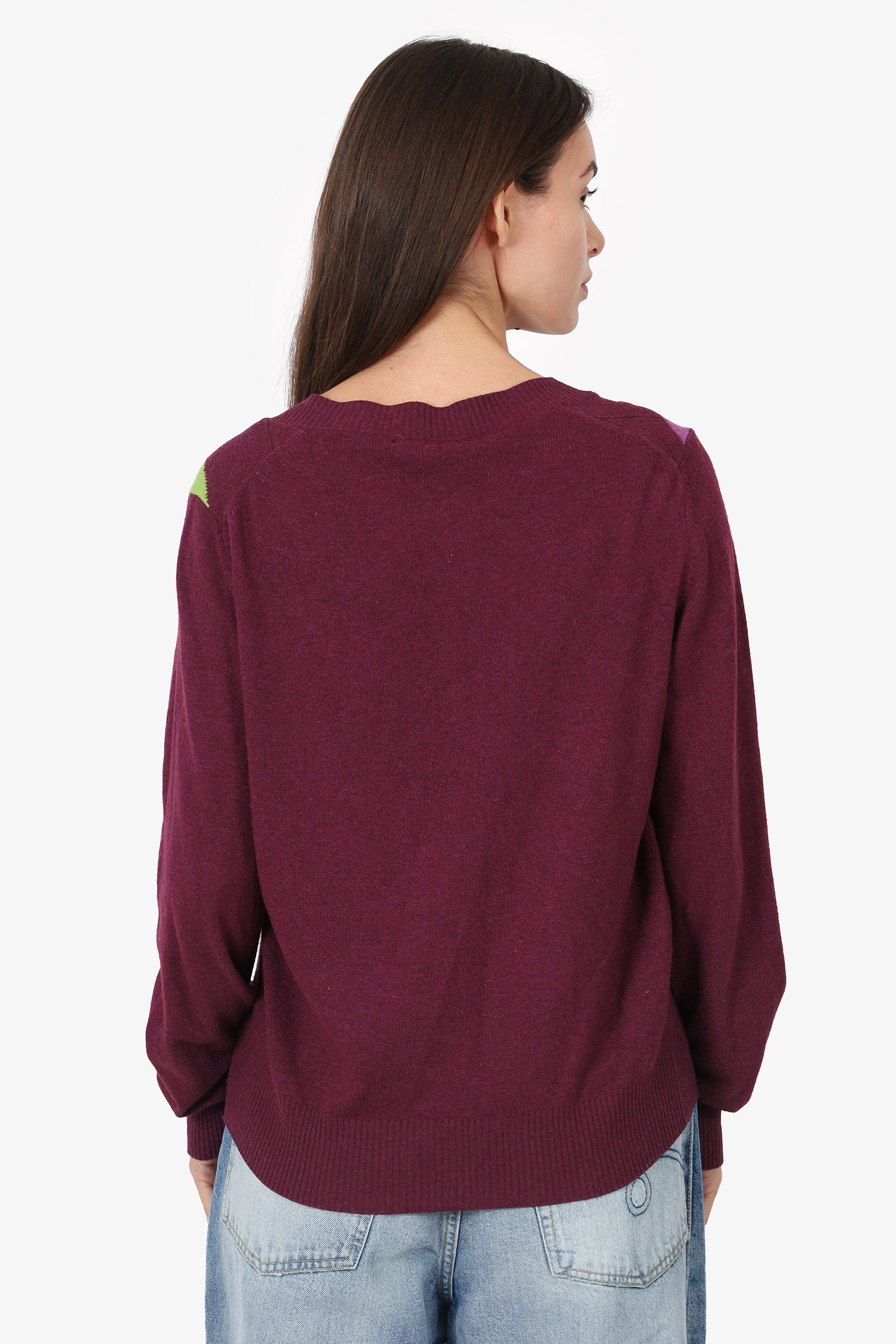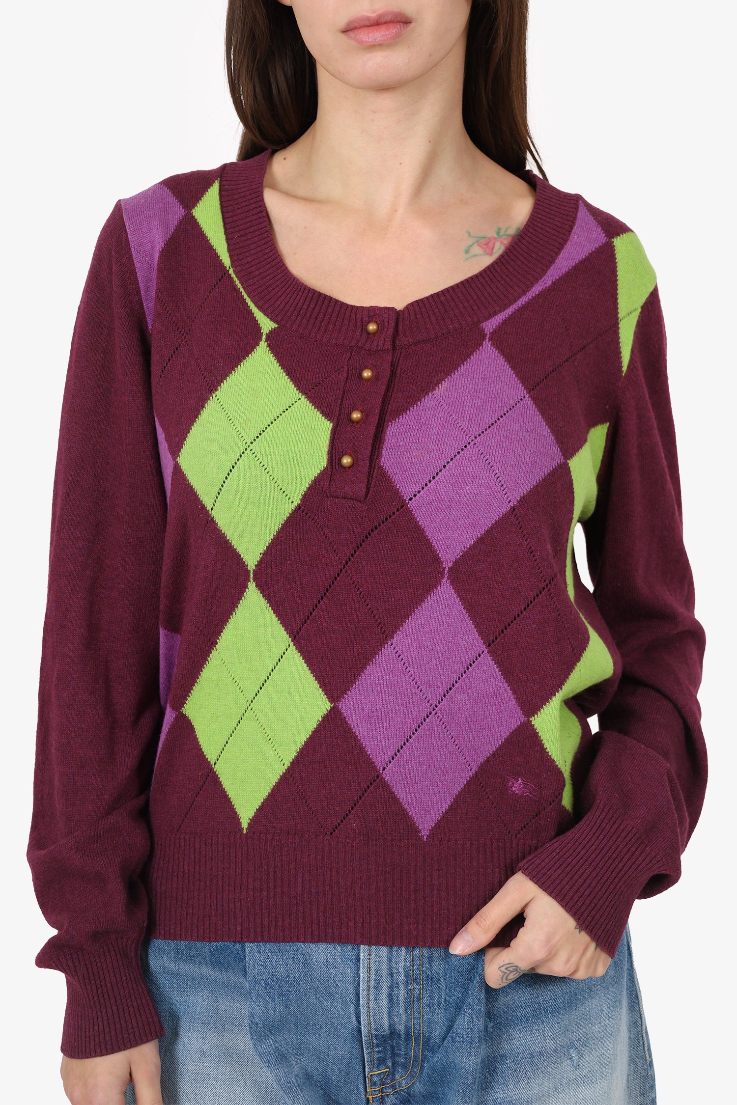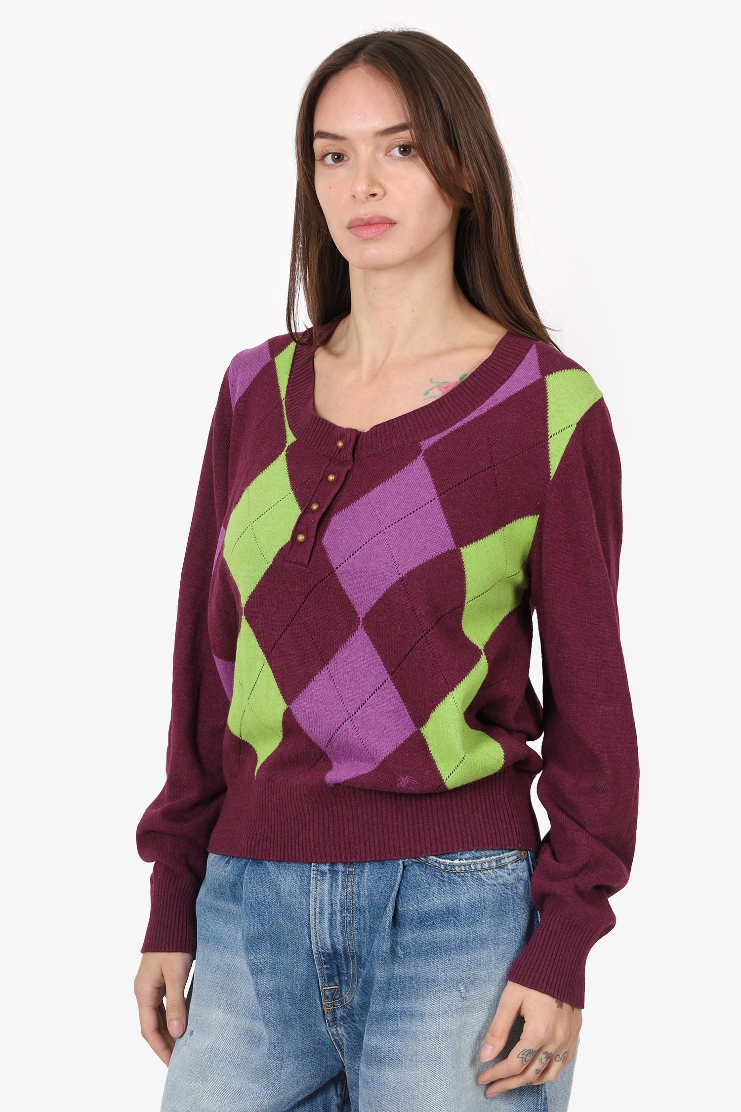 Refresh availabilityBurberry London Purple/Green Argyle Sweater. Pull-on. Round neckline. Front button-up closure. Ribbed neckline and bottom hem. Bronze-tone hardware. Tonal stitching.