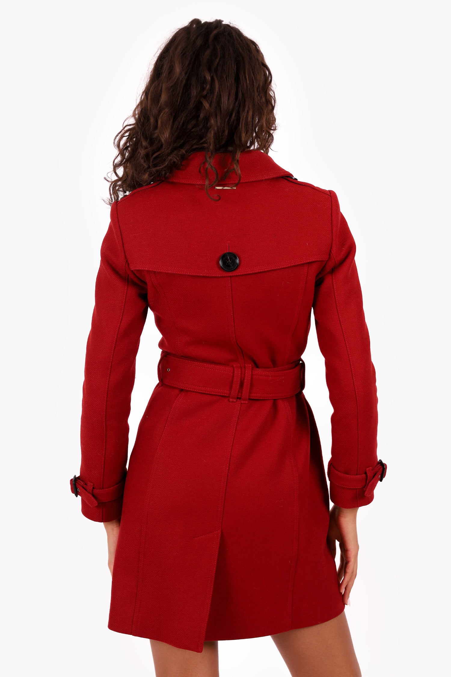 Refresh availabilityBurberry London Red Wool Single Breasted Coat. Pull-on. Collared neckline. Front button-up closure. Straps on shoulder with button-up closure. Sleeve cuffs with adjustable buckle closure. Removable belt at waistline with adjustable buckle closure. 2 front exterior side slip pockets. Padded shoulders. Lined interior. Tonal stitching.