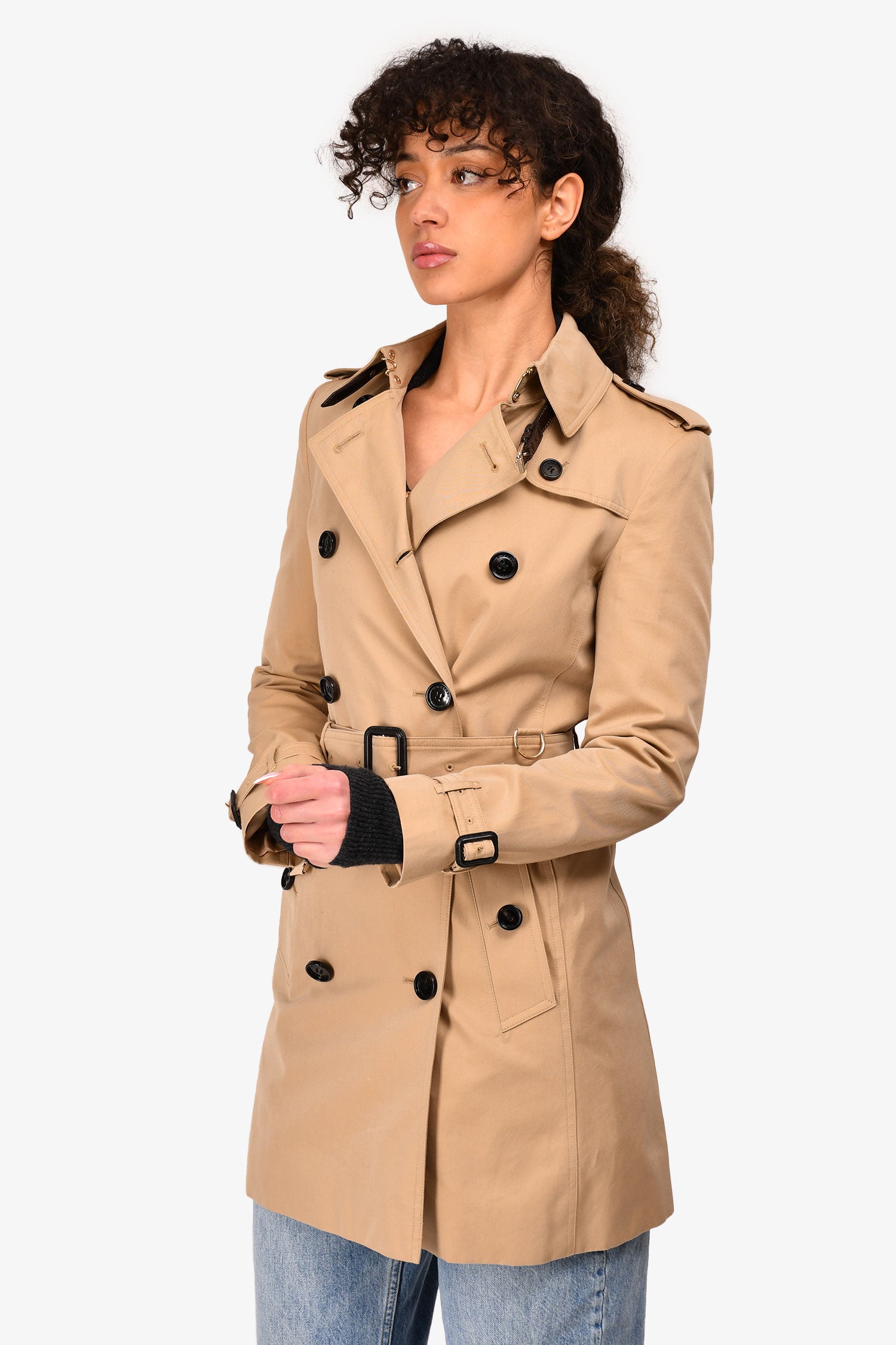 Refresh availabilityBurberry London Tan Short Belted Trench Coat. Front button-up closure. Collar buckle with hook closure. Side pockets with button closure. Sleeves with buckle closure. Removable/adjustable belt closure. Gold-tone hardware. Lined. Tonal stitching.