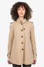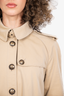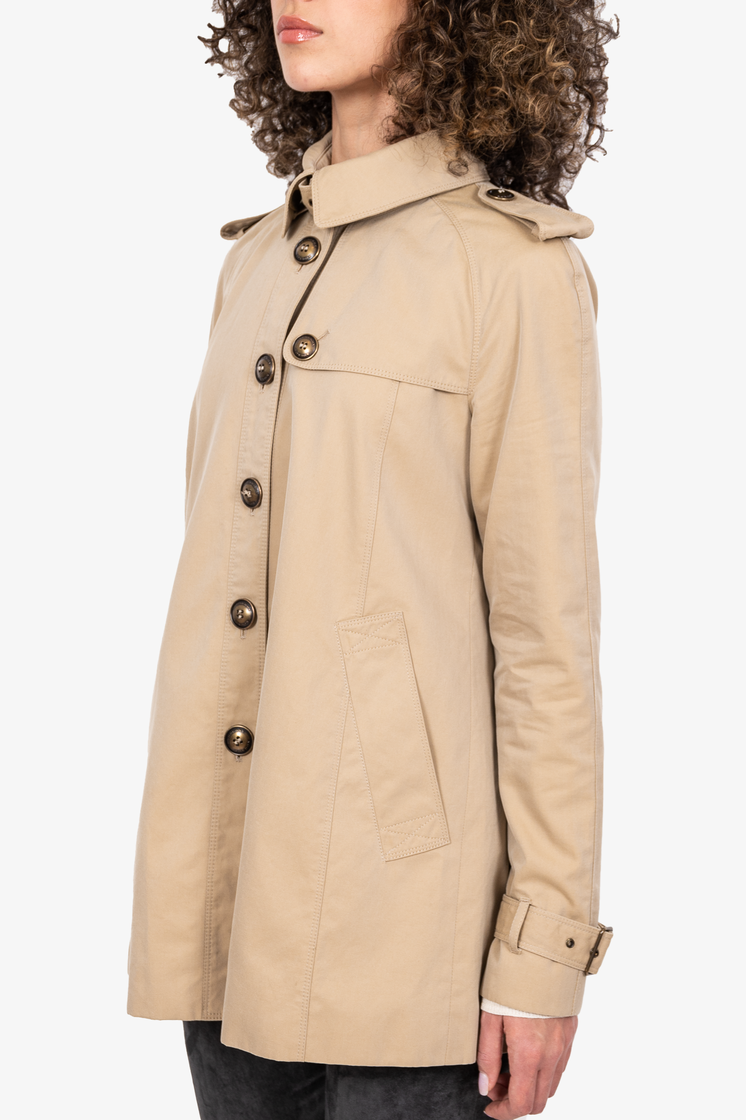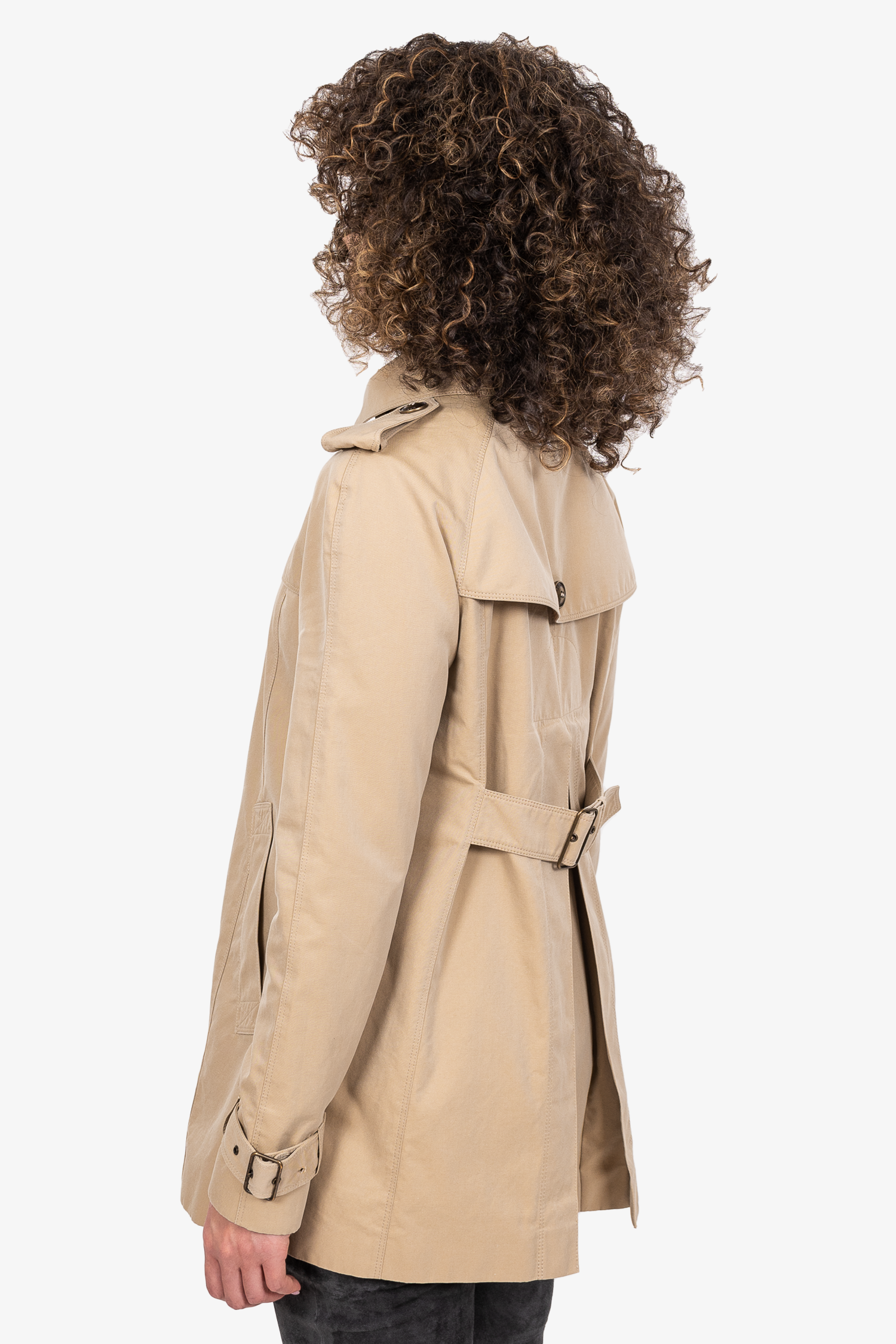 Refresh availabilityBurberry London Tan Short Trench Coat. Front button-up closure. Front pockets. Signature nova check lining. Strap with buckle closures on the cuffs. Tonal stitching.