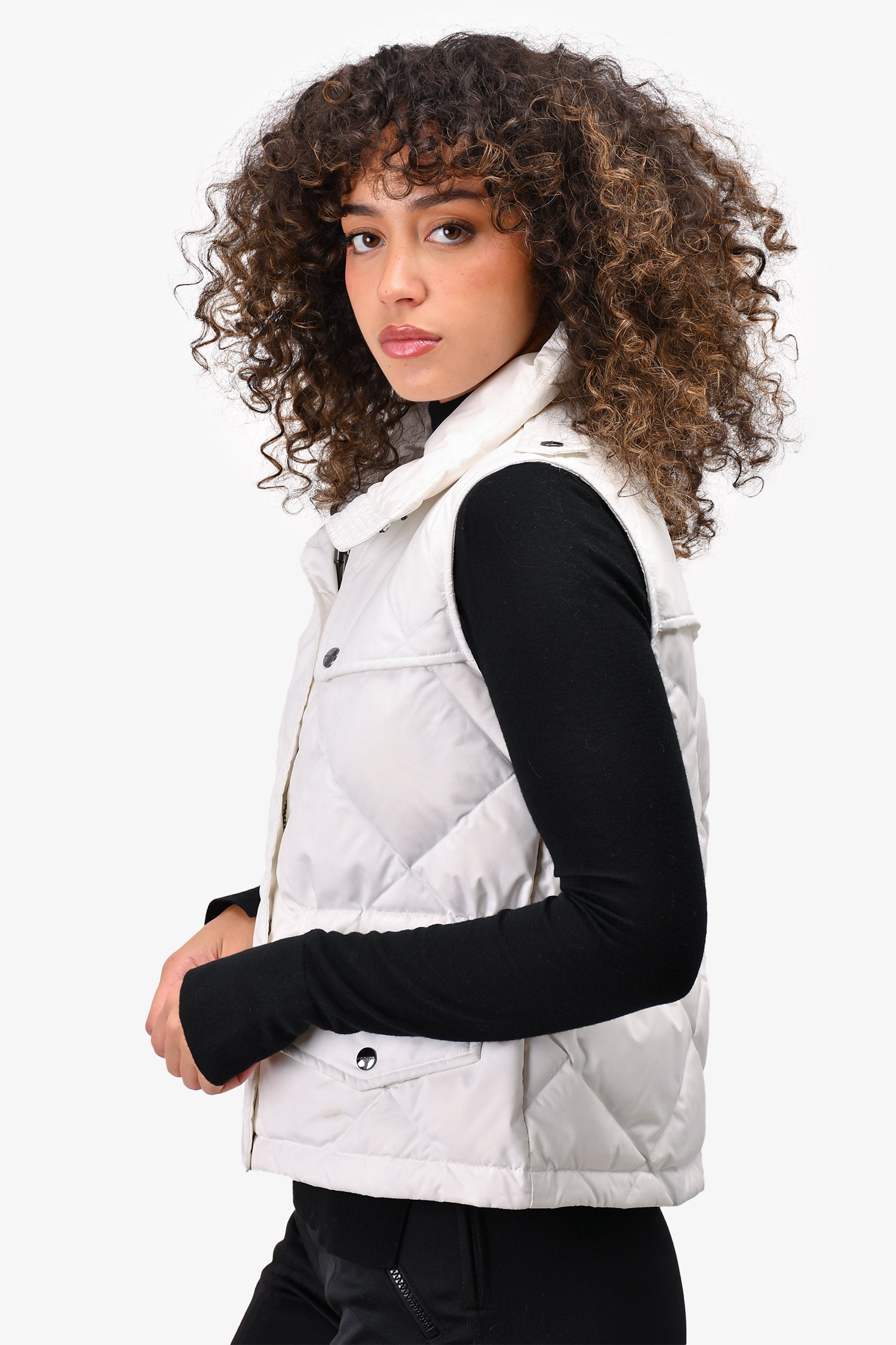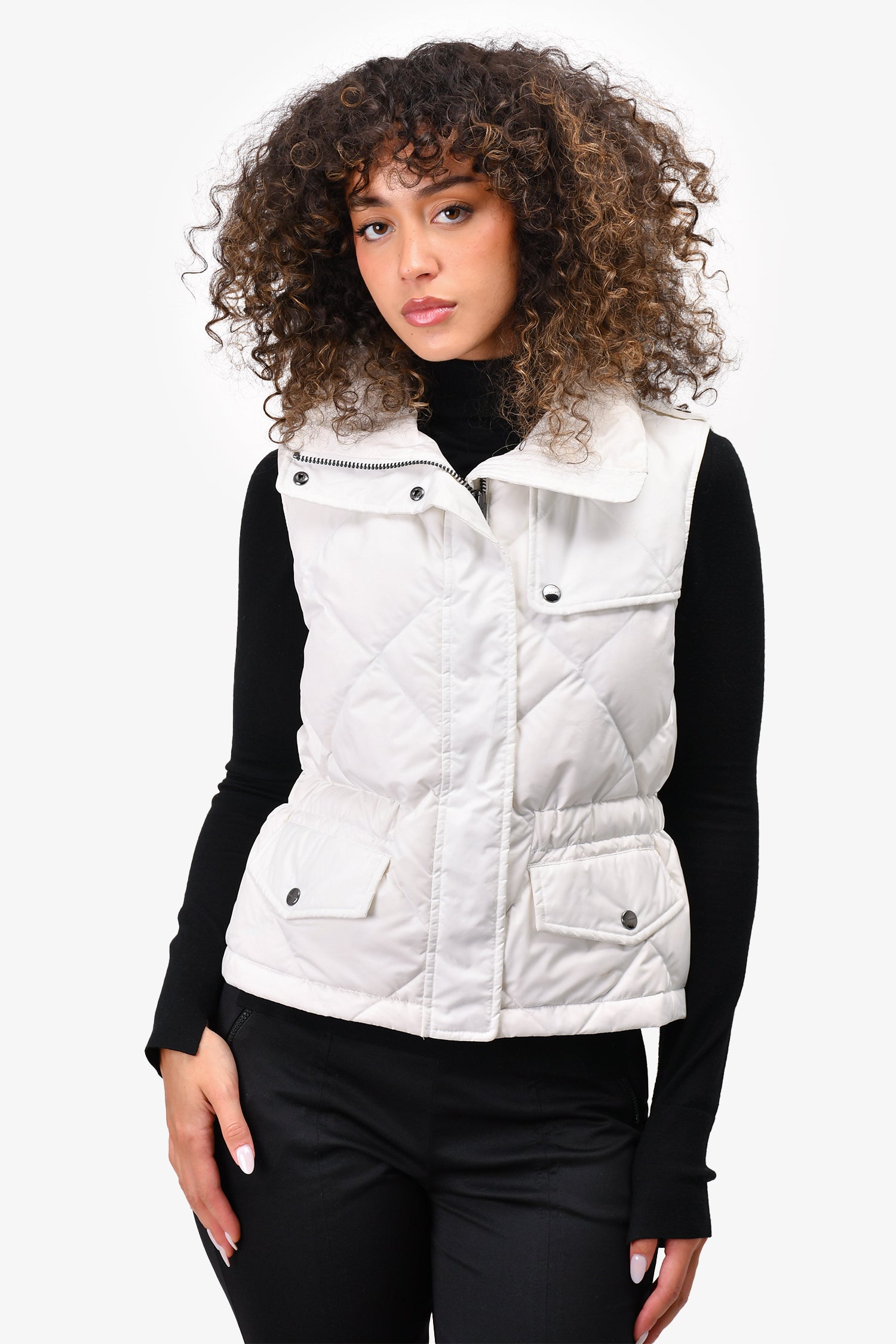 Refresh availabilityBurberry London White Down Zip Vest. Front two-way zip and snap-button closures. Front pockets with snap-button closure. Signature nova check interior lining.