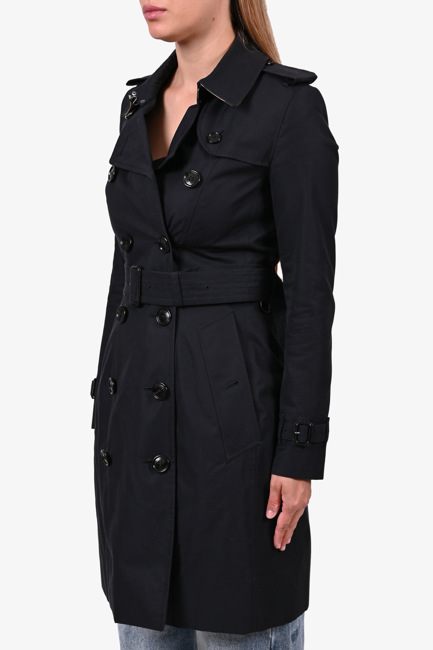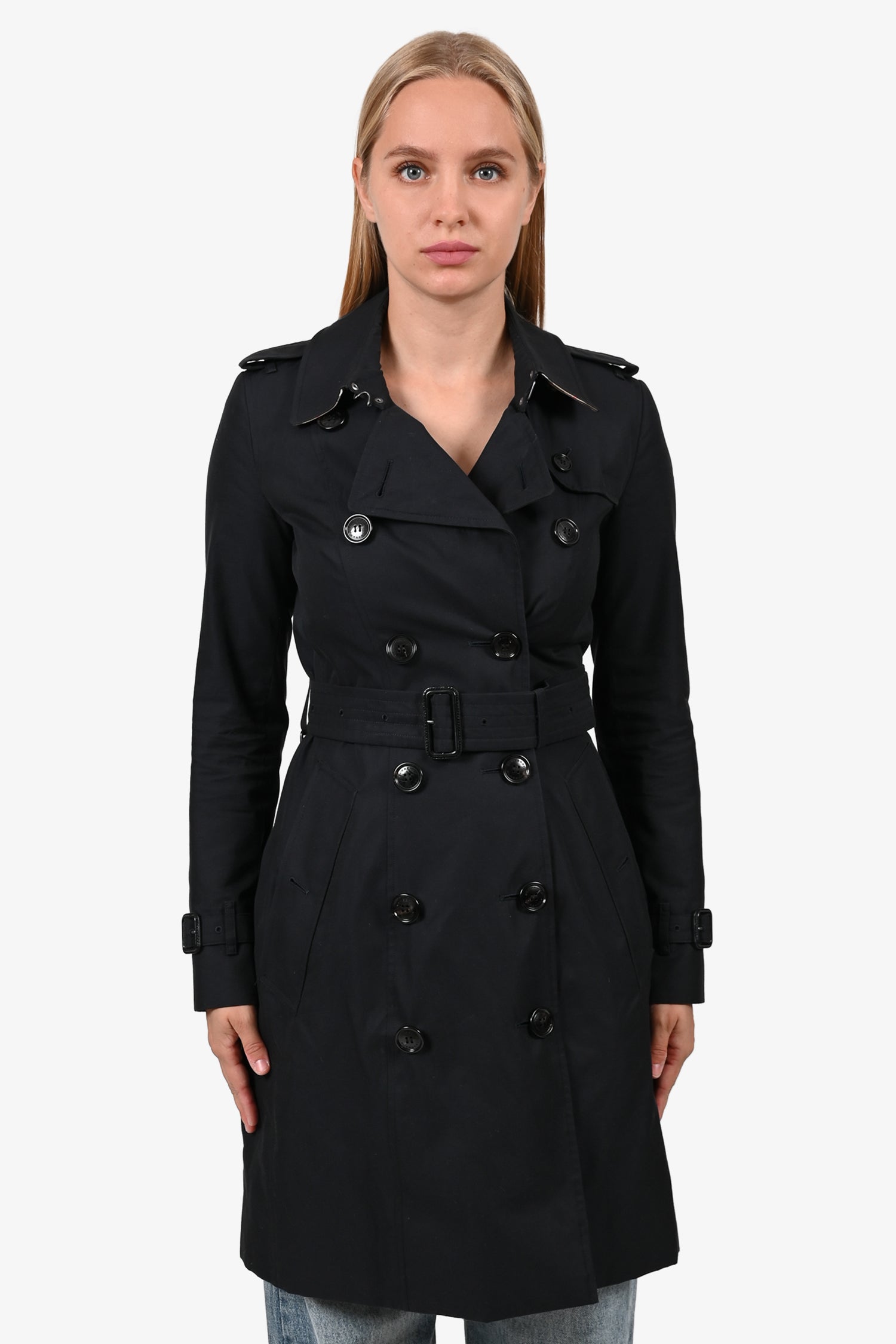 Refresh availabilityBurberry Navy Blue Cotton 'Chelsea' Trench Coat with Belt. Front button-up closure. Front pockets with button closure. Signature nova check interior lining. Tonal stitching.