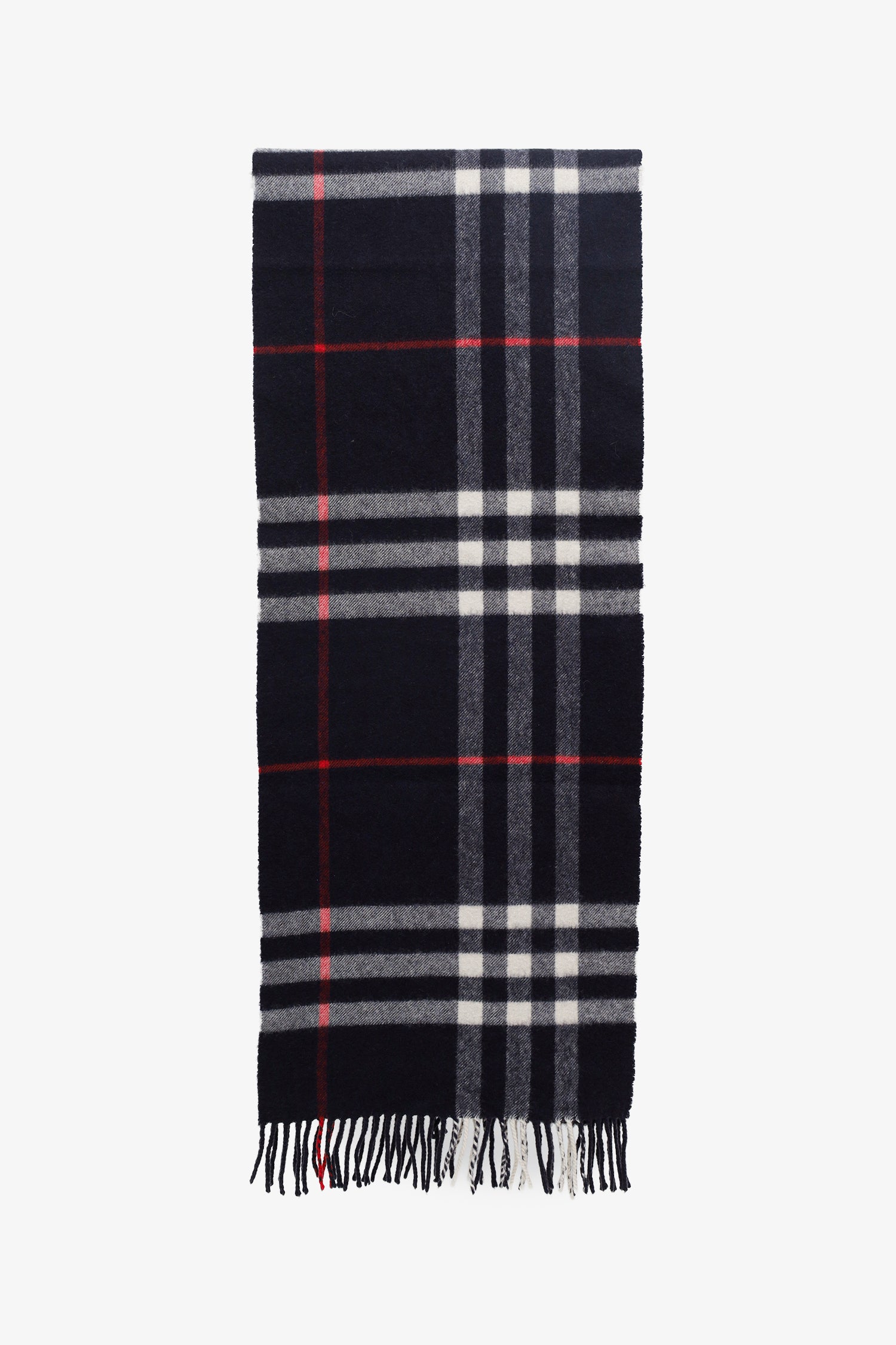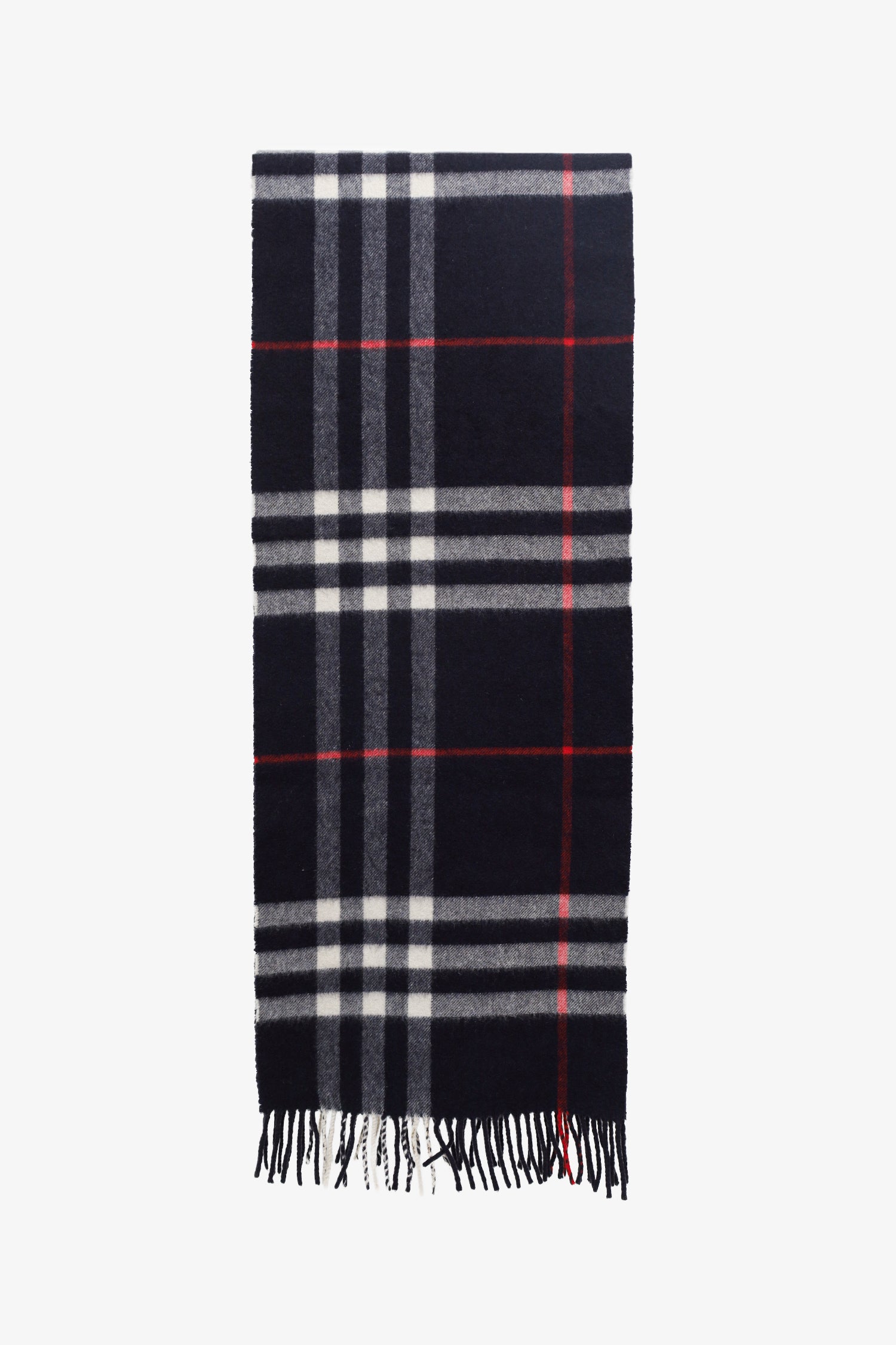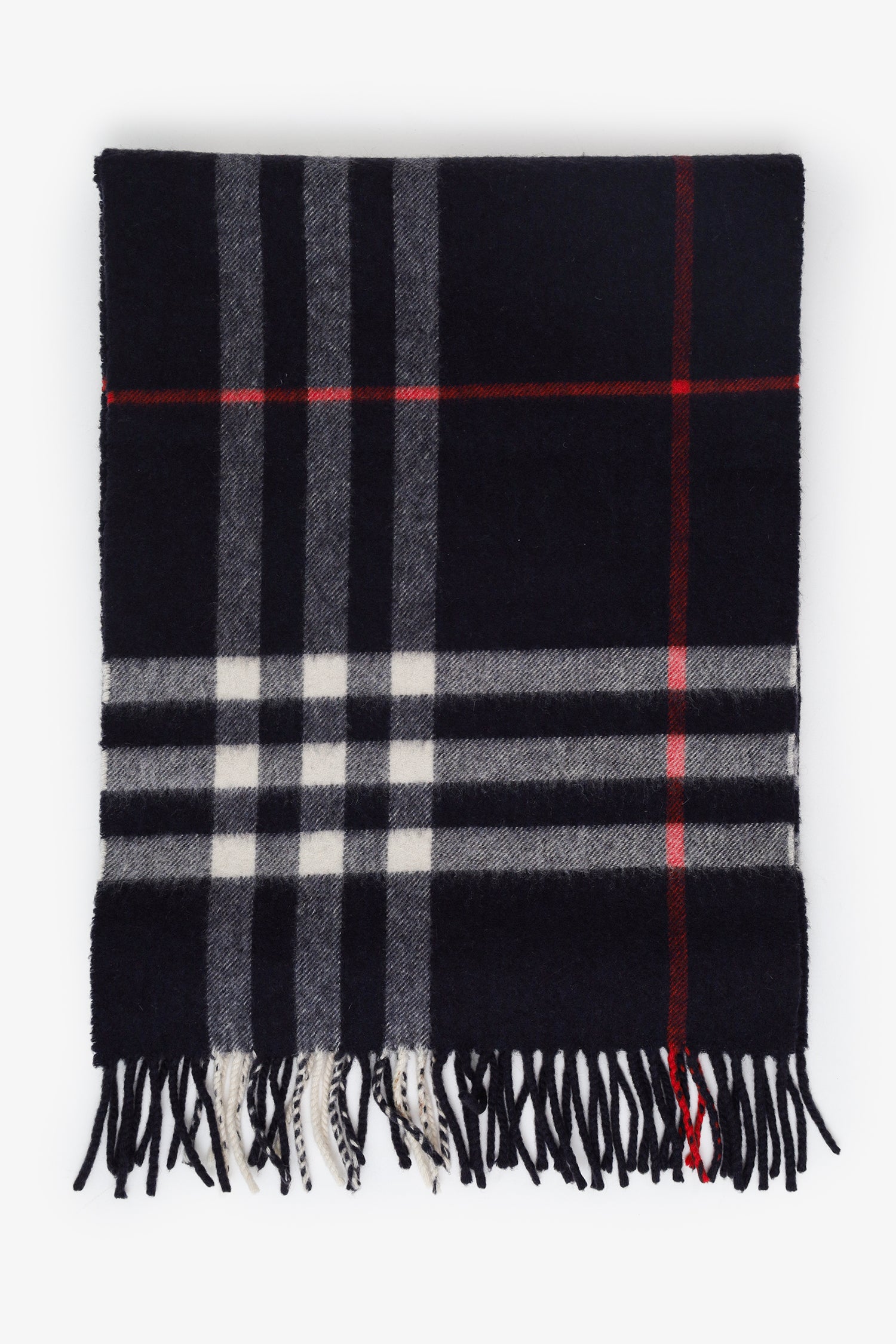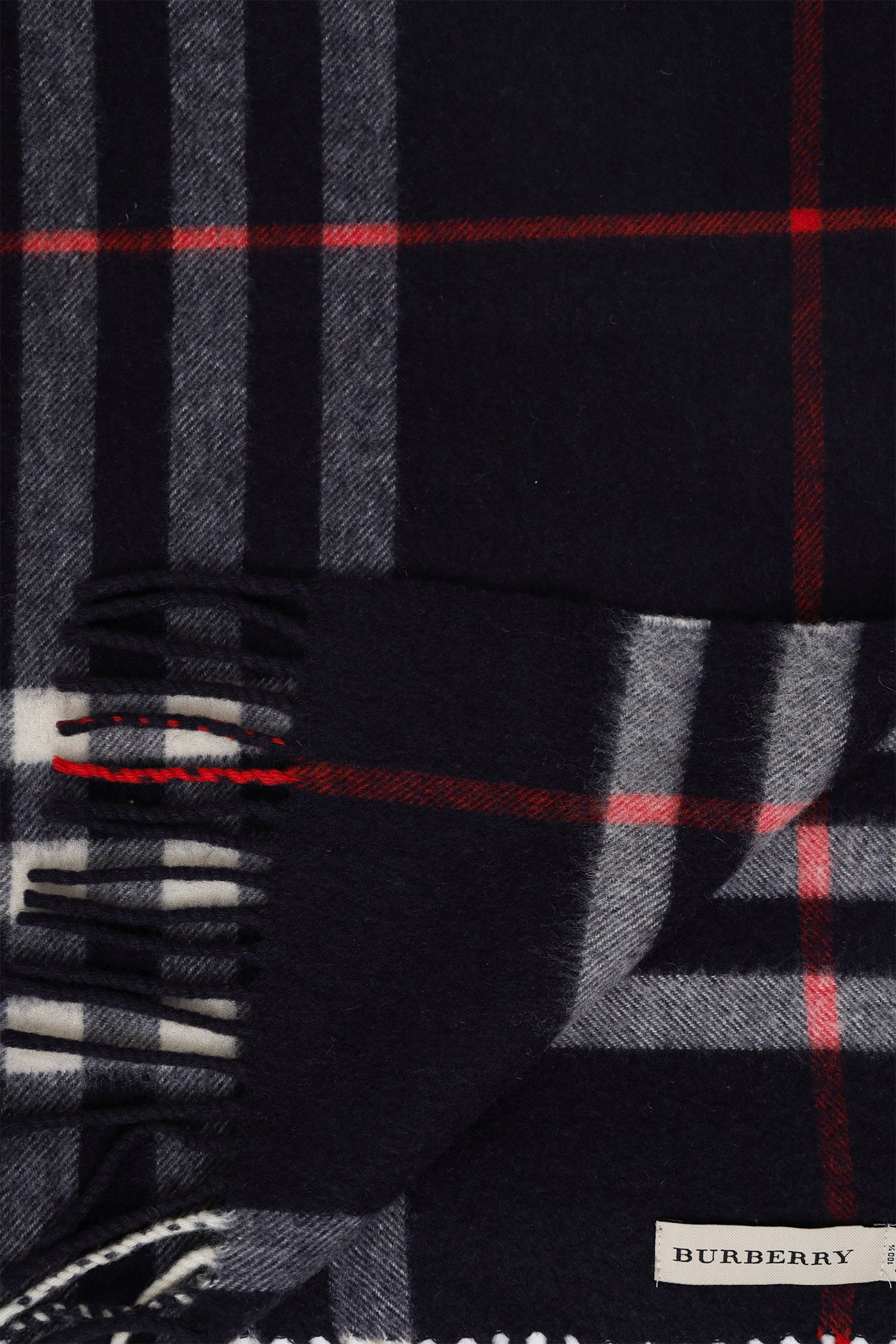 Refresh availabilityBurberry Navy Cashmere Nova Check Fringe Scarf. Fringe detail. Tonal stitching.