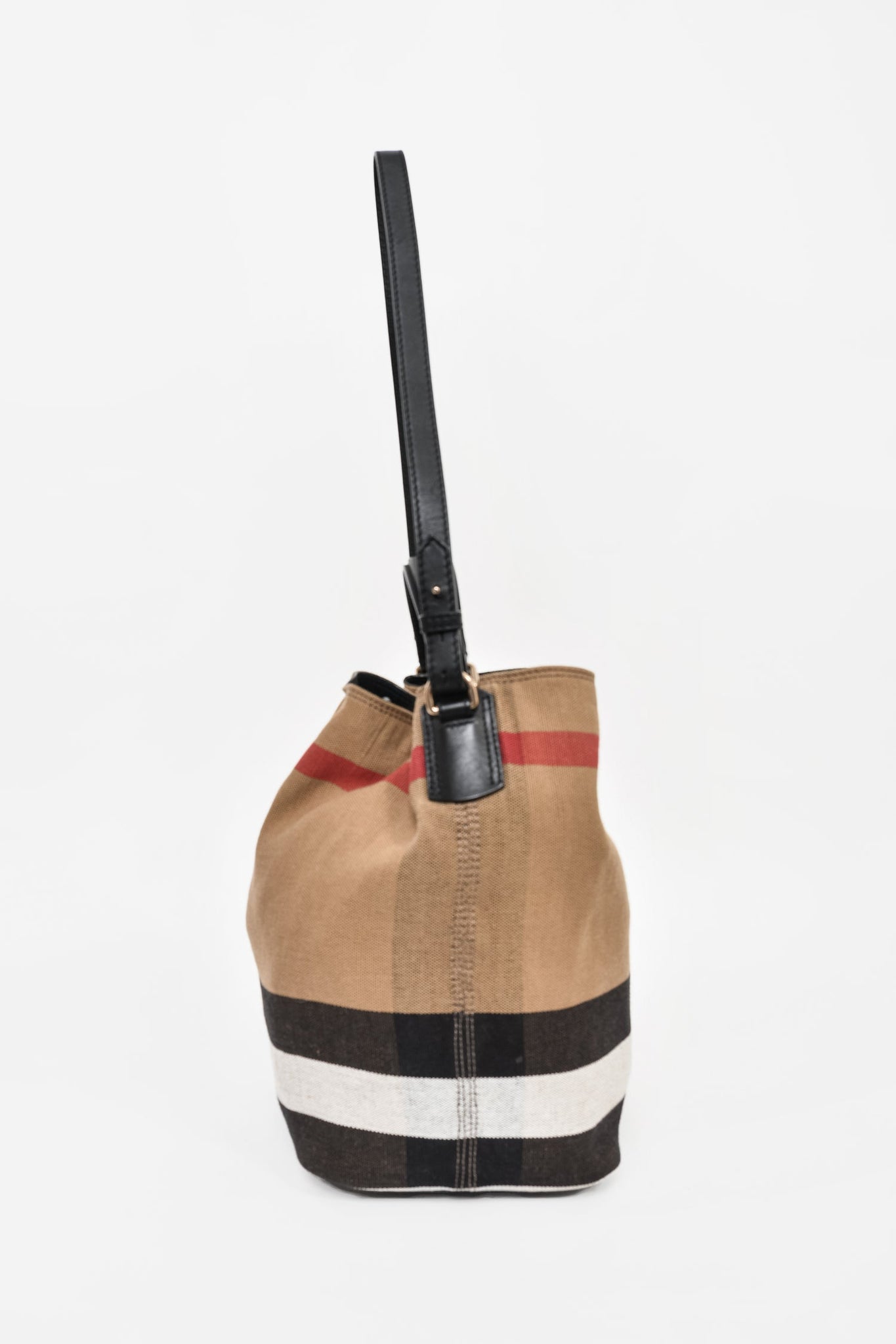 Burberry Nova Check Linen/White Leather Ashby Bucket Bag. Top handle. Interior latch closure. Detachable interior zip pouch. Adjustable and removable strap. Silver-tone hardware. Protective metal bottom. Tonal stitching.