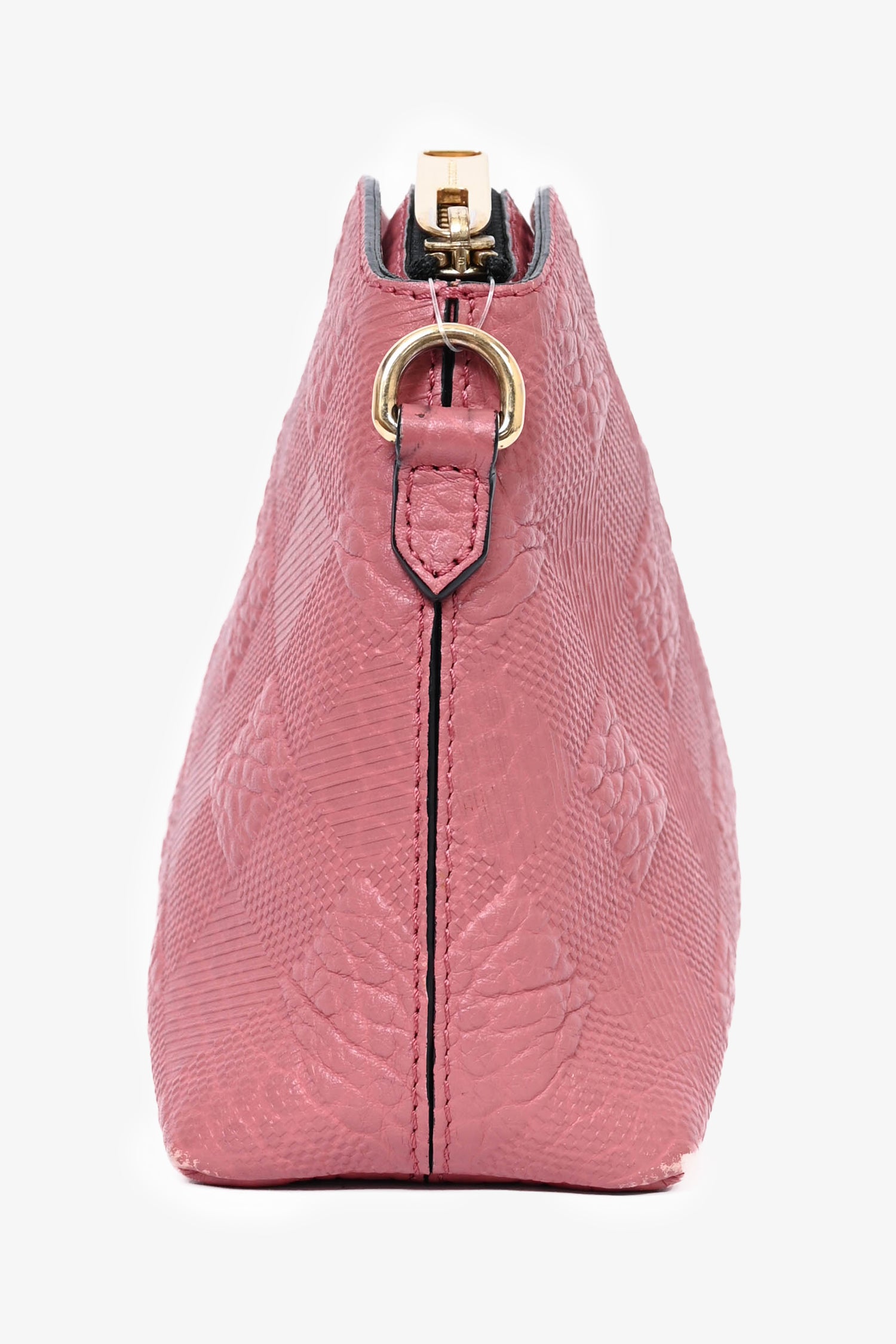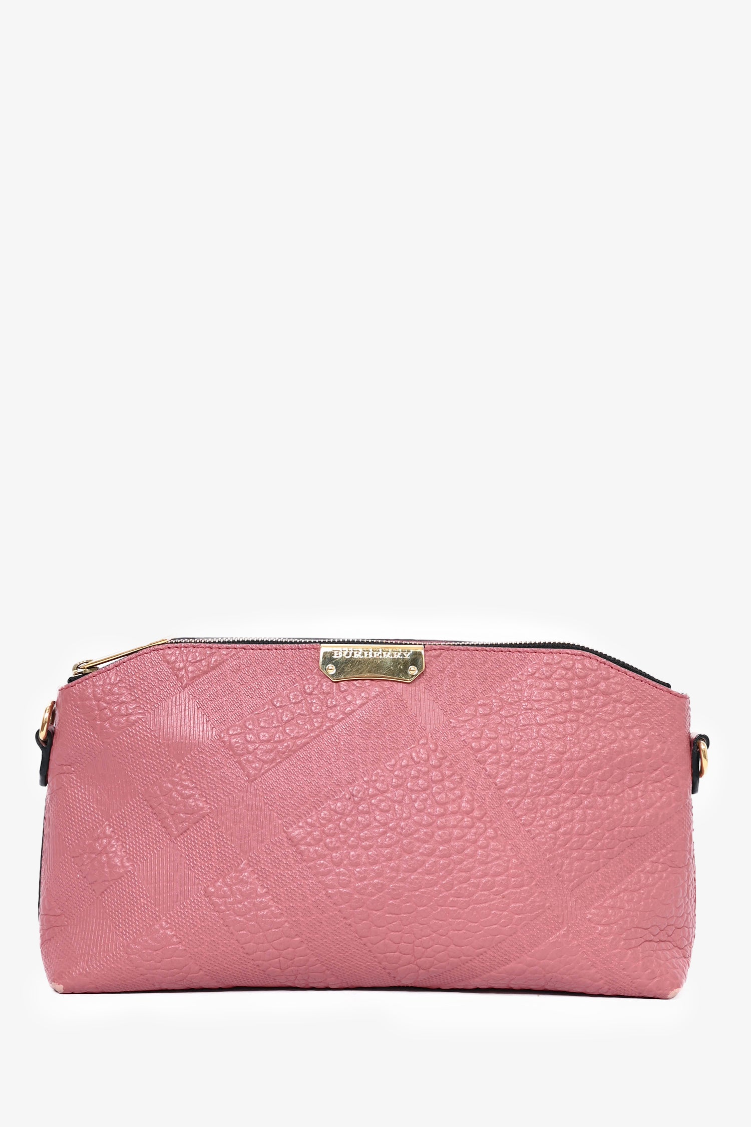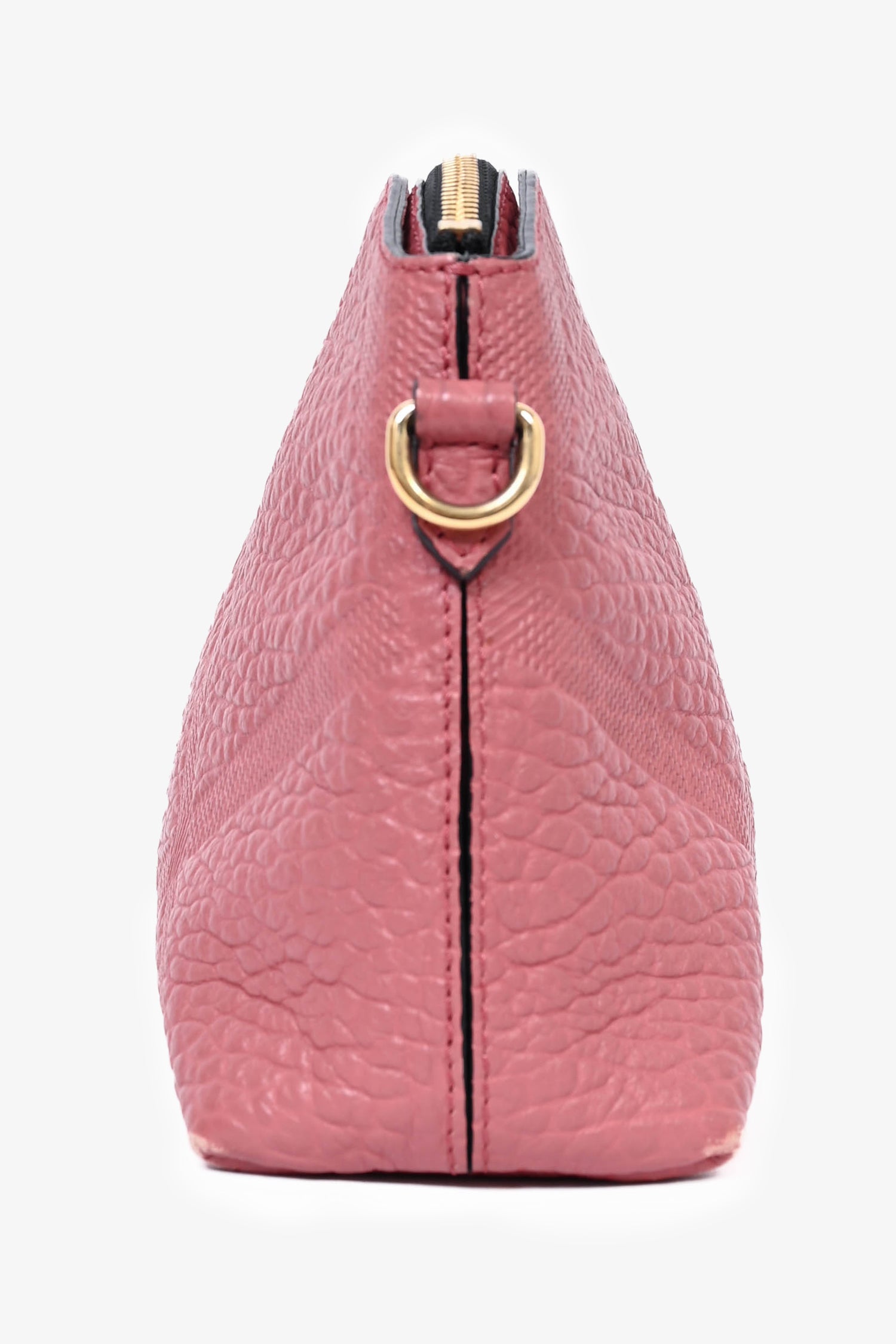 Refresh availabilityBurberry Pink Textured Leather Crossbody Bag. Top zip closure. Open interior. Textile lined interior. Interior zip pocket. Exterior slip pocket with magnetic closure. Removable adjustable shoulder strap. Gold tone hardware. Tonal stitching.