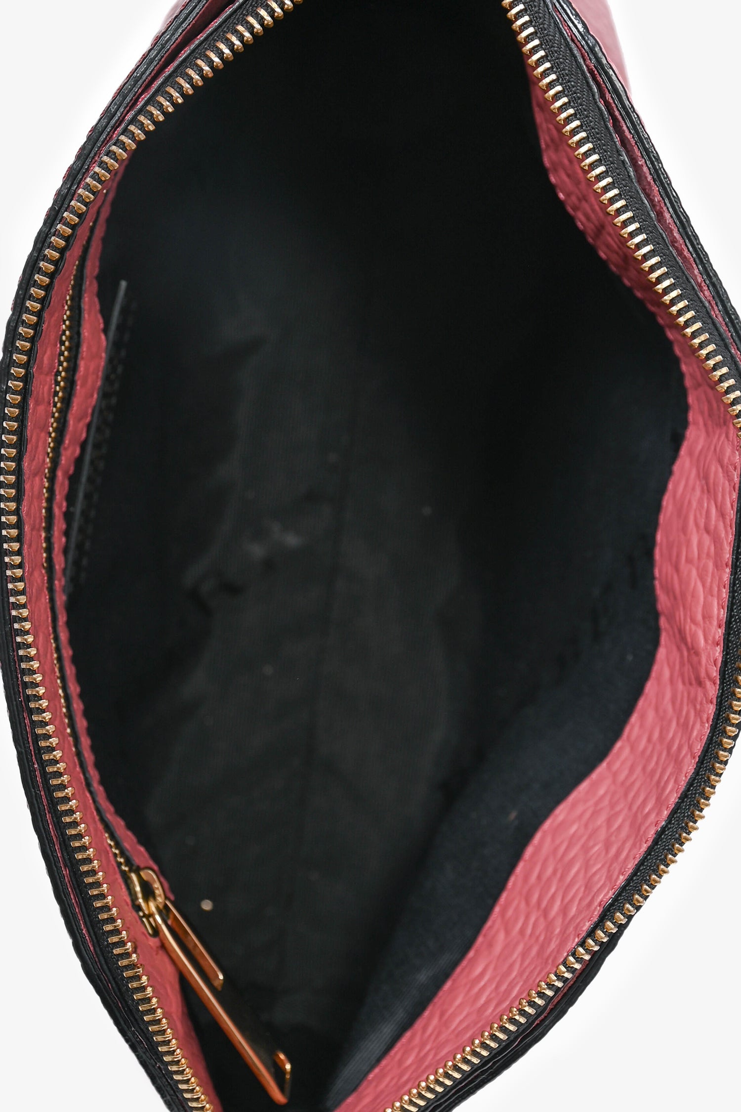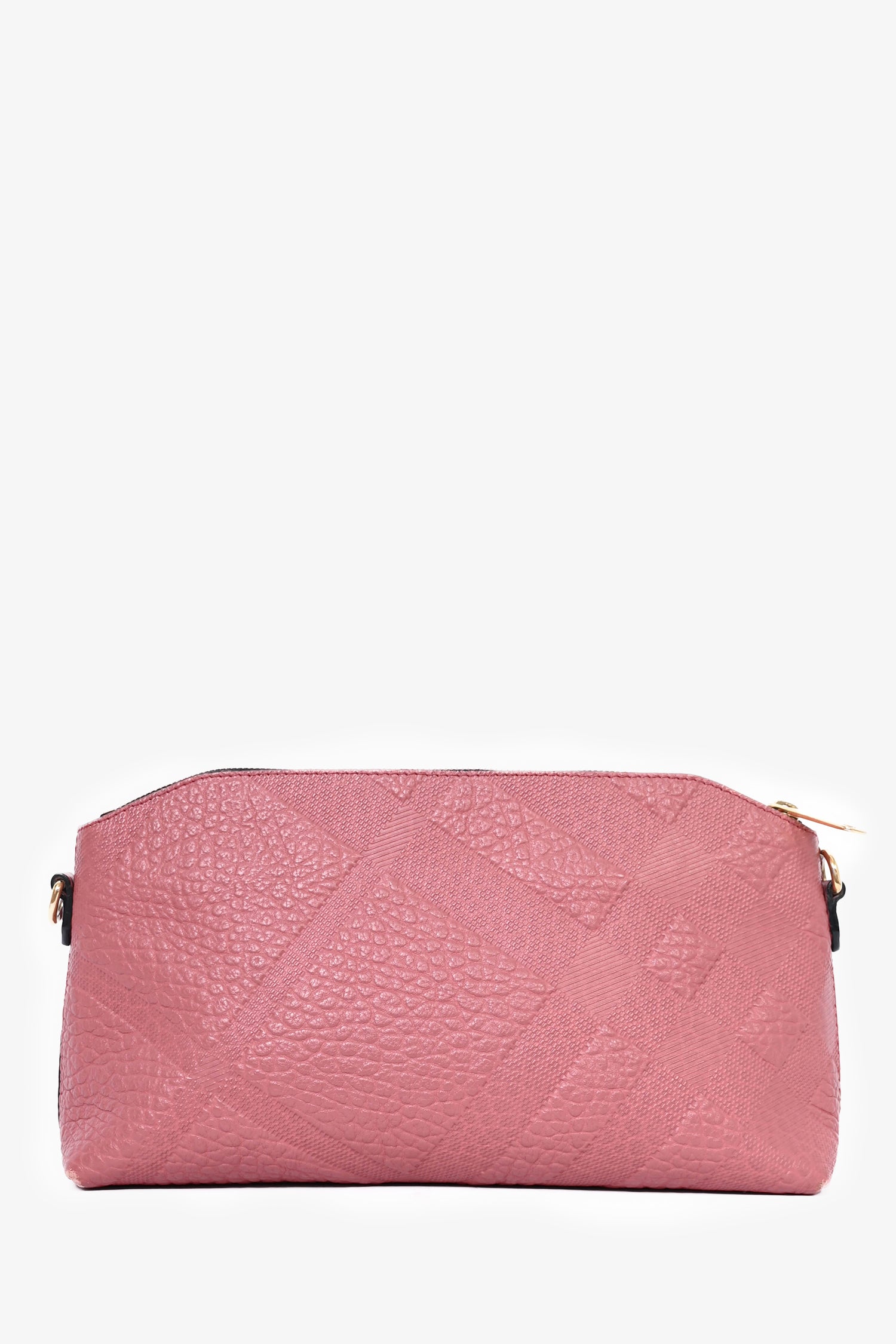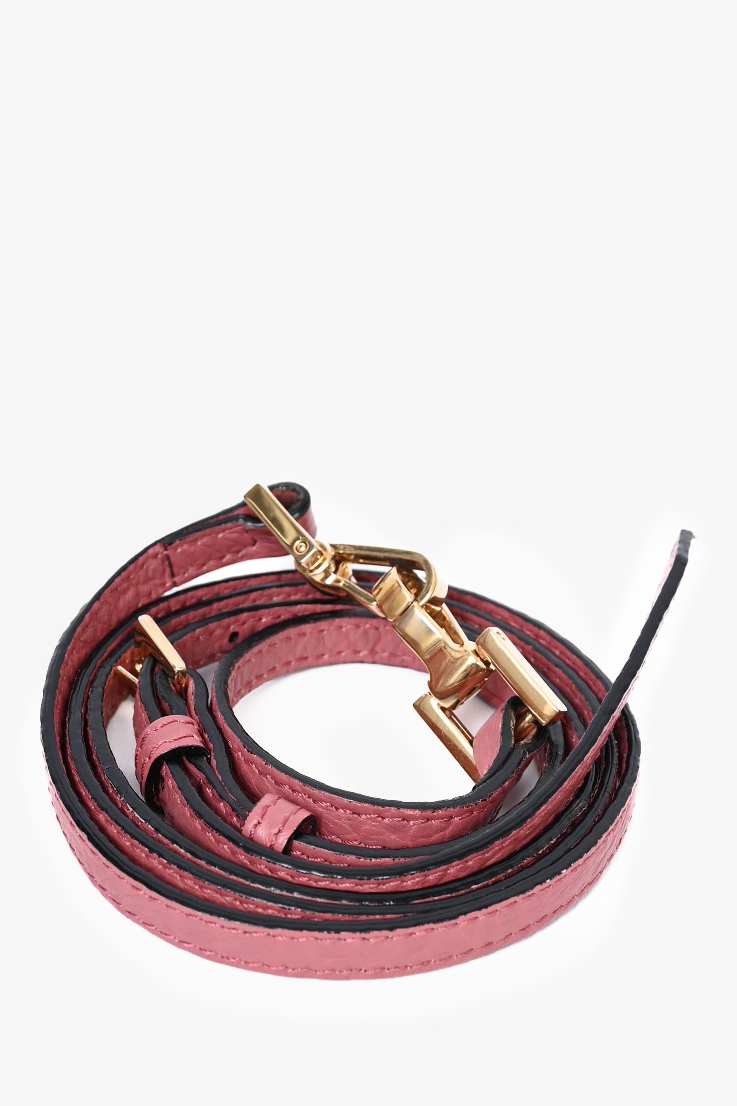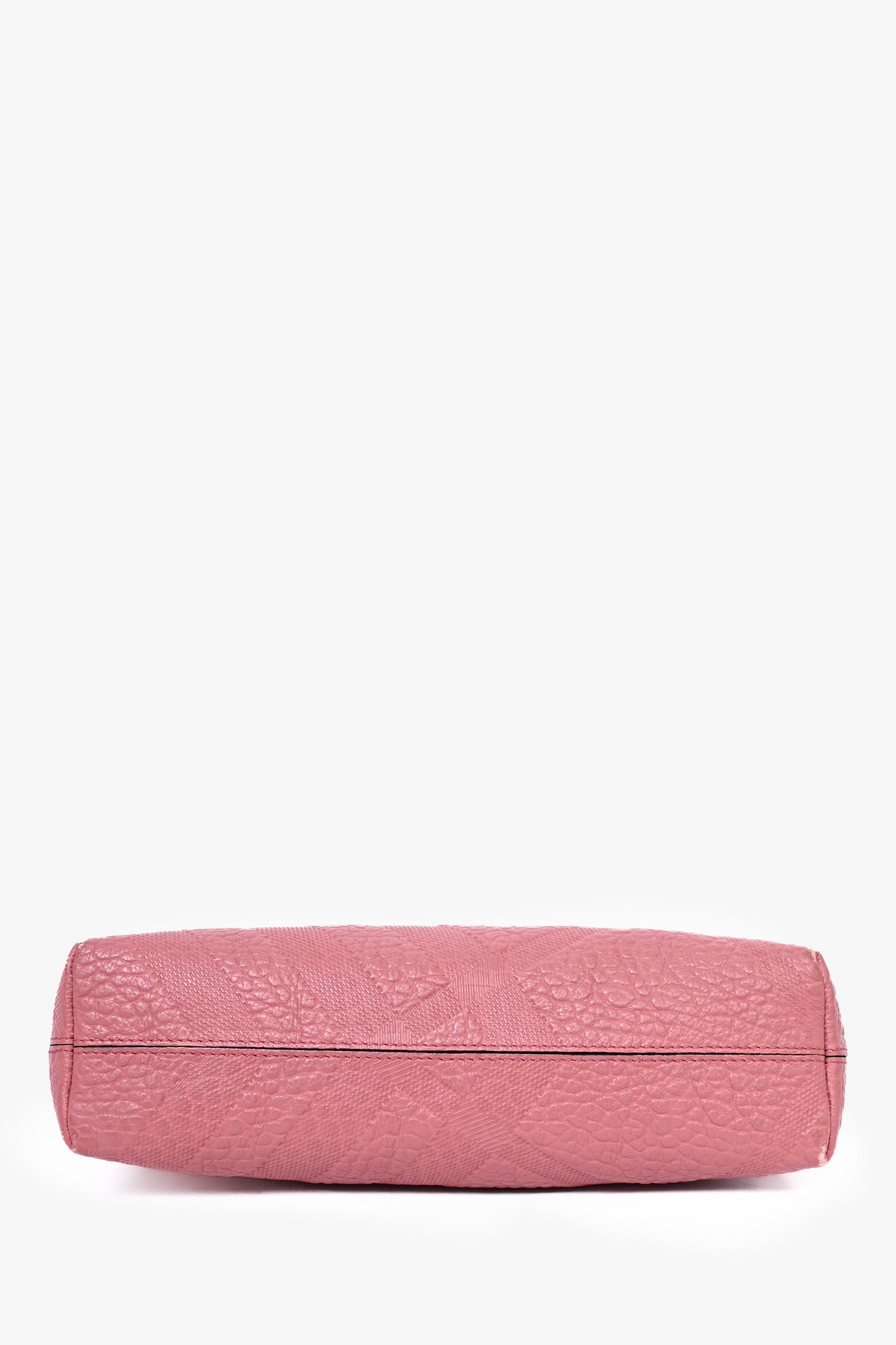 Refresh availabilityBurberry Pink Textured Leather Crossbody Bag. Top zip closure. Open interior. Textile lined interior. Interior zip pocket. Exterior slip pocket with magnetic closure. Removable adjustable shoulder strap. Gold tone hardware. Tonal stitching.