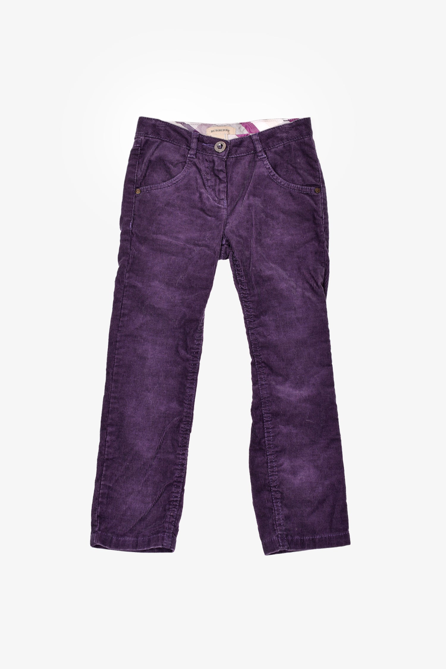 Refresh availabilityBurberry Purple Cords. Zip and button fly. 4 pocket design. Belt loops. Nova check interior trim lining. Tonal stitching and hardware.