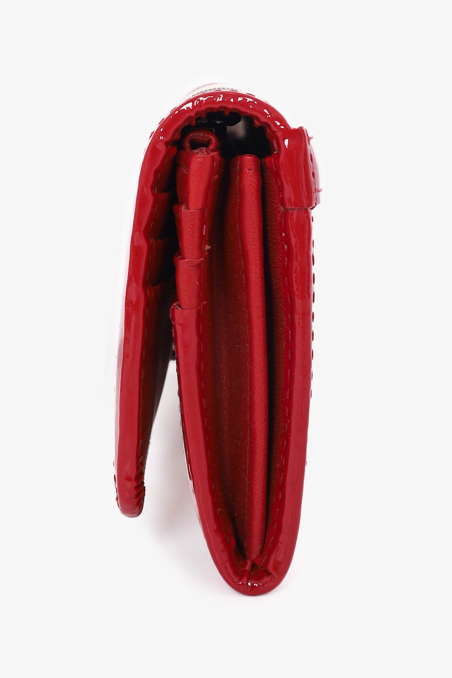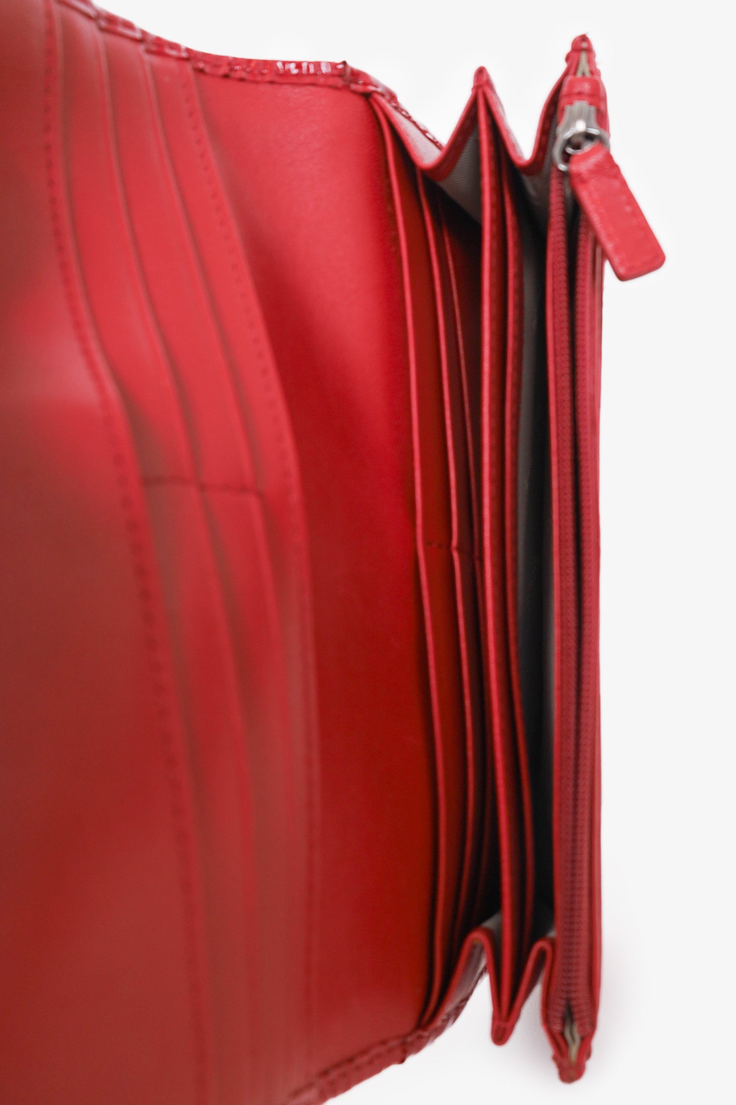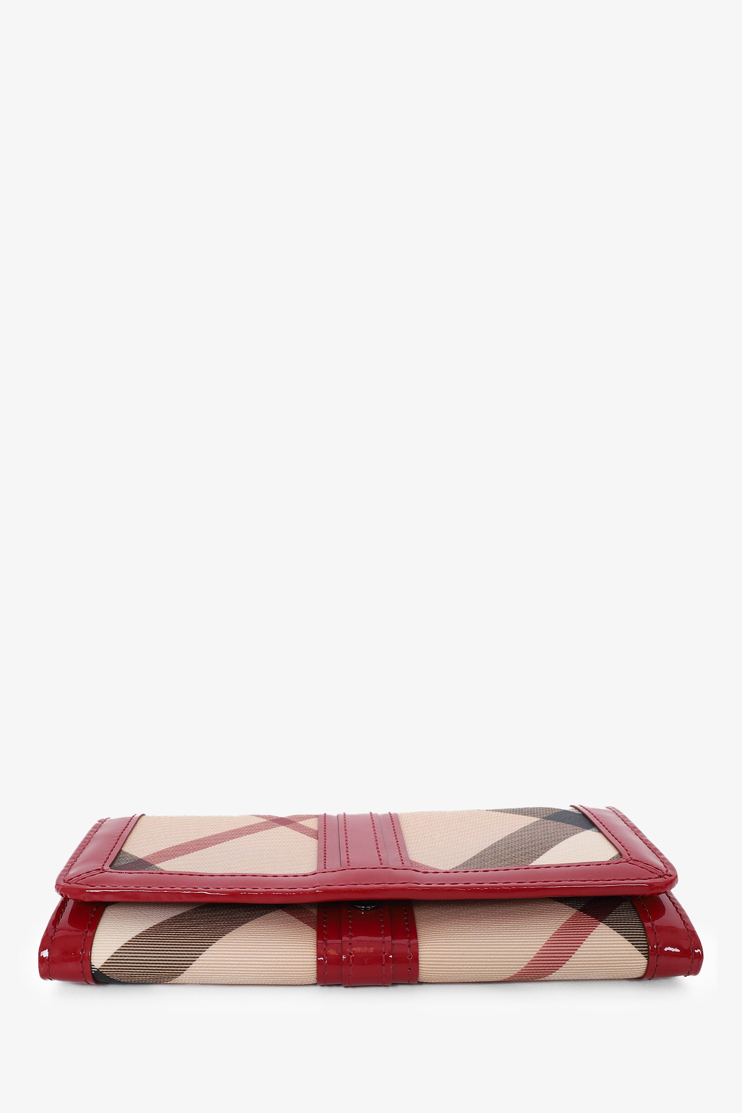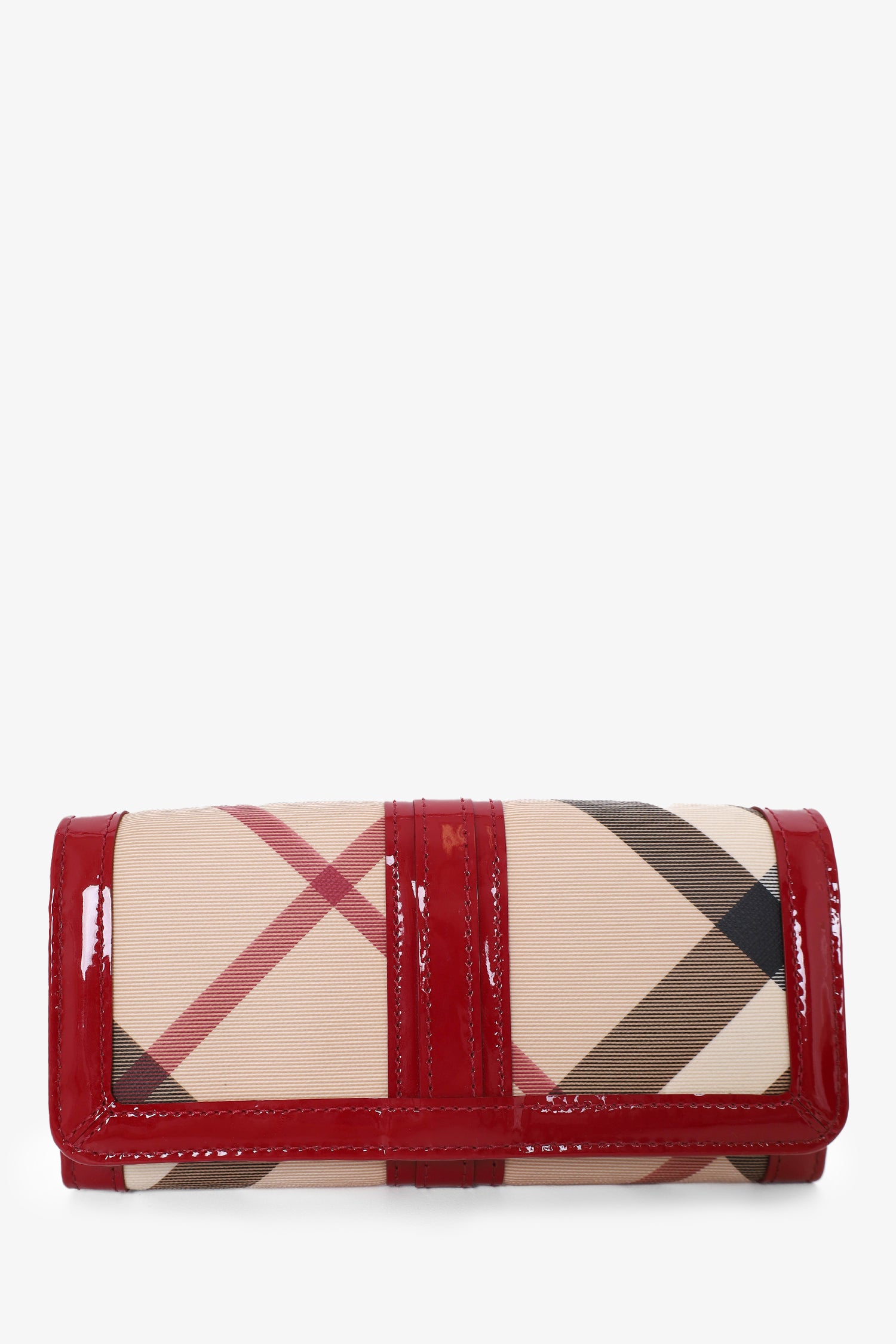 Refresh availabilityBurberry Red/Beige Patent Leather Check Zip Wallet. Front snap closure. 16 card slots. 4 bill compartments. 1 zip compartments. 1 exterior compartment. Gunmetal-toned hardware. Tonal stitching.