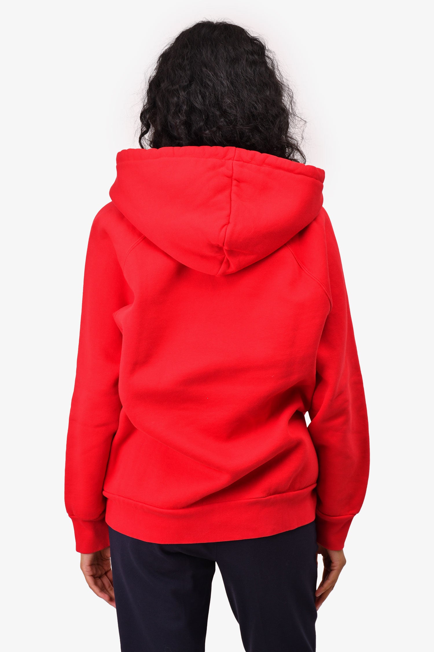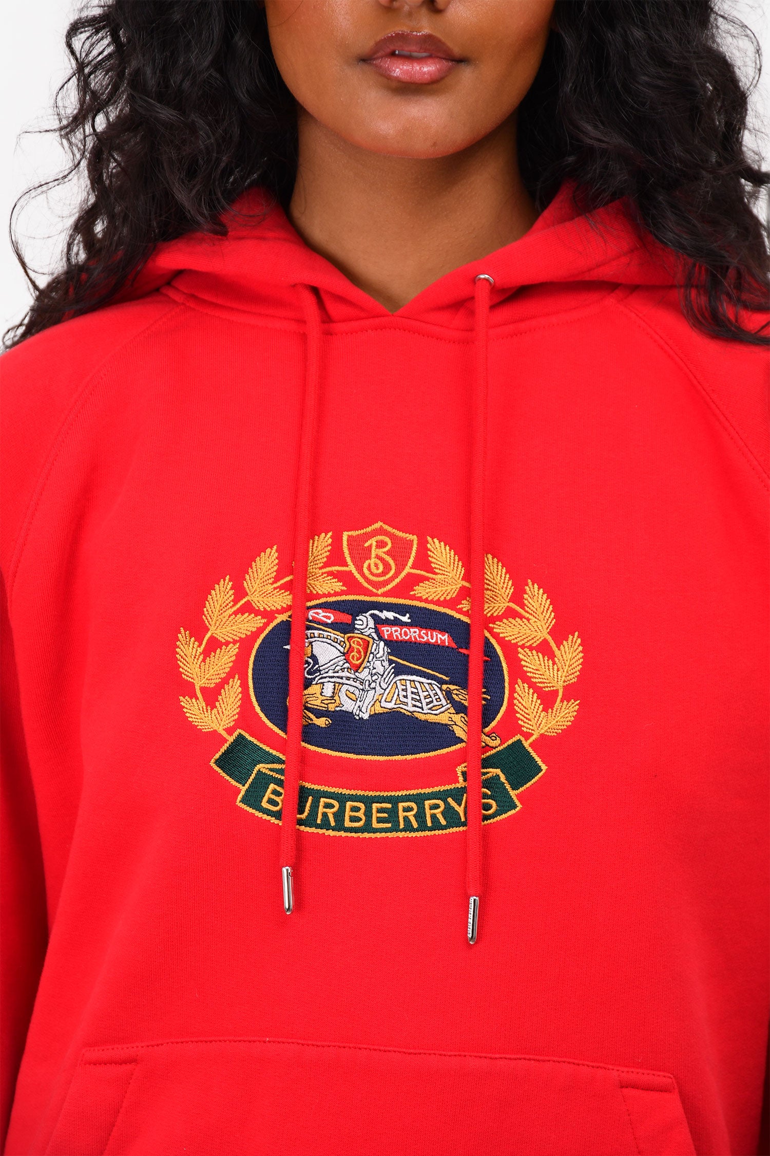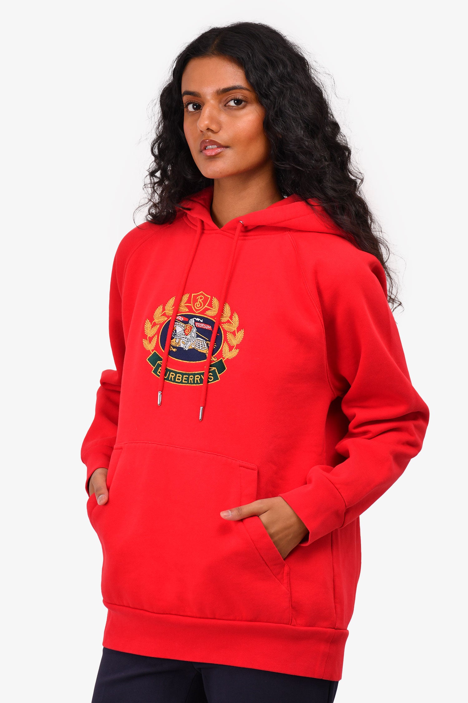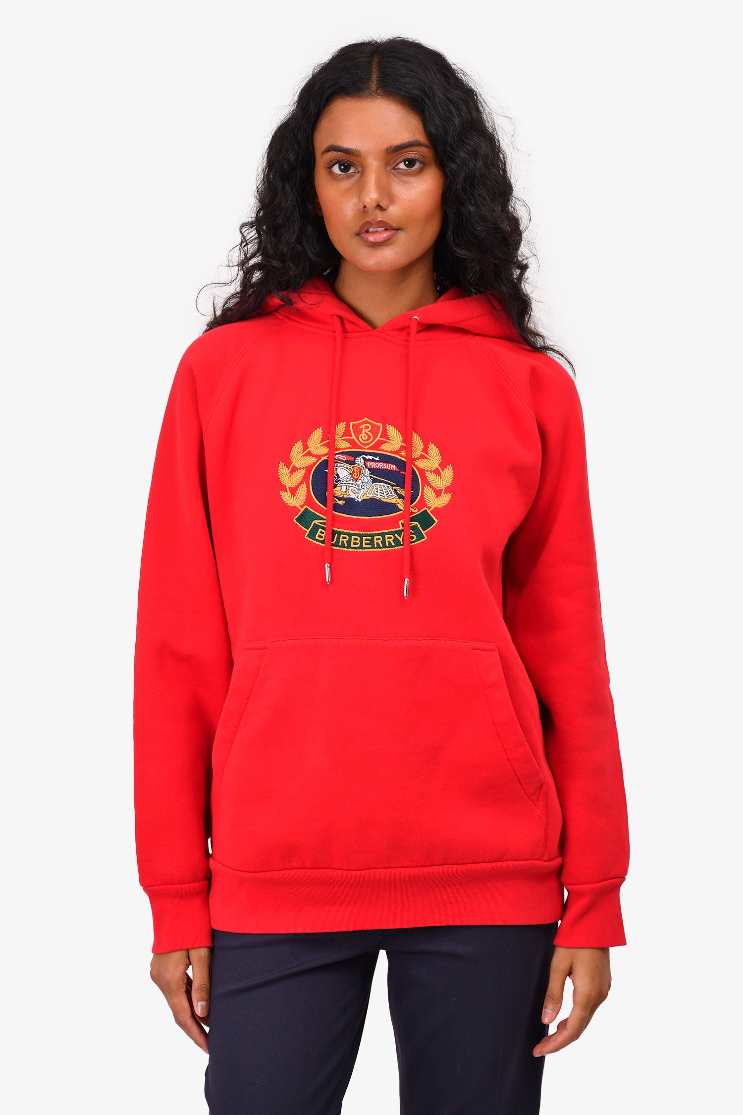 Refresh availabilityBurberry Red Logo Embroidered Hoodie. Long sleeved. Front pocket. Attached hoodie with drawstrings.