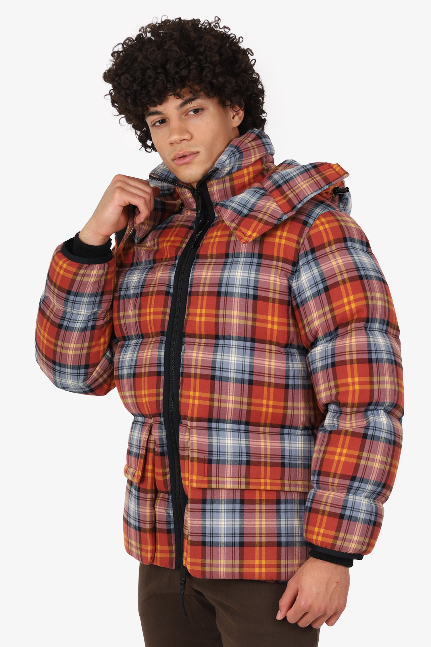 Refresh availabilityBurberry Red Quilted Checked Cotton-Twill Down Hooded Jacket. Pull-on. High neckline. Detachable hood with zip and snap-button-up closure. 2-way front zip closure. 2 exterior front-fold-over-flap pockets. Cinch cord to waistline. Lined interior with single zip pocket. Contrast and tonal stitching.