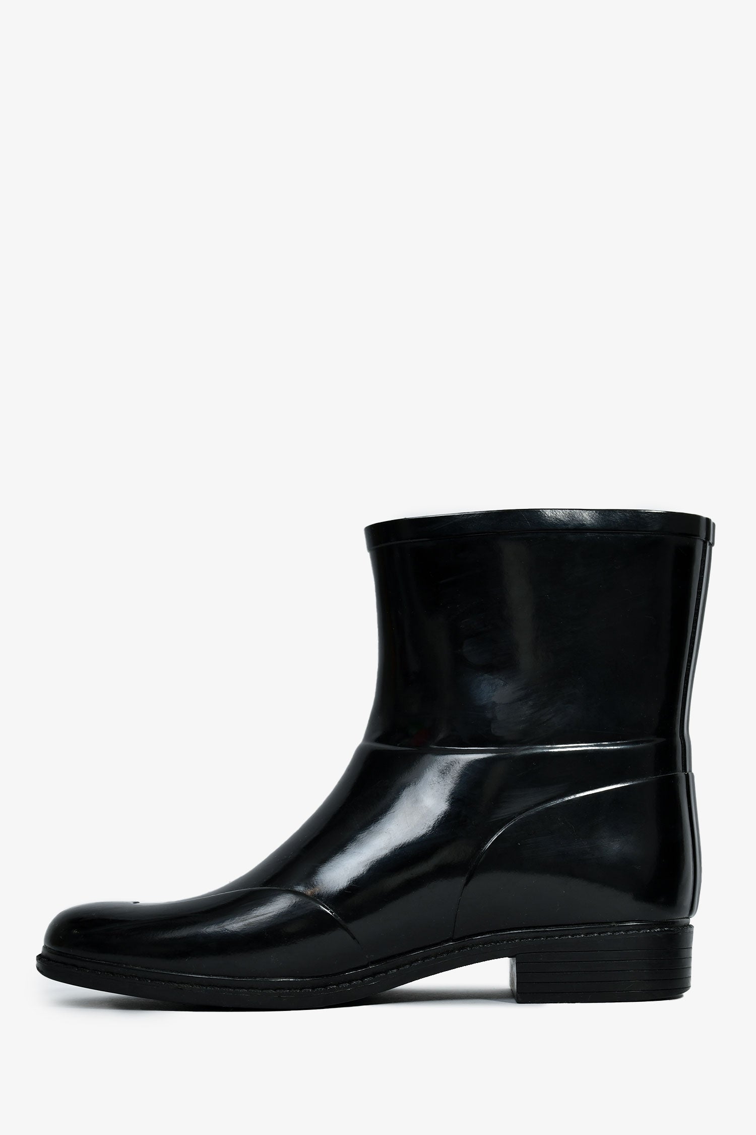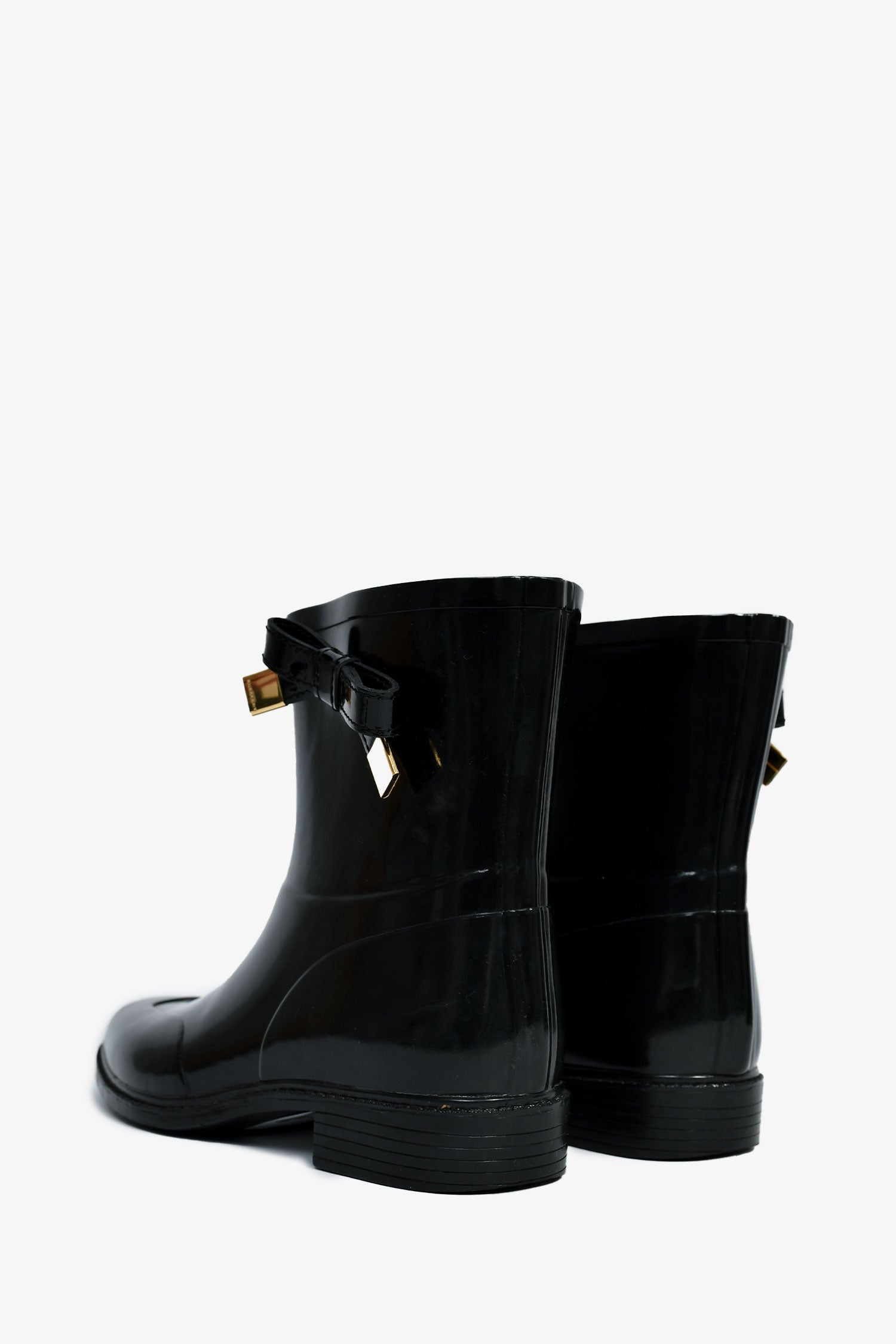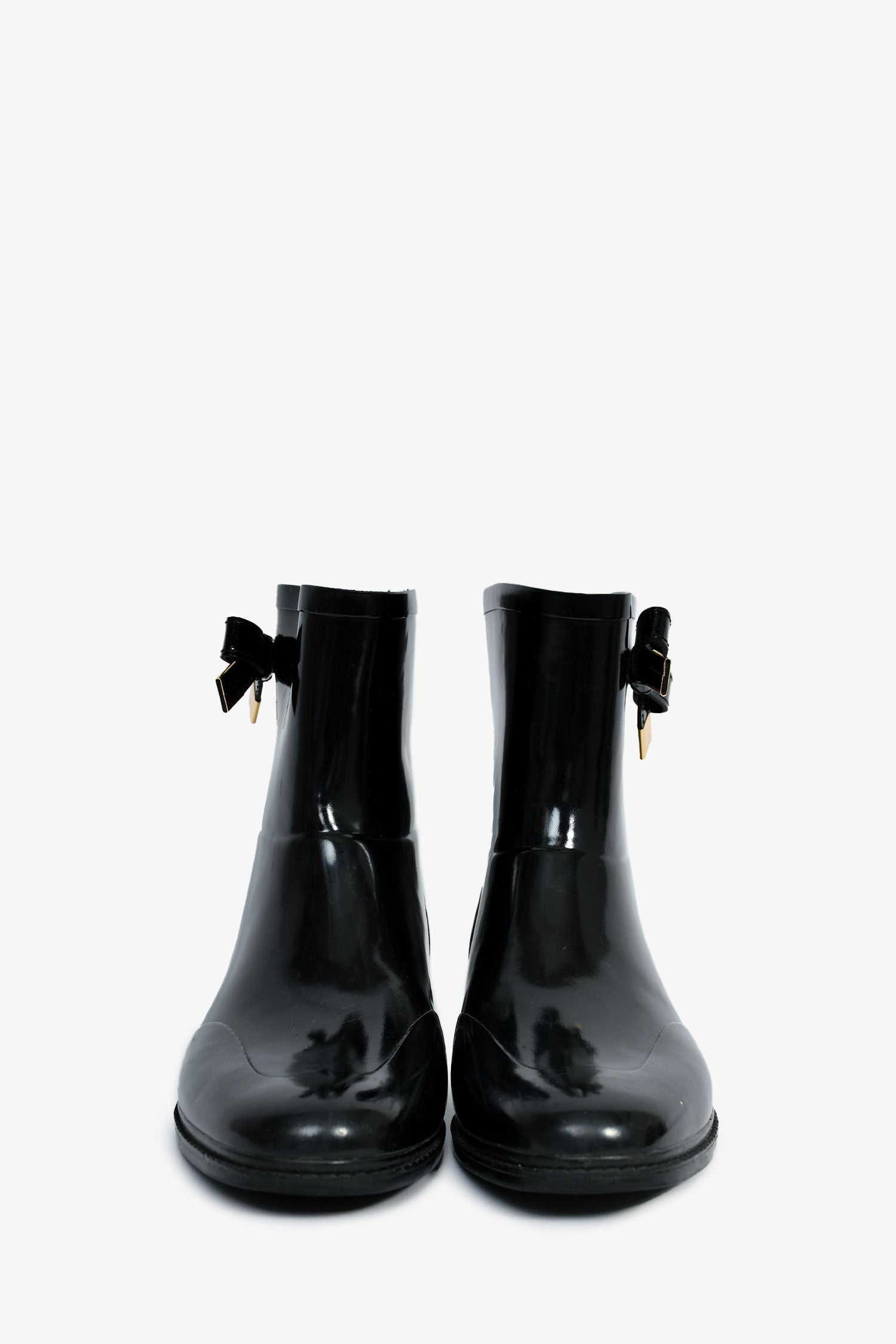 Refresh availabilityBurberry Rubber Bow Detail Ankle Booties. Gold-tone hardware. Round-toe. Slip-on. Leather and wool lined interior. Rubber soles and exterior.