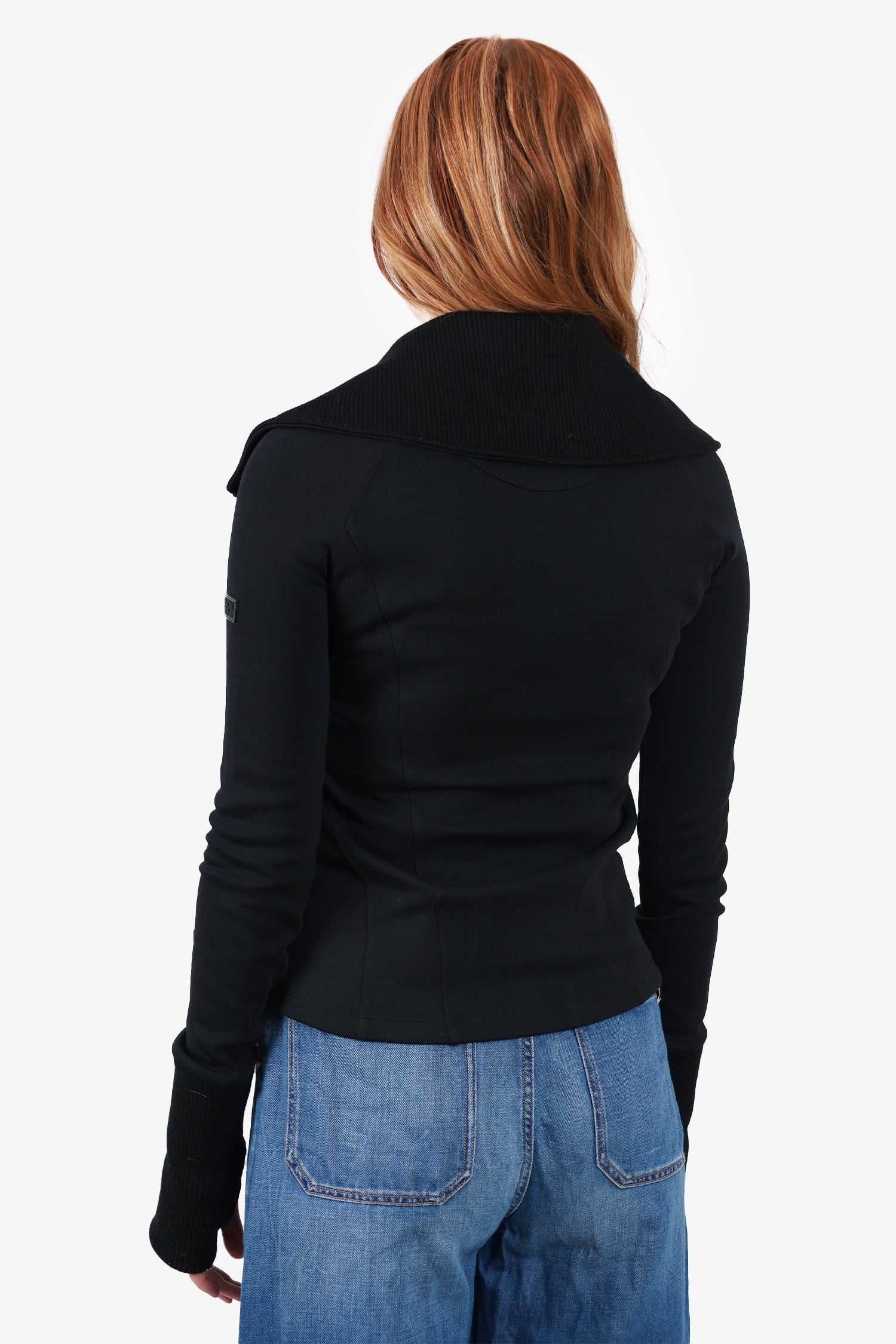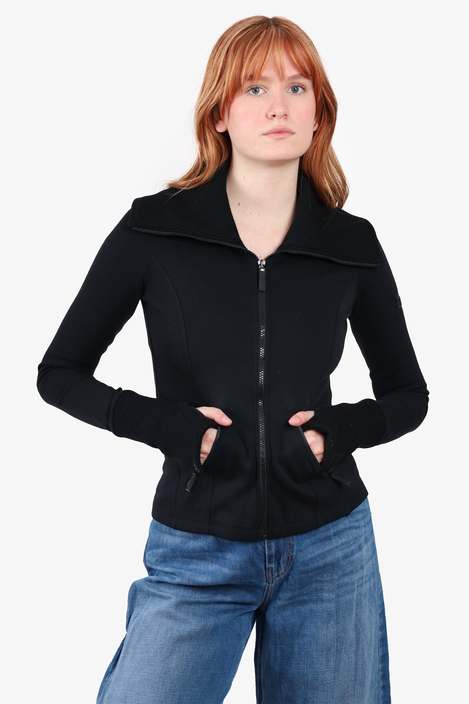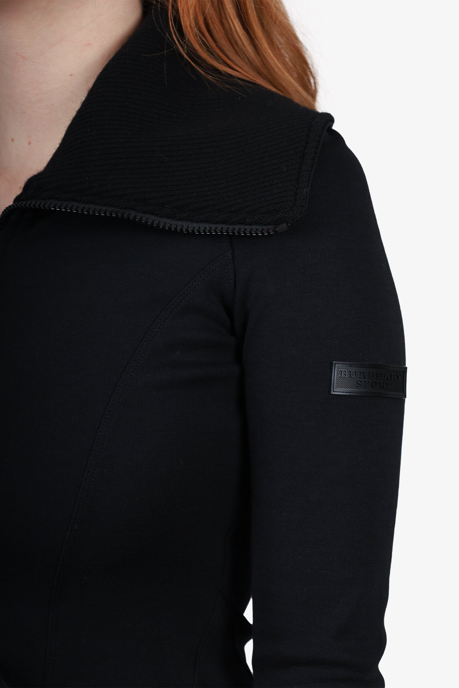Refresh availabilityBurberry Sport Black Zip-up Jacket. High neckline. Front zip-up closure. Ribbed neckline and cuffs. 2 front zip-up pockets. Cuff thumb holes. Lined. Tonal stitching.