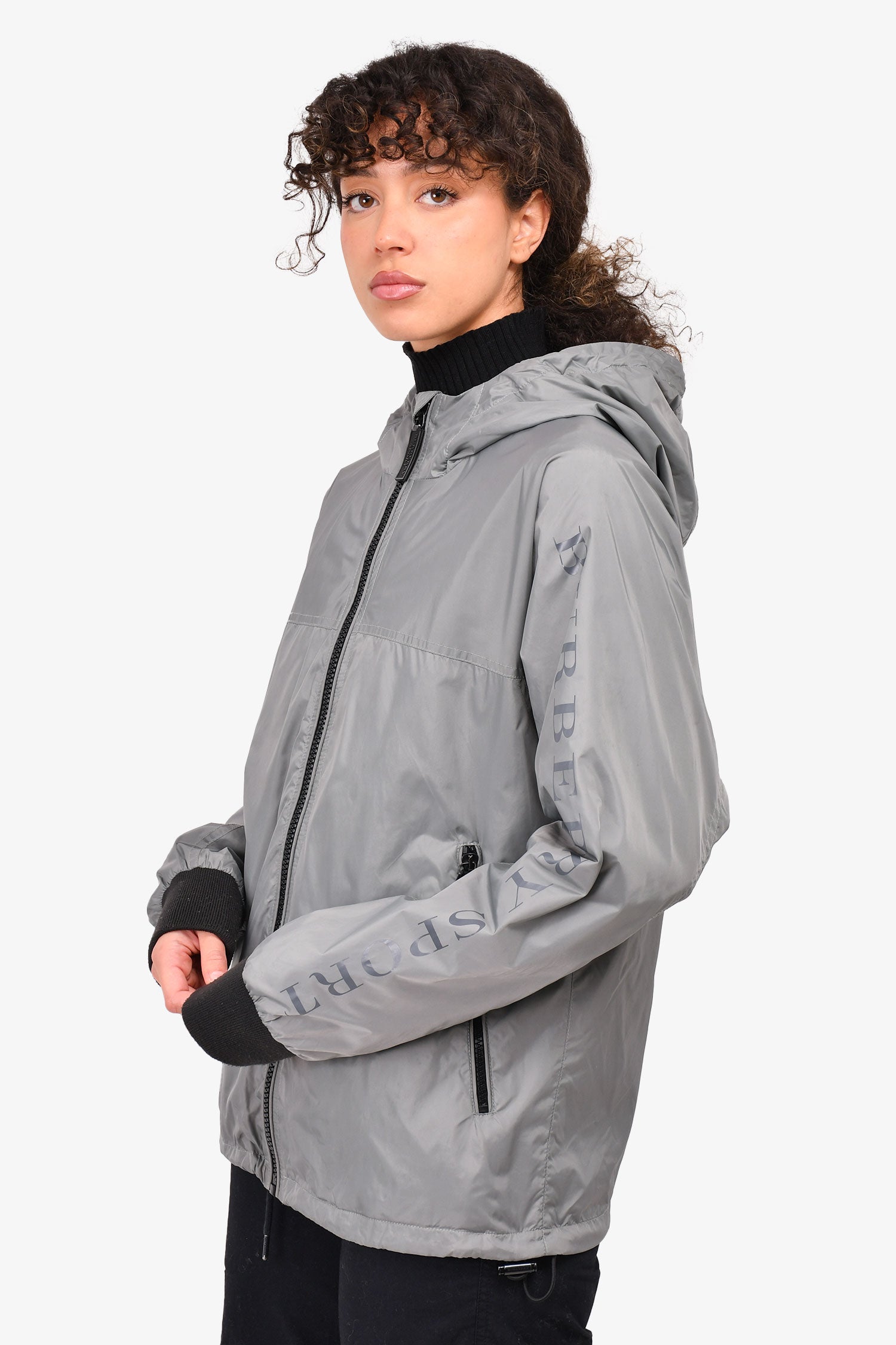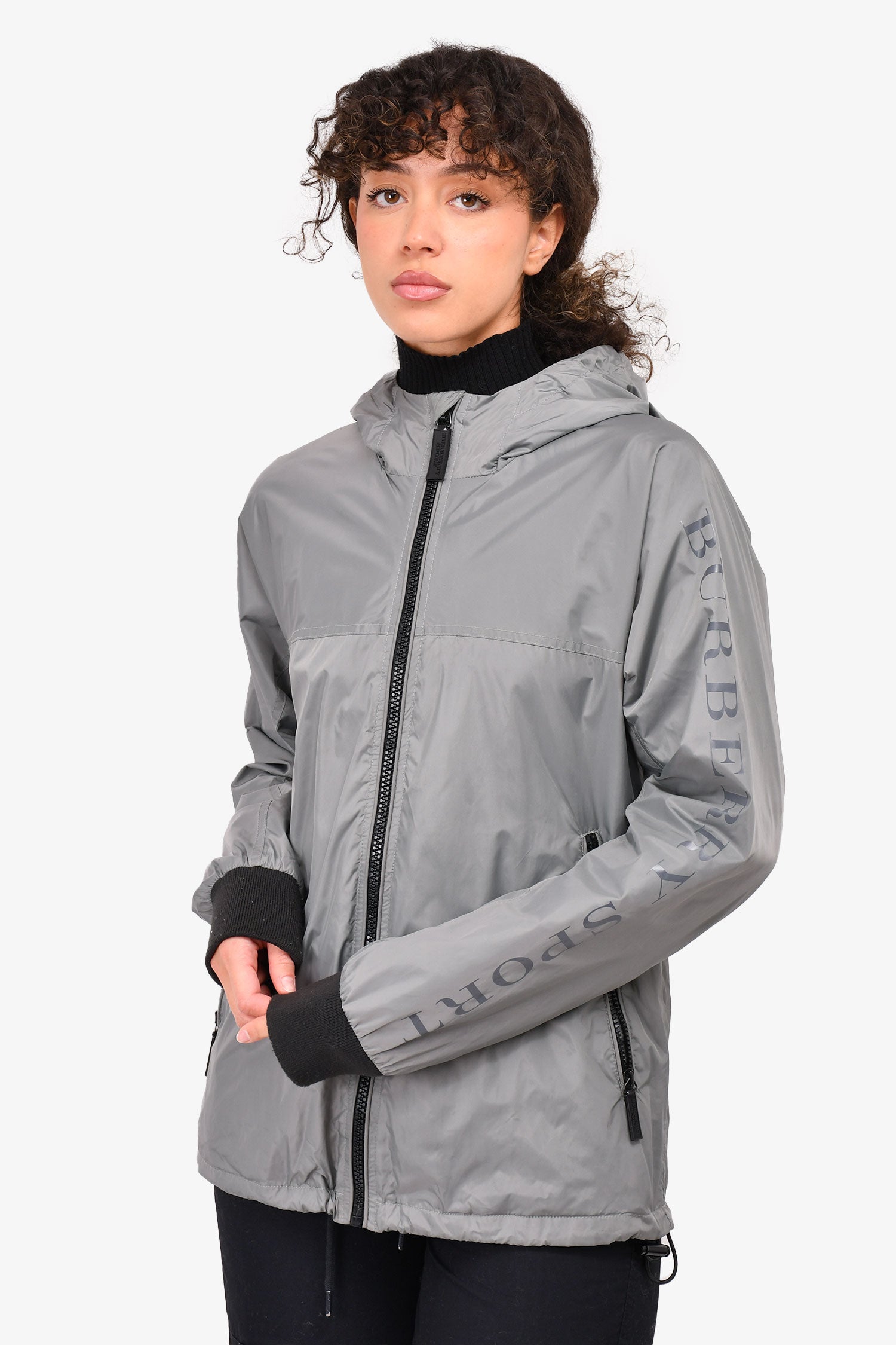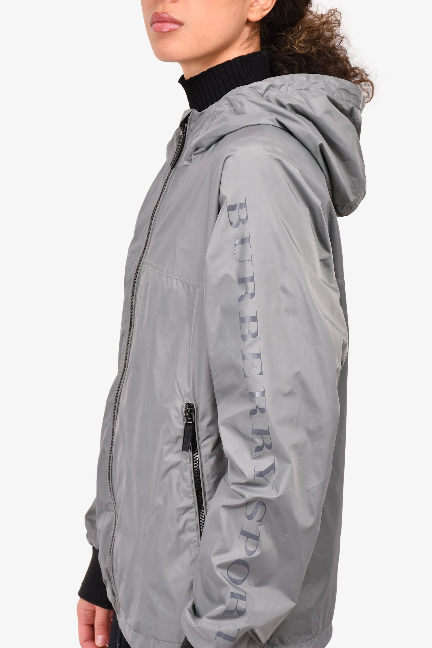 Refresh availabilityBurberry Sport Grey Nylon Logo Sleeve Hooded Windbreaker Jacket. Front zip-up closure. Two front pockets with zipper closures. Adjustable string at the hem. Tonal stitching.