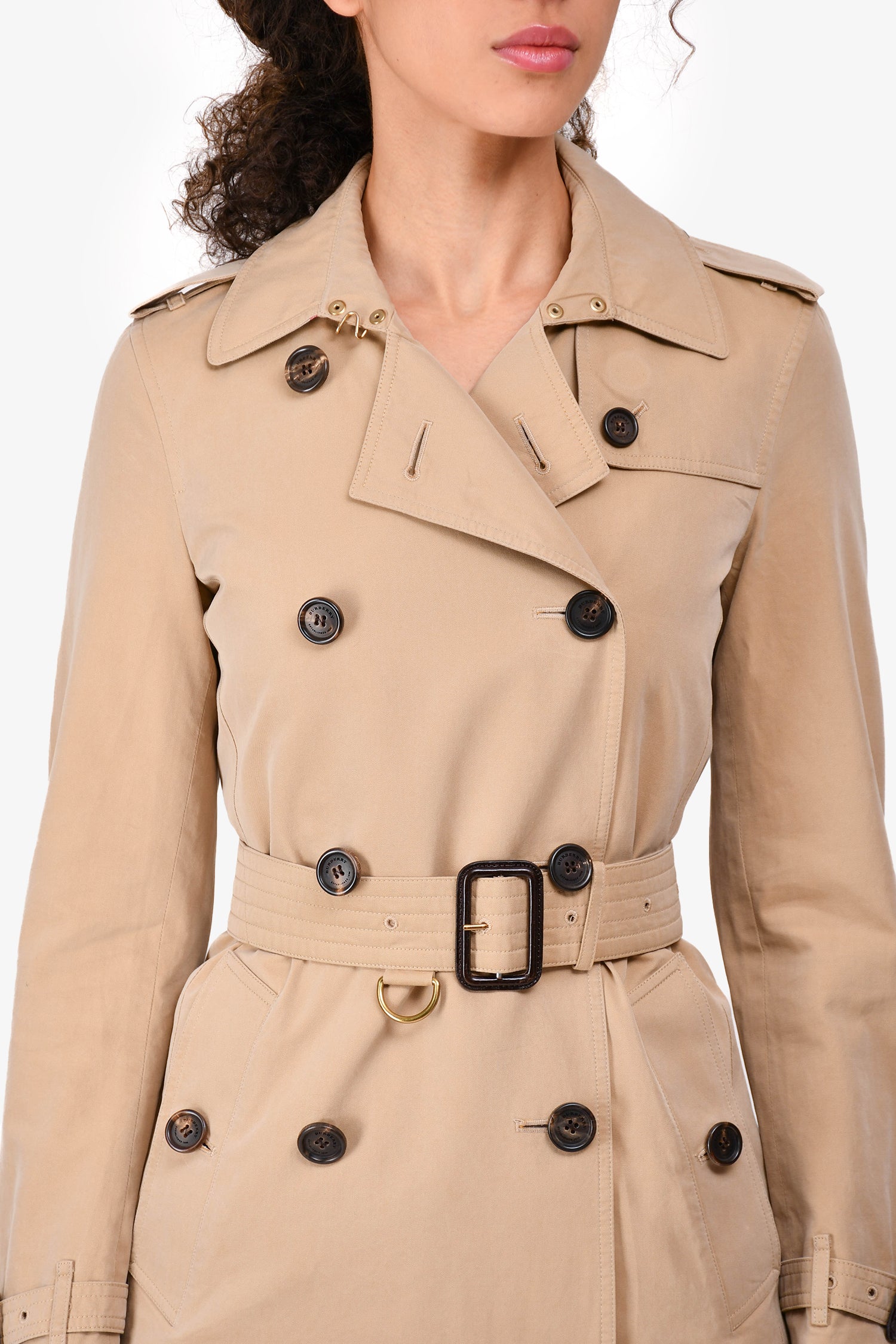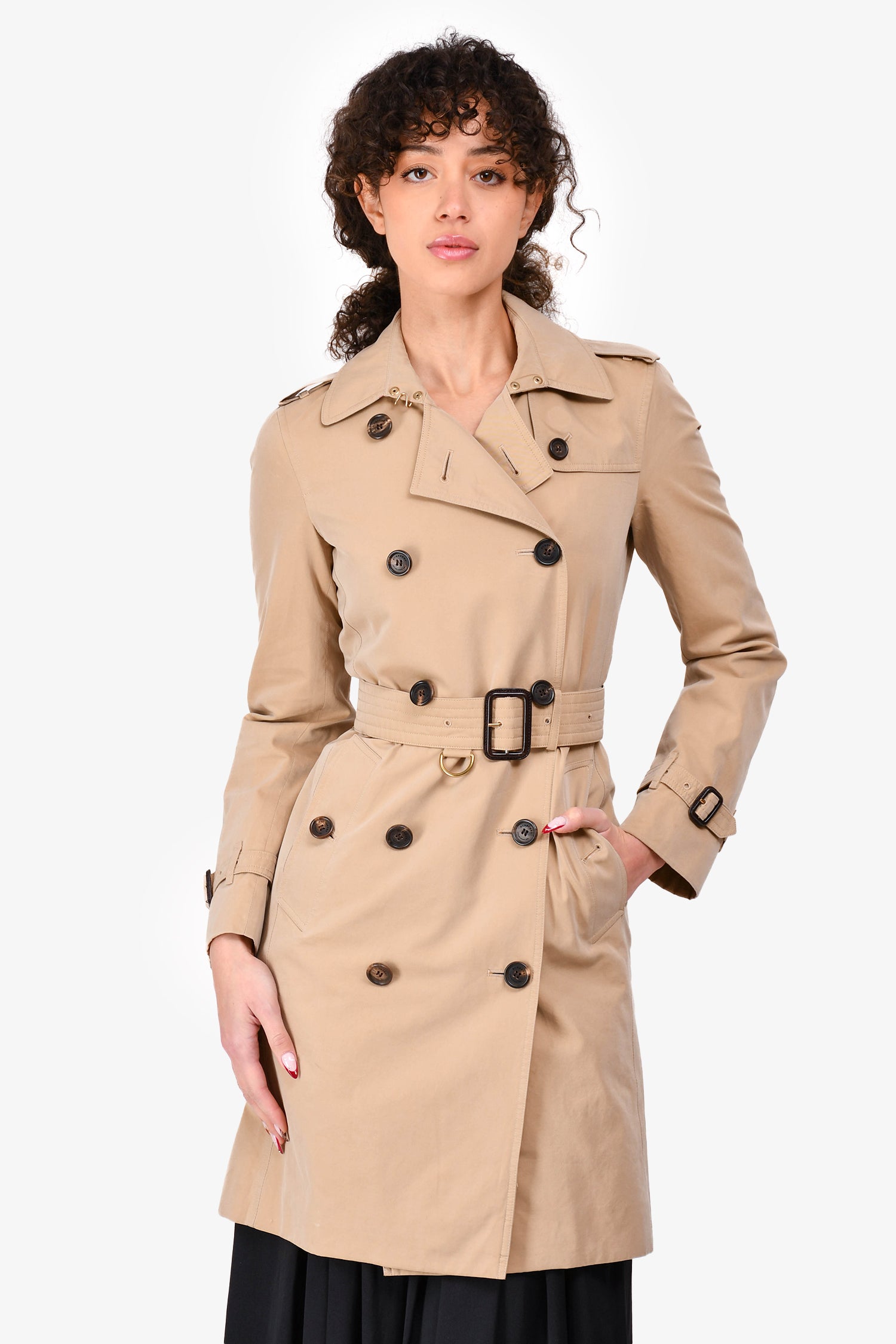 Refresh availabilityBurberry Tan Kensington 'Long' Trench Coat. Front button-up closure. Two front pockets with button closure. Gold-tone hardware. Belt closure. Tonal stitching.