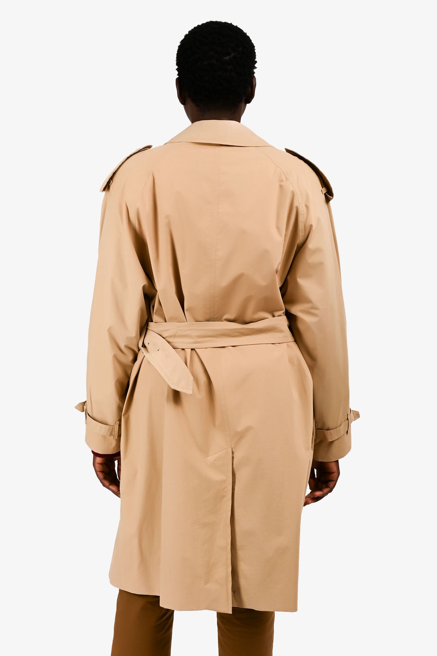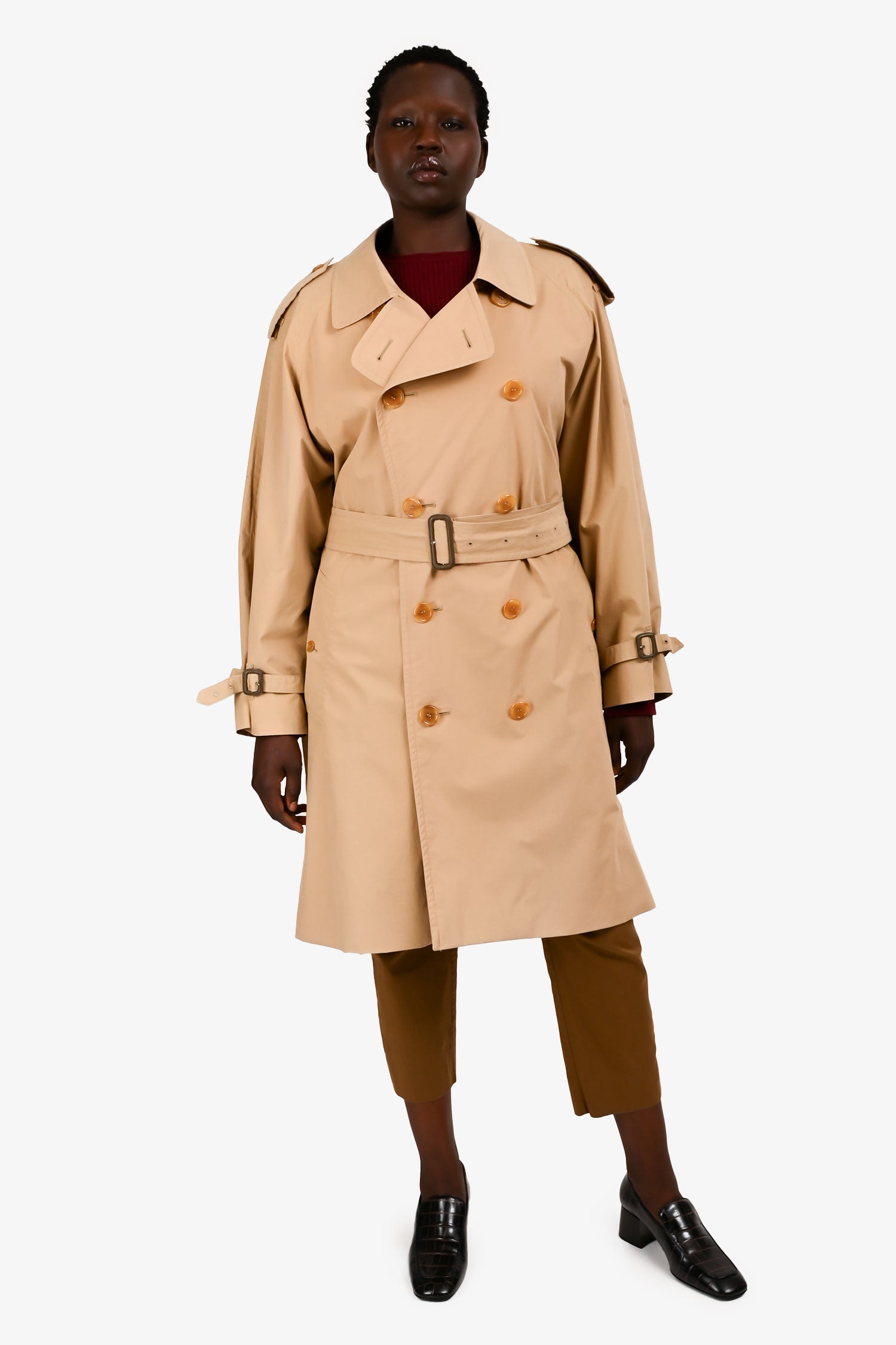 Refresh availabilityBurberry Vintage Beige Double Breasted Trench Coat. Long sleeves with belted cuffs. Double-breasted front button closure. Waist belt. Two front pockets. Fully lined. Tonal stitching.