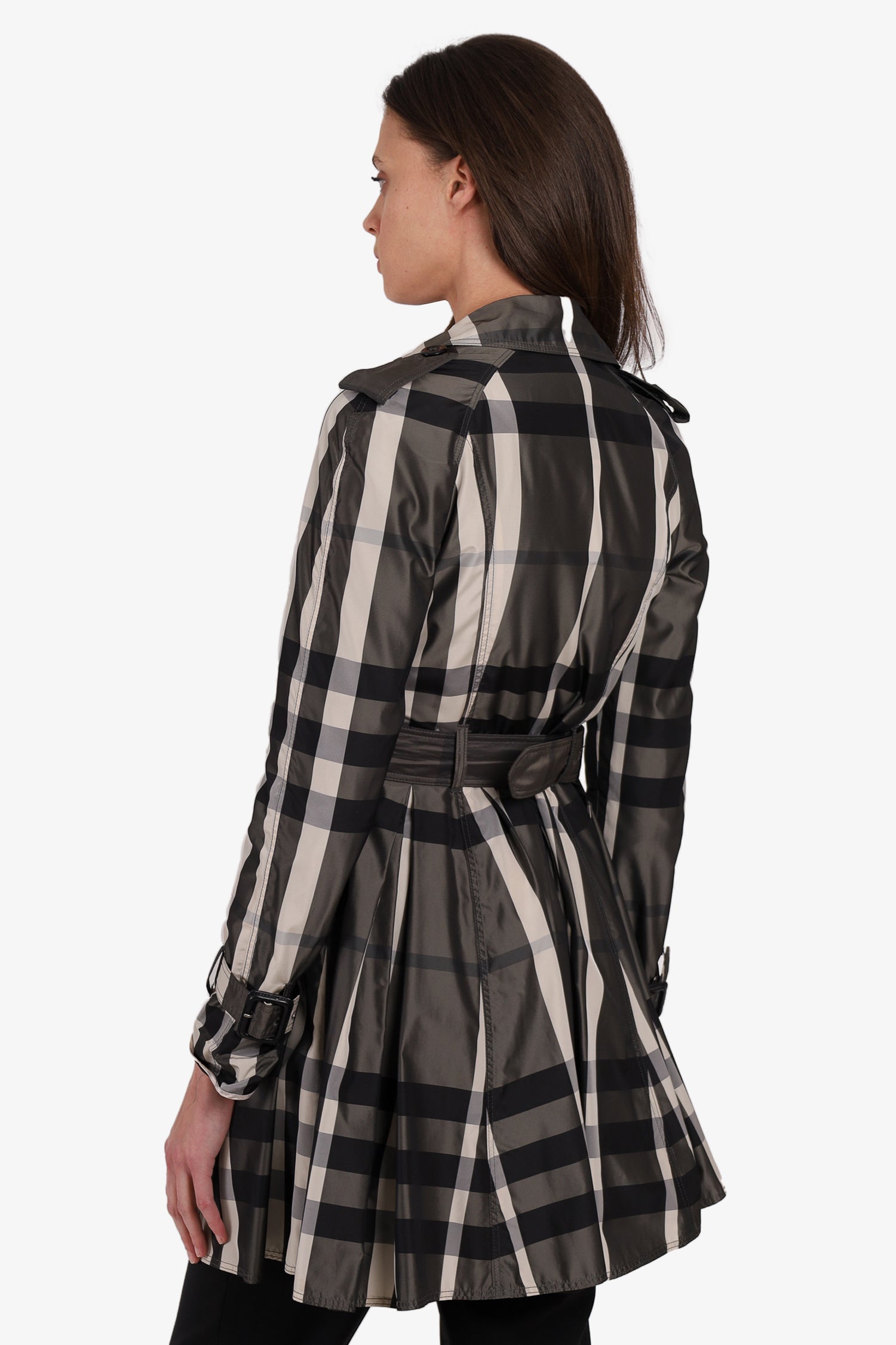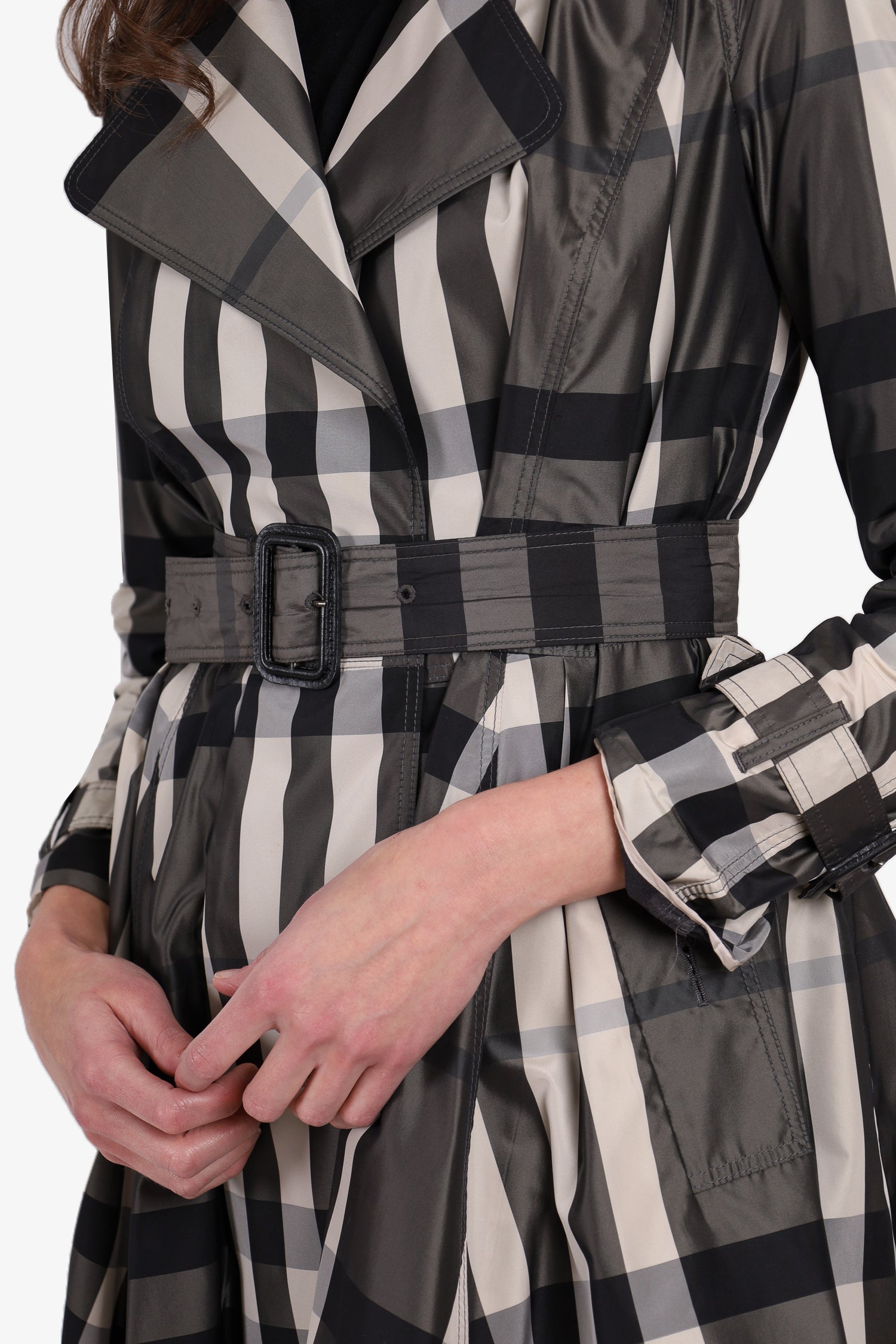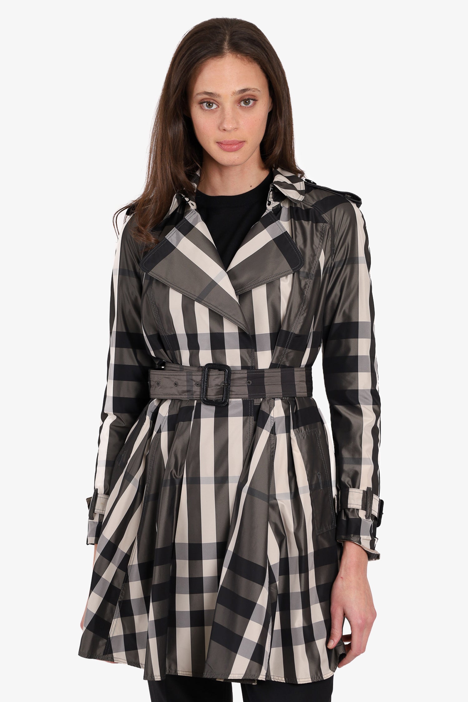 Burberry White/Black Check Nylon Trench Coat with Belt. Front button-up closure. Front button-up pockets. Belt detail on cuffs. Unlined. Tonal stitching.