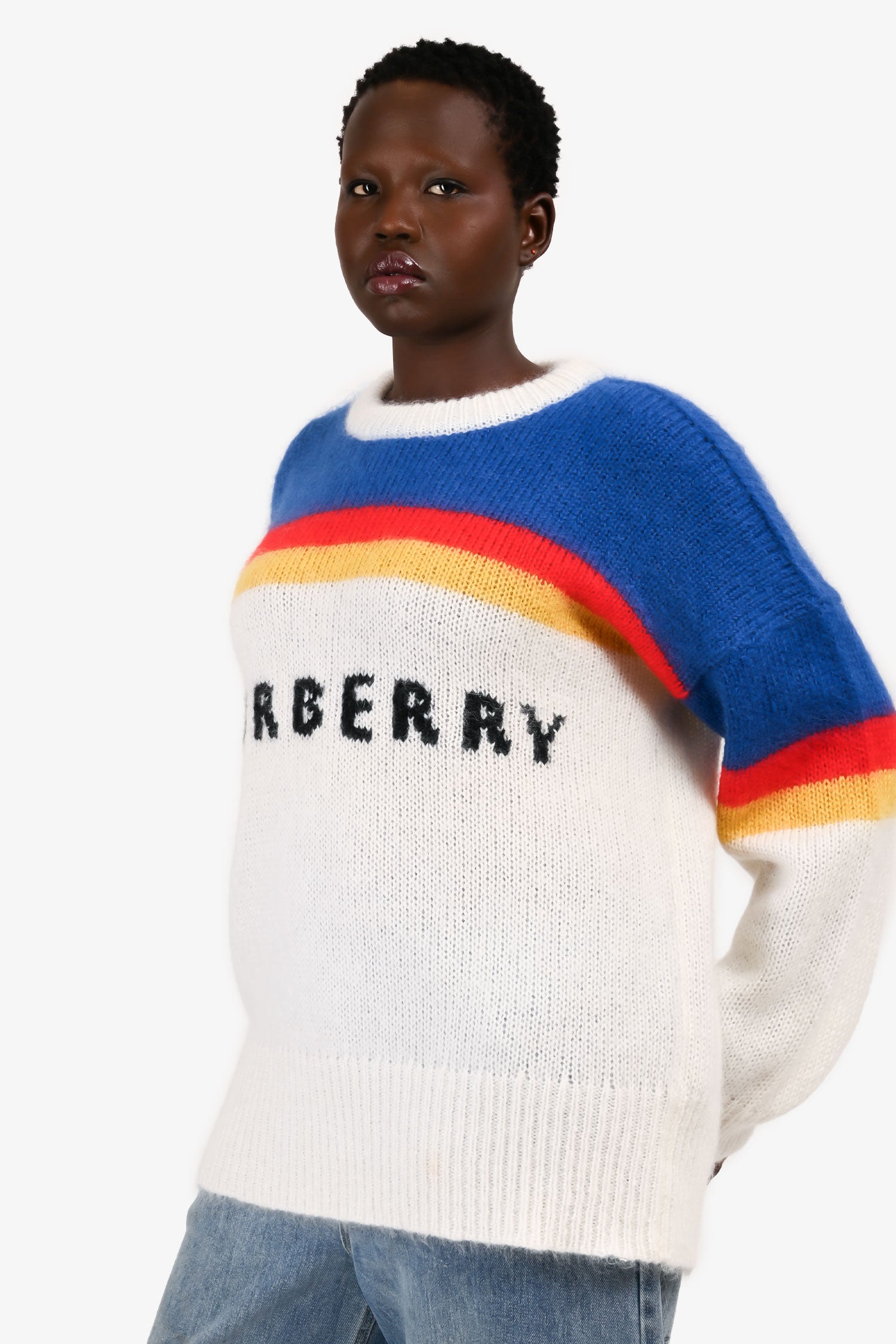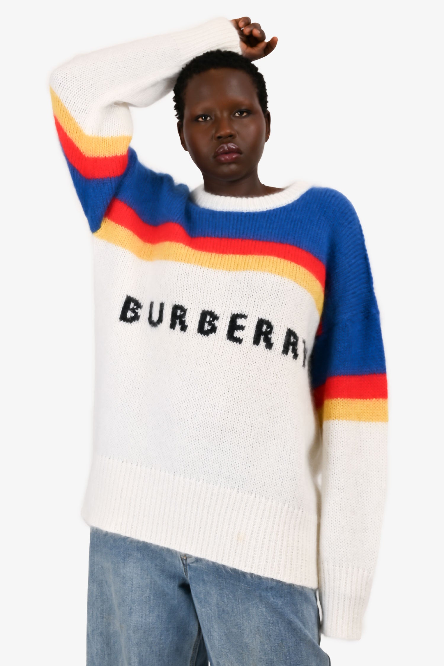 Refresh availabilityBurberry White/Blue Logo Sweater. Pull-on. Round neck. Ribbed neck, cuffs and hem.