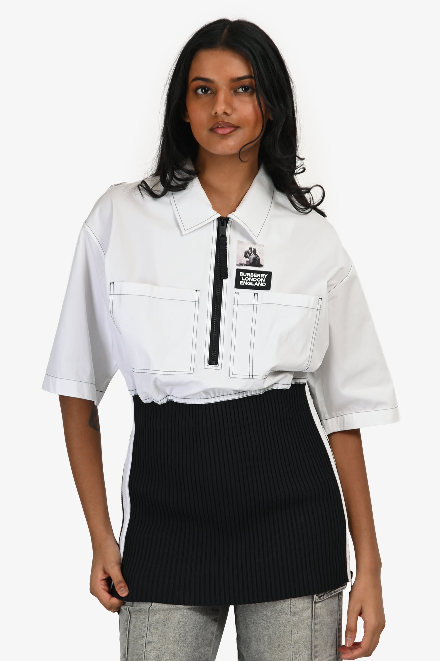 Refresh availabilityBurberry White Cotton Poplin Logo Cinched Waist Top. Slip-on. Pointed collar. Front zip-up closure. Elasticated cinched waist and zip-down details on the sides. 2 exterior slip pockets. Contrast stitching.