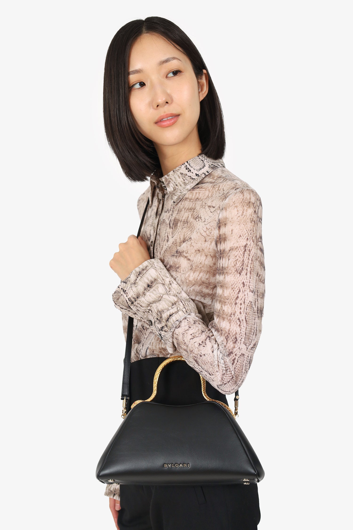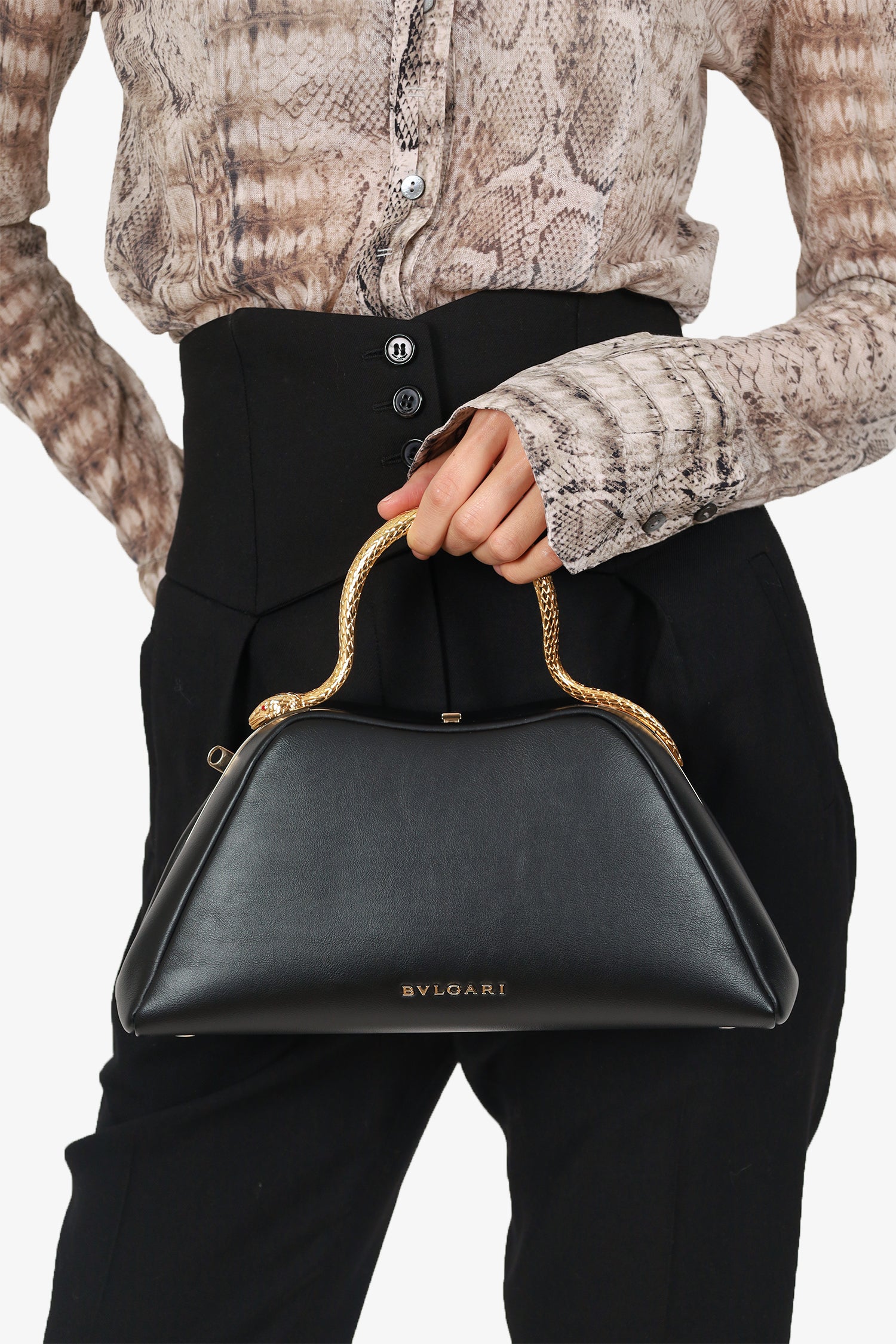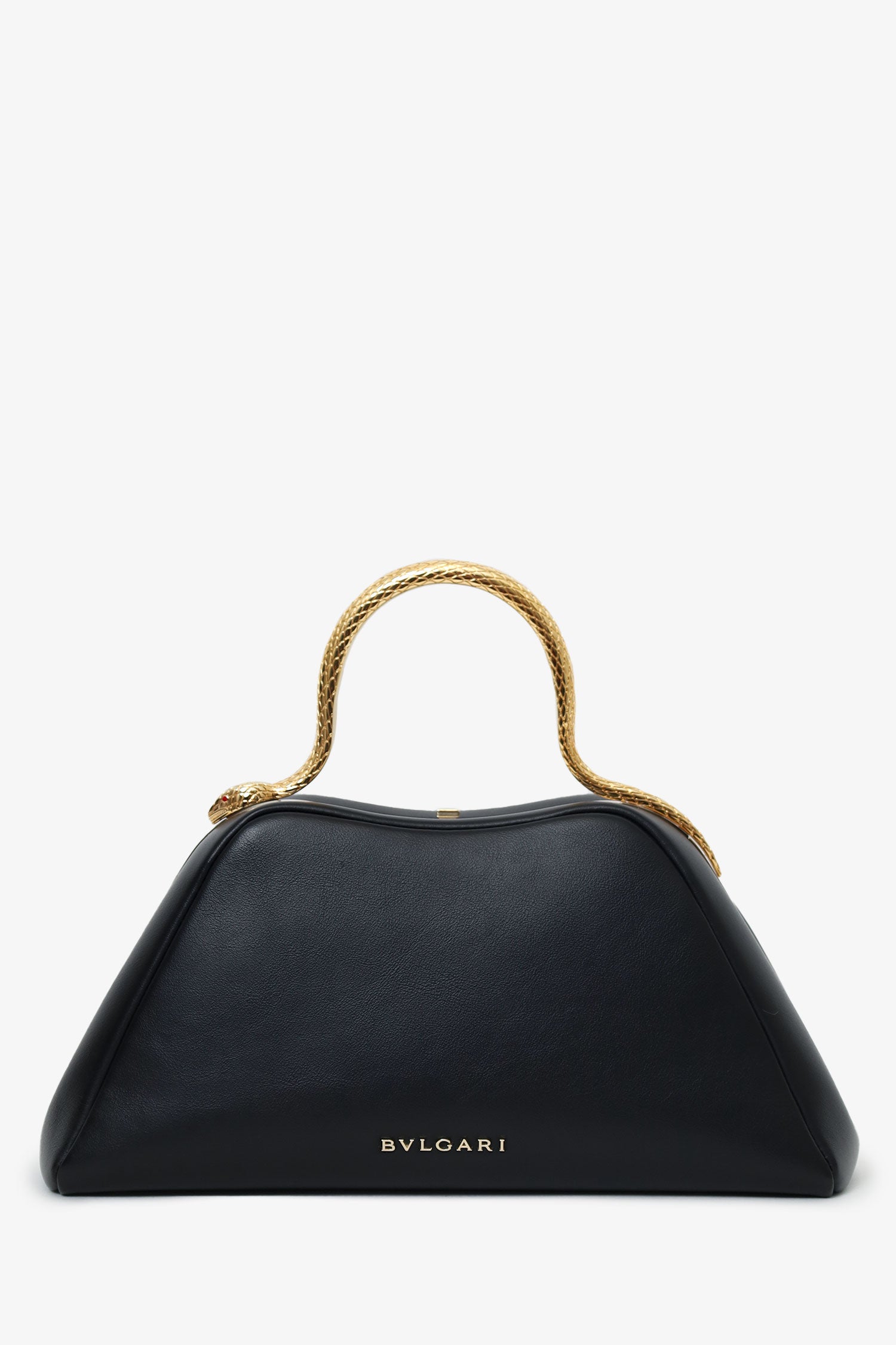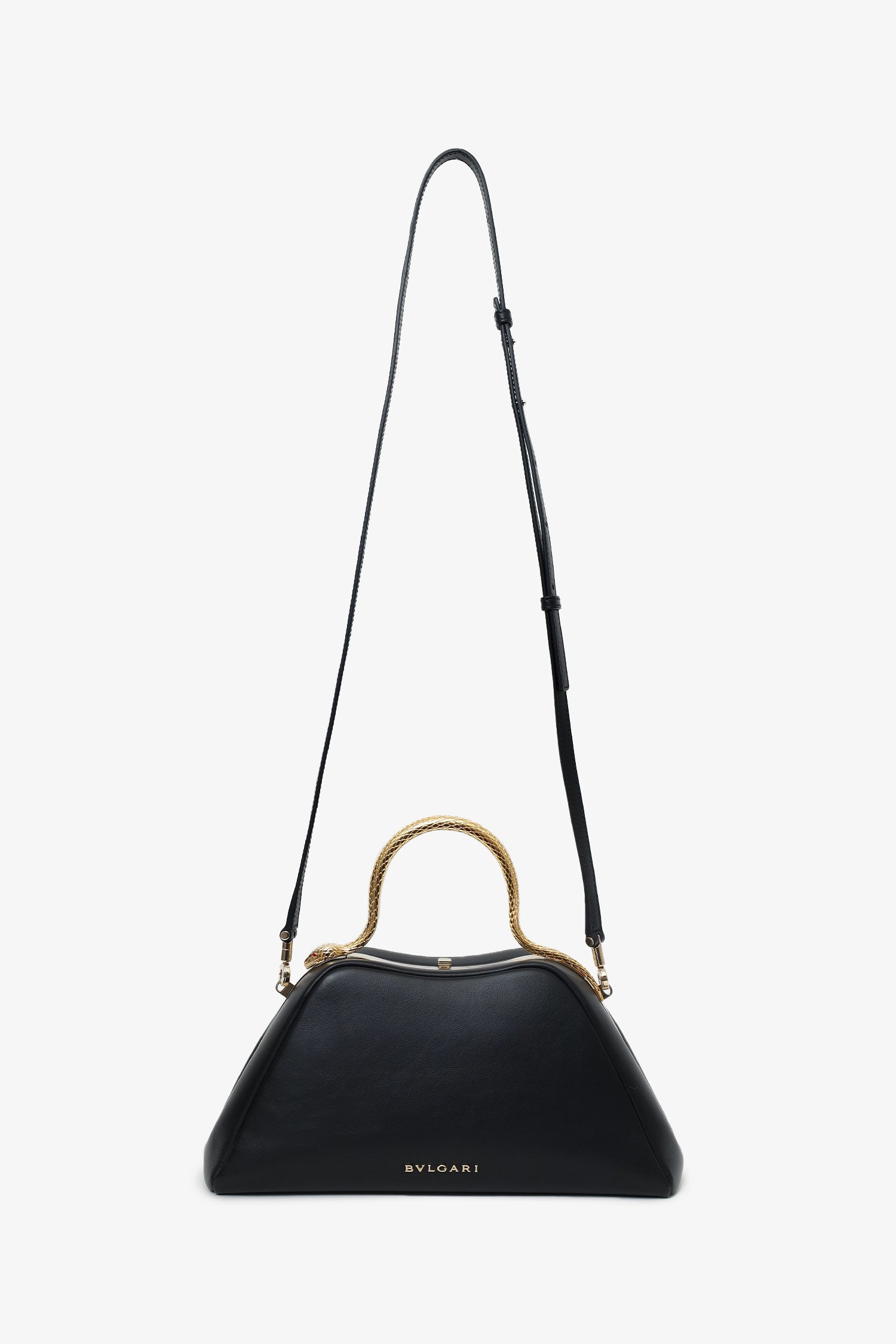 Refresh availabilityBvlgari Black Soft Calfskin Serpentine Top Handle Bag with Strap. Top push-clasp closure. Top handle. Removable and adjustable crossbody strap with clasp closure. Protective base studs. Single interior slip pocket. Gold-tone hardware. Tonal stitching.